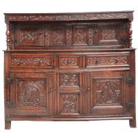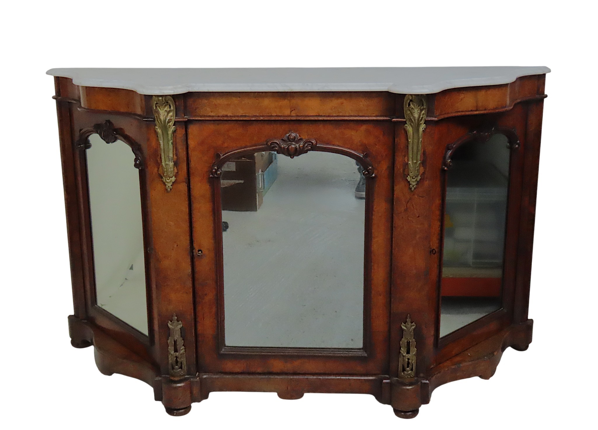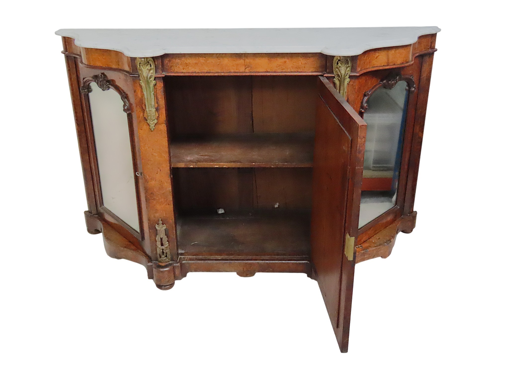 Good overall appearance. The marble slab is in good condition with typical surface scratches and miniscule chipped losses to the rear edge. The three mirrored door panels are in good order. The top two gilt metal mounts appear to be later additions with the shadows of previous mounts also visible. No visible worm damage. The credenza has typical domestic wear throughout including surface marks, scratches and some chipped losses to the beading.