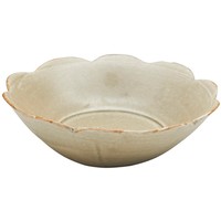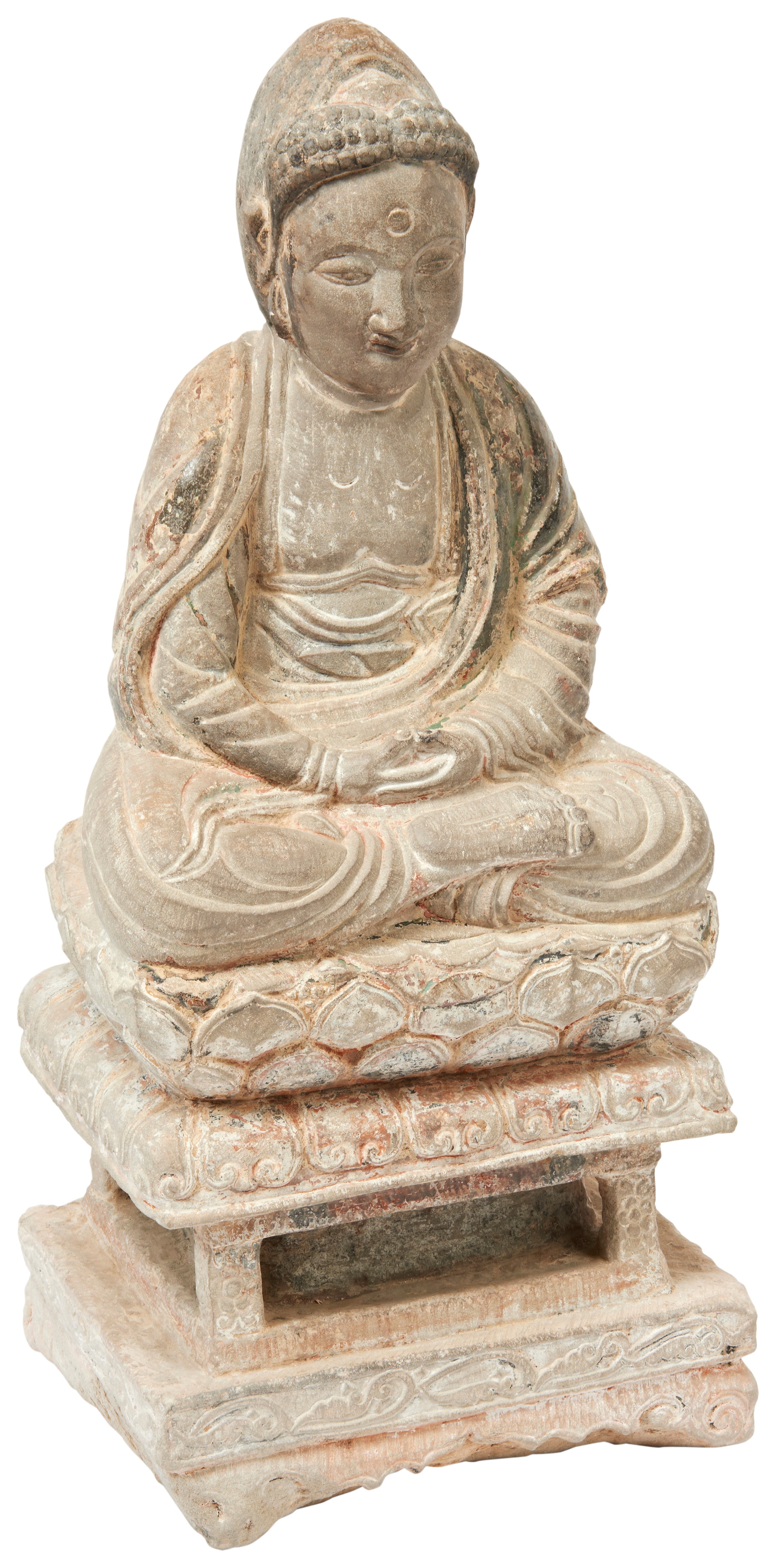 shown wearing long flowing robe open at the chest, seated on a lotus throne, traces of old paint
