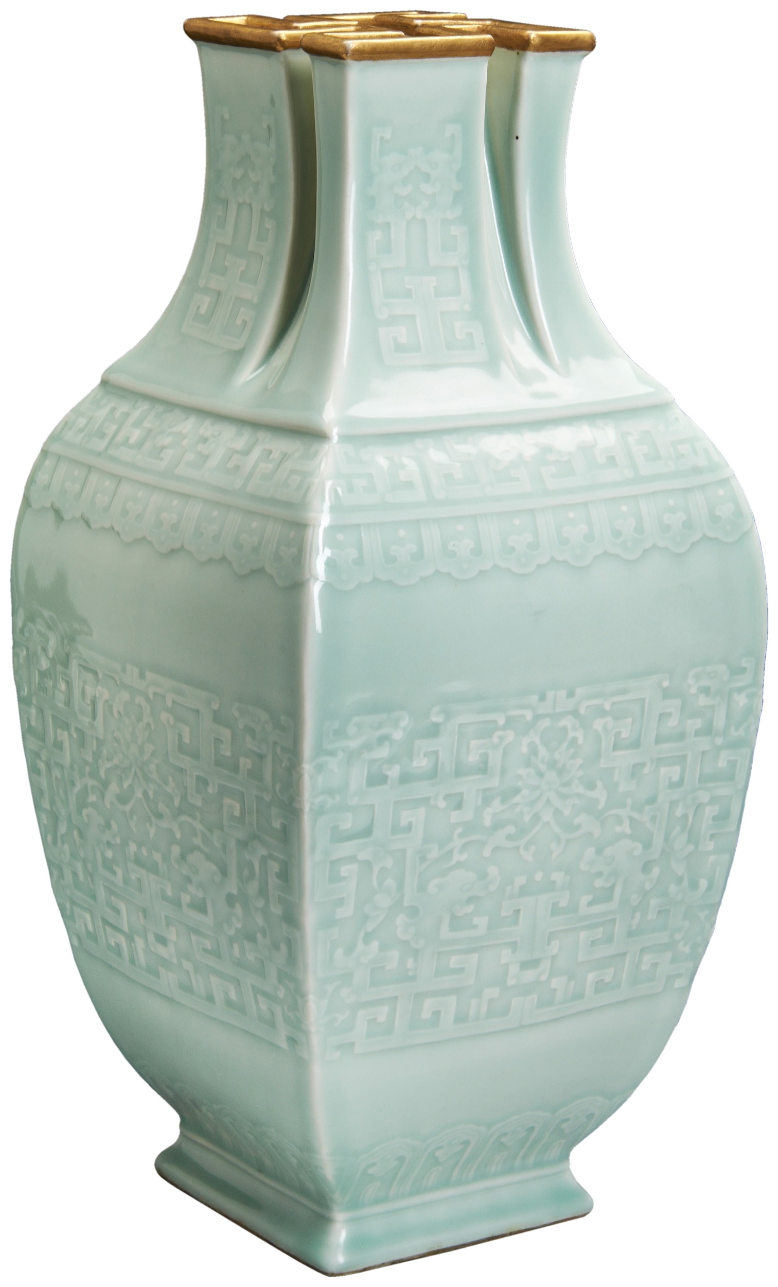 the square-sectioned baluster-form vase rising from a low spreading foot to a generous midsection, the angular waisted neck with forming a rim modelled as a gilt-enriched wan-character, the sides finely moulded with an intricate central frieze of angular 'kuilong' scrollwork intertwined with meandering lotus all between lappet bands, the shoulder and neck with further 'kuilong' scrollwork, the base with an impressed six-character Qianlong seal mark, covered overall with a pale-green glaze thinning at the extremities