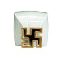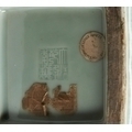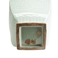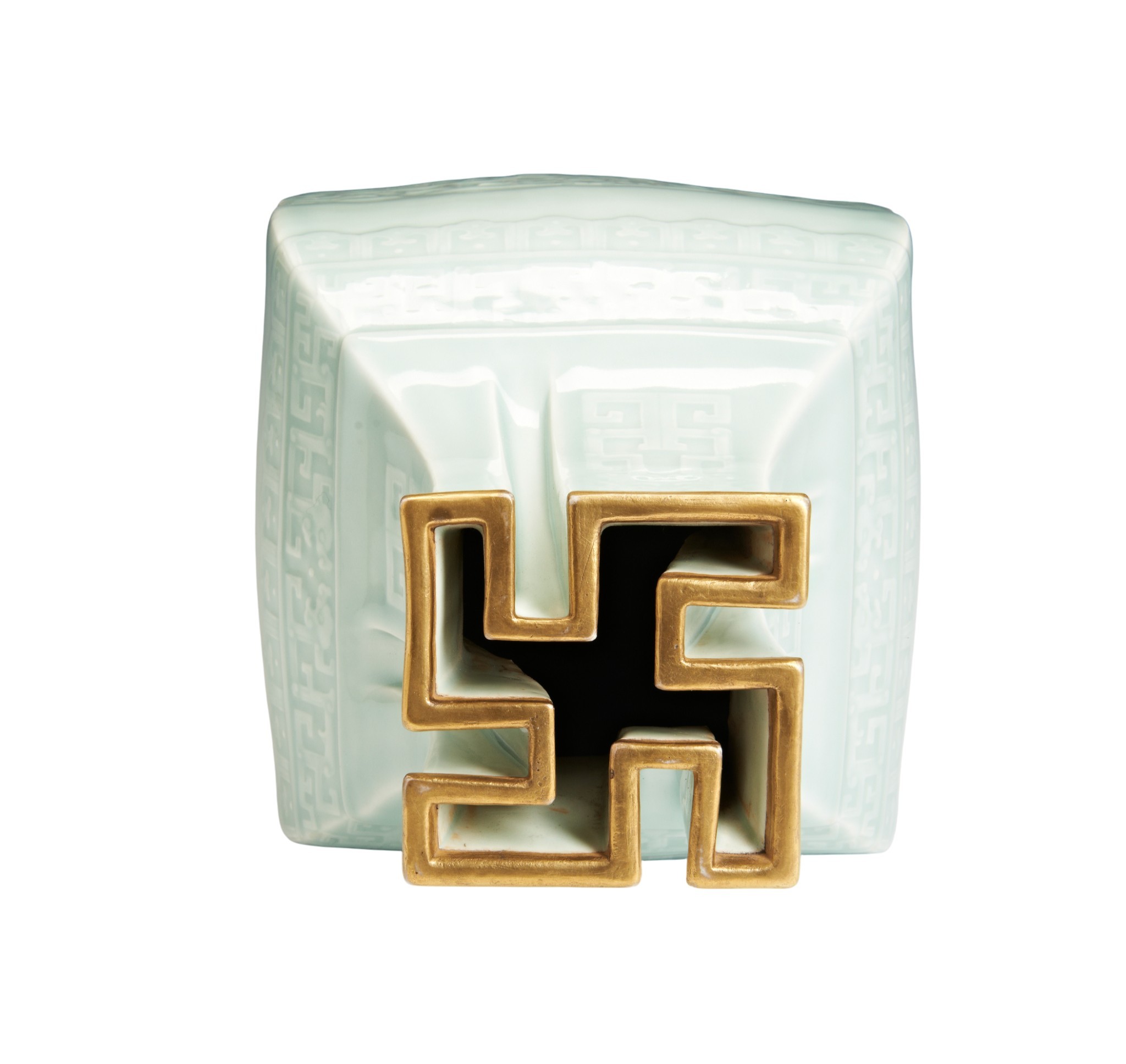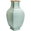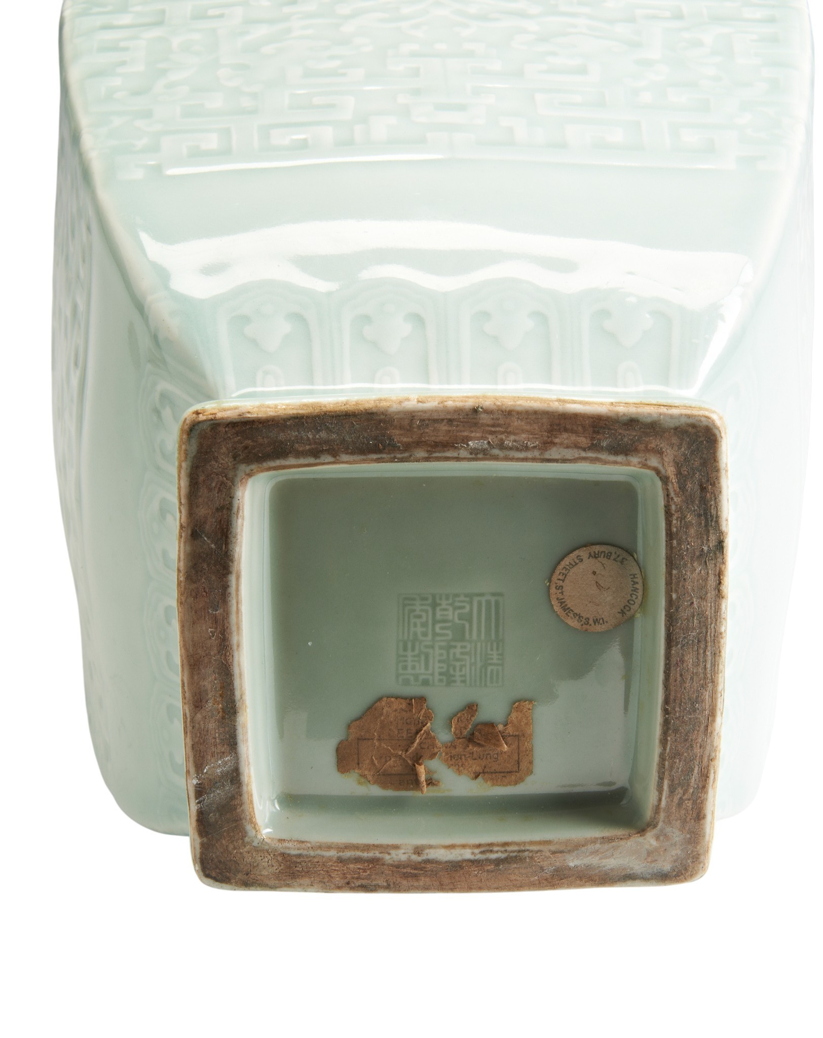 To date, another example of this technically difficult form has not been located. Other Qianlong mark and period celadon-glazed vases decorated with carved or molded archaistic kui-dragon scrolls are known, but none with this highly unusual wan-shaped or swastika-form mouth. Wan translates as "10,000", signifying unlimited abundance or longevity, an auspicious motif, particularly suitable for a birthday celebration or similar important event. For an elaborate celadon-glazed vase with swastika-ornamented ribbons at the shoulders, with Qianlong seal mark in relief, see "Qing Imperial Monochromes the Zande Lou Collection", Shenzhen, 2005, pp. 120-121, no 43.