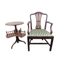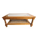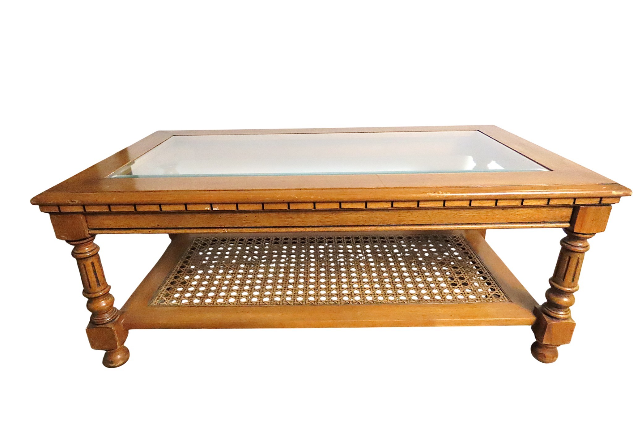 two tier rectangular form, raised on turned fluted supports united by a cane inset undershelf