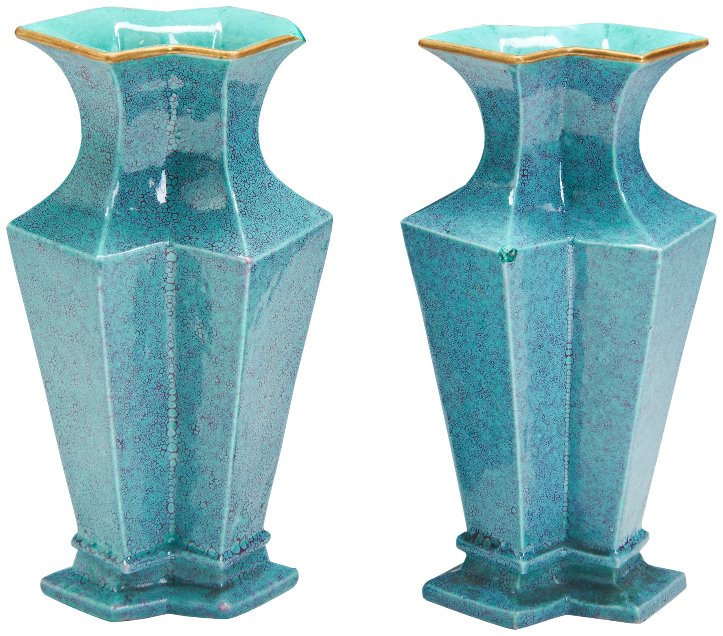 the conjoined rhombus form vases, covered all over in a rich mottled glaze ranging from pale blue through turquoise to purple