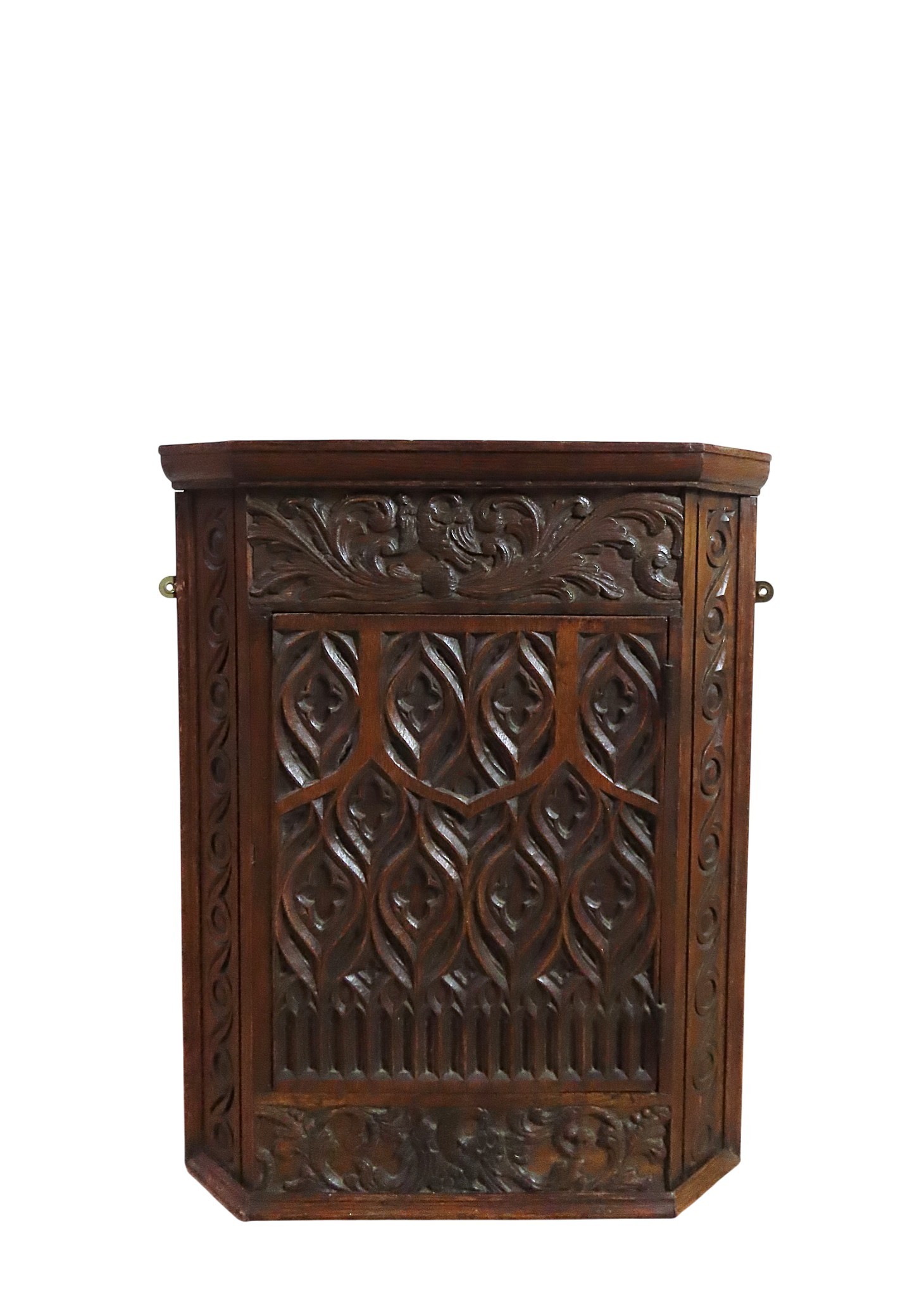 in the Gothic revival taste, with carved scroll foliate and quatrefoil decoration