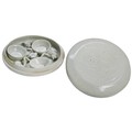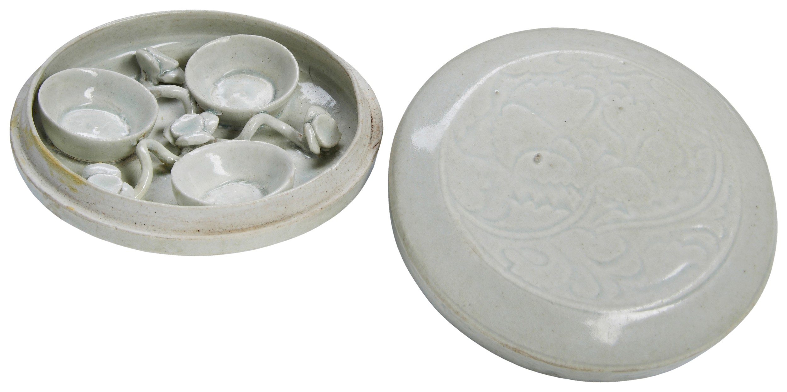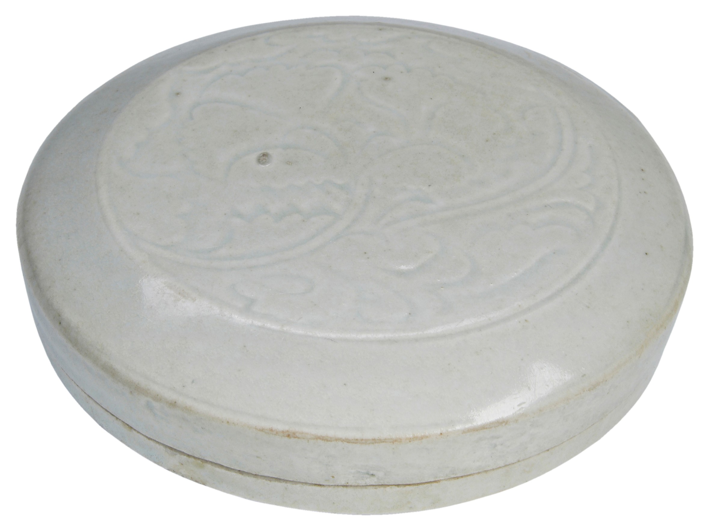 the circular box with cover crisply moulded with a large blooming peony with scrolling foliage, the interior fitted with three small circular compartments, each linked by delicately moulded floral sprays and leafy tendrils, all covered in a bluish white glaze, the glaze stopping neatly above the foot to expose the fine white porcelain body