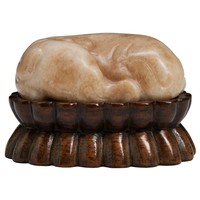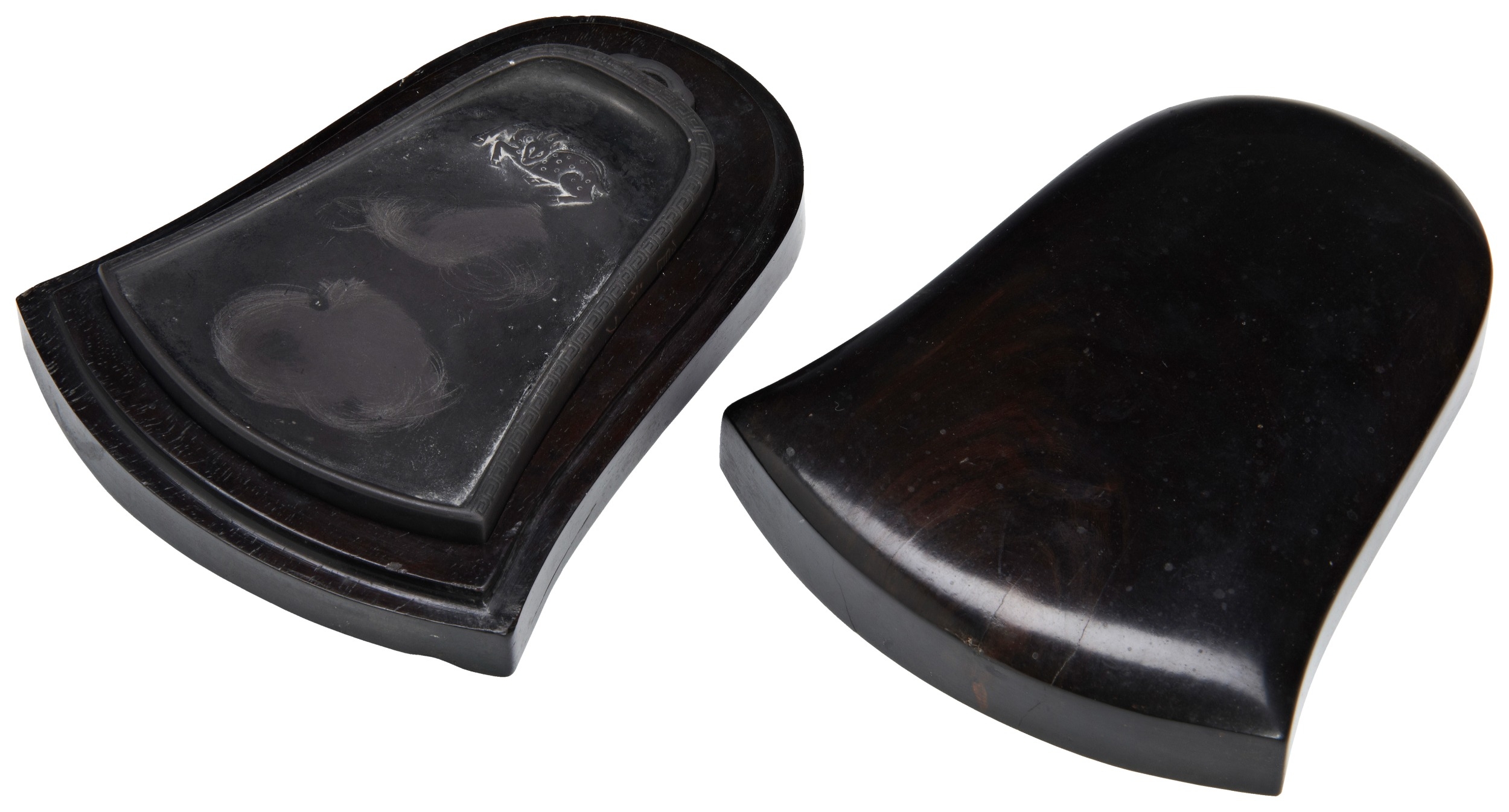 A CARVED INKSTONE IN BELL SHAPE WITH ZITIAN BOX AND COVER