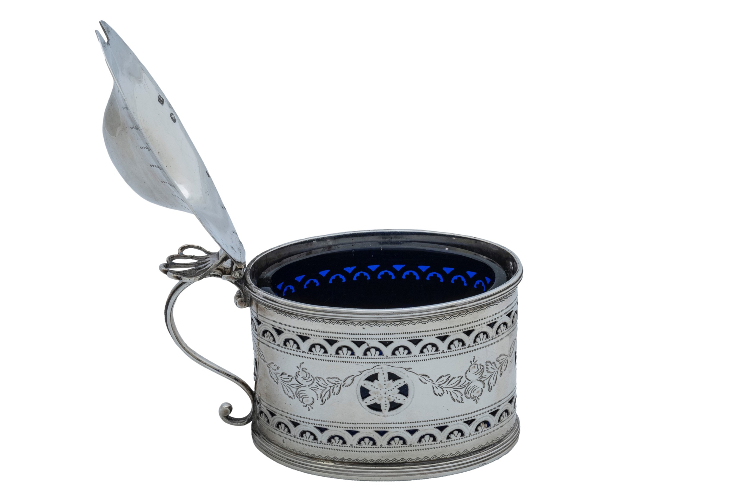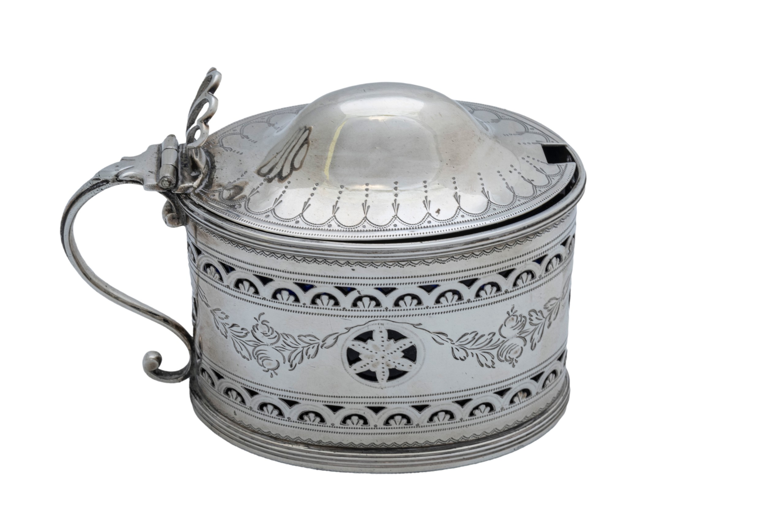 The hinged cover is a little loose, with some lateral movement. The body of the mustard pot is in good condition, no indentations, the overall shape is good.