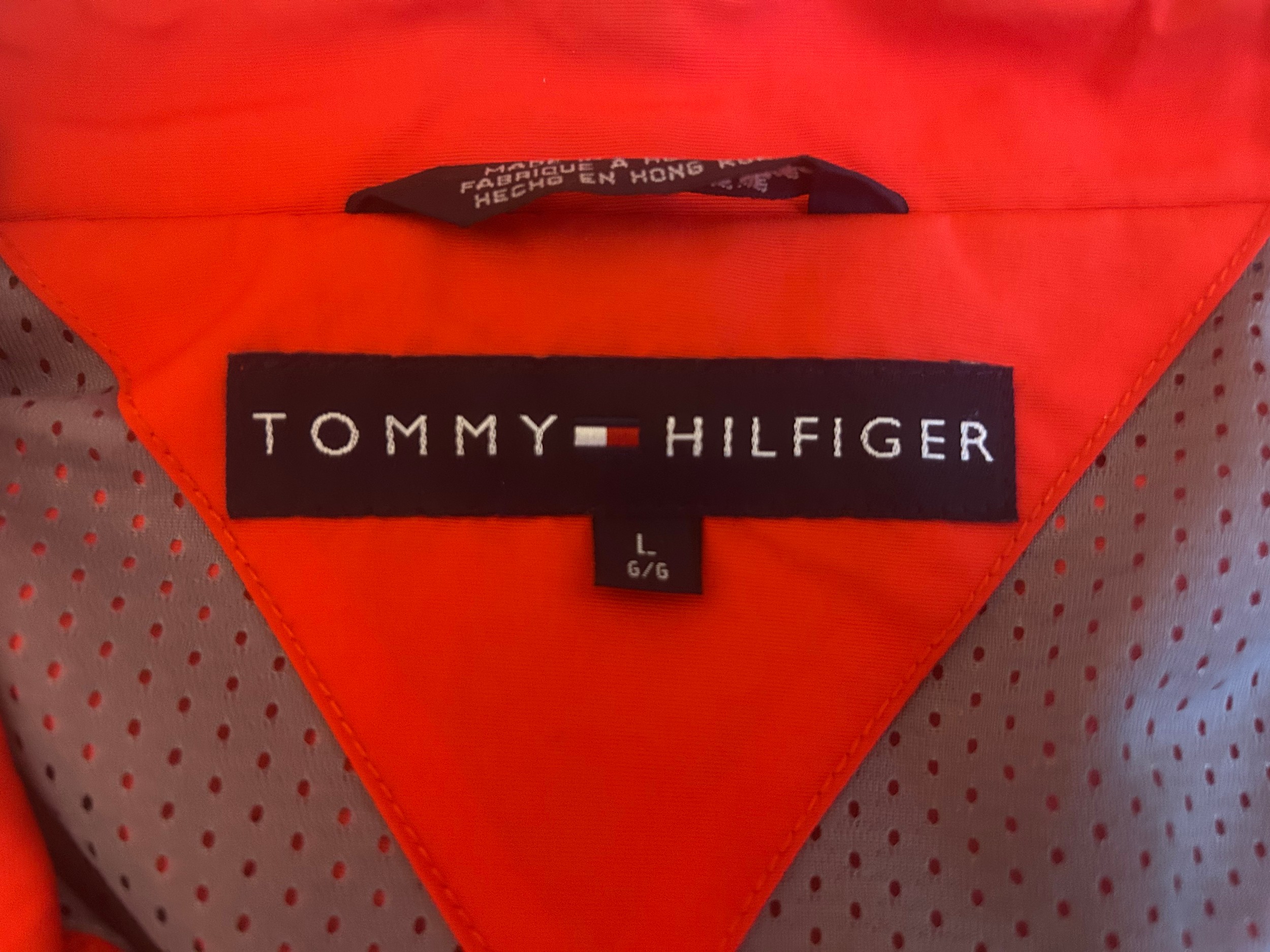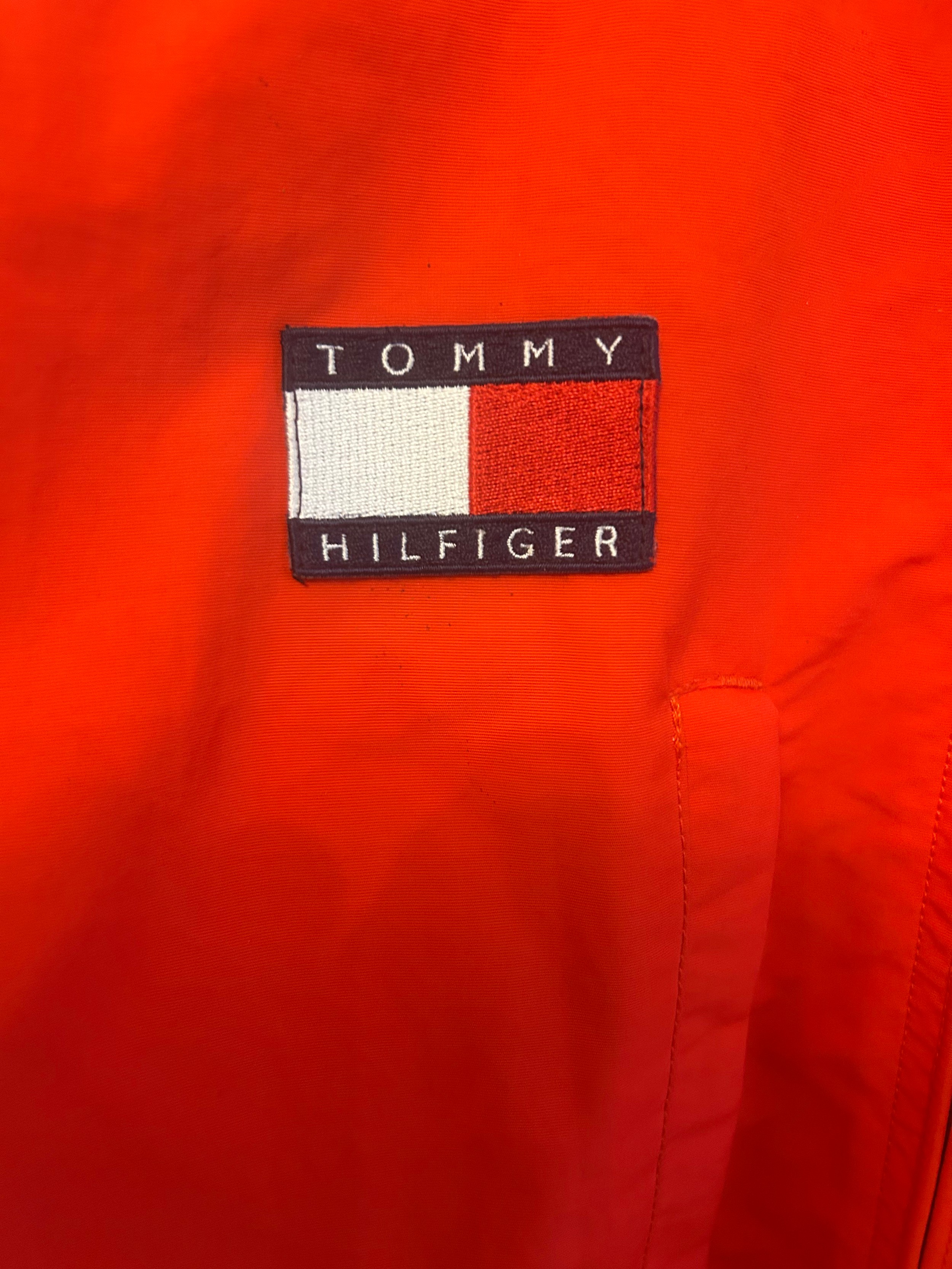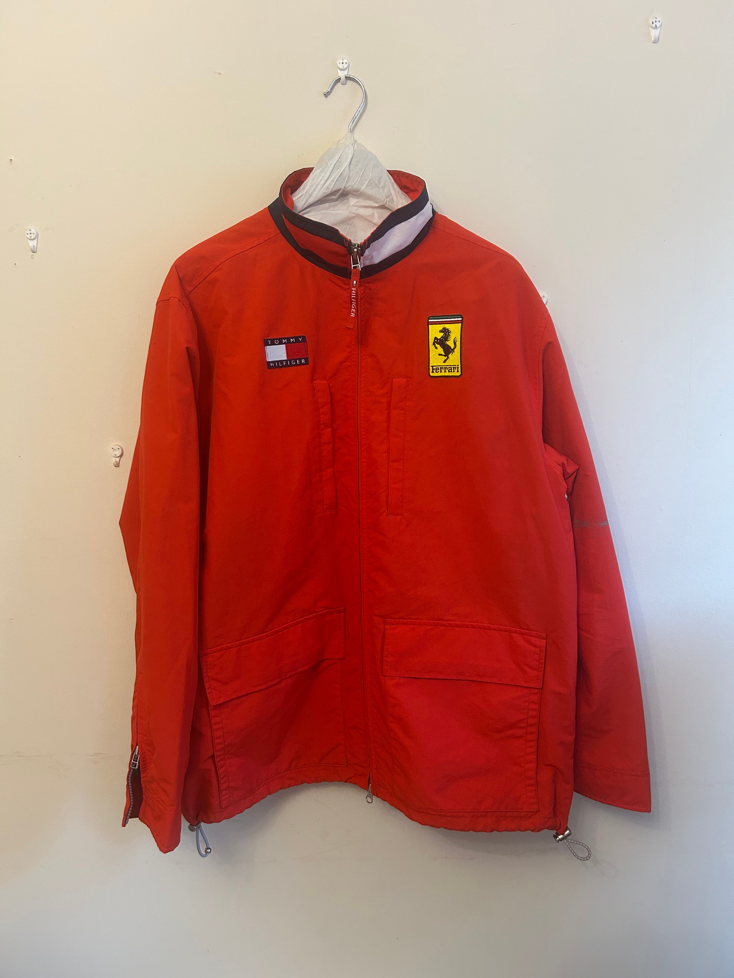 A 1990s Tommy Hilfiger Ferrari jacket in red polyester, windbreaker style (used, size L)