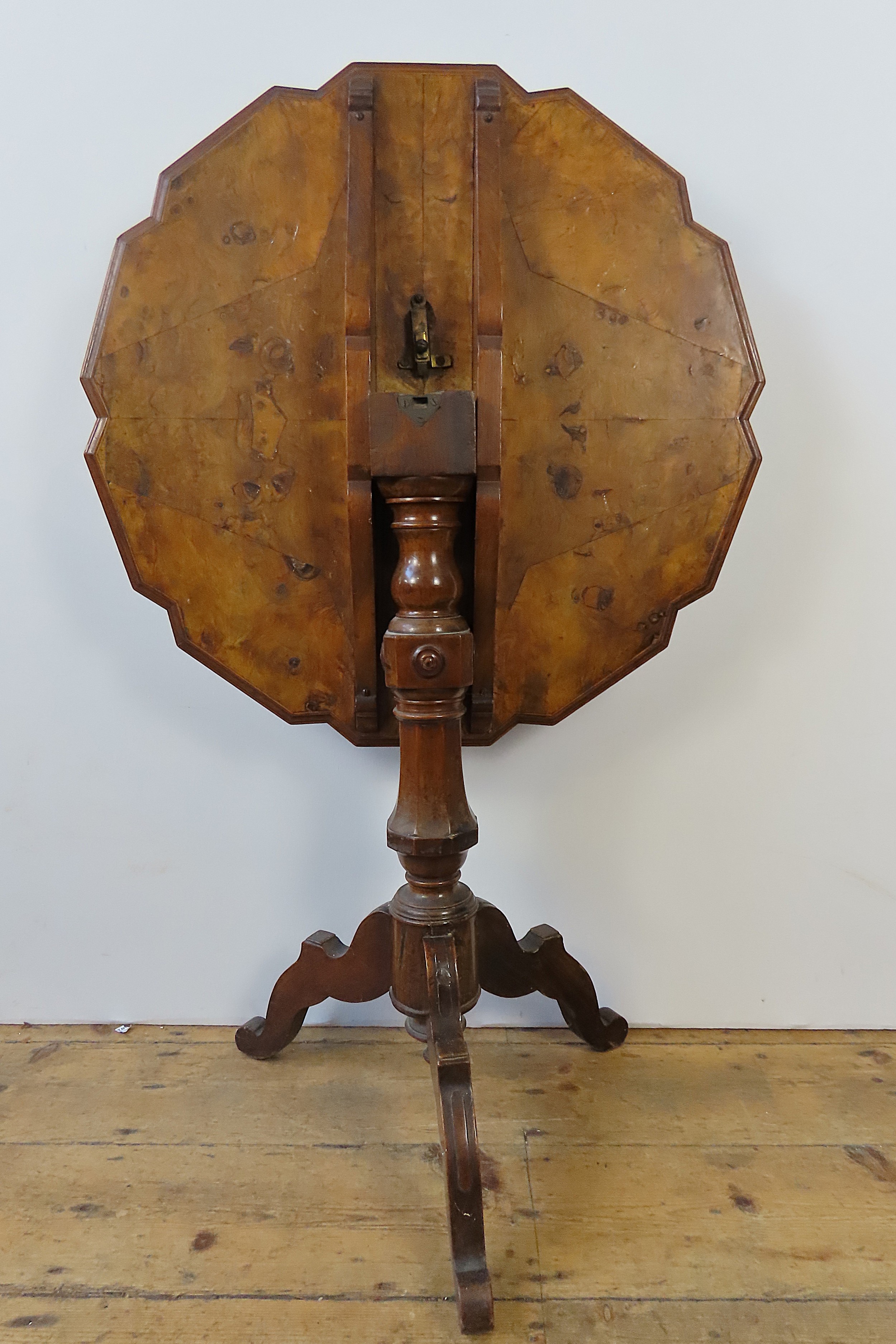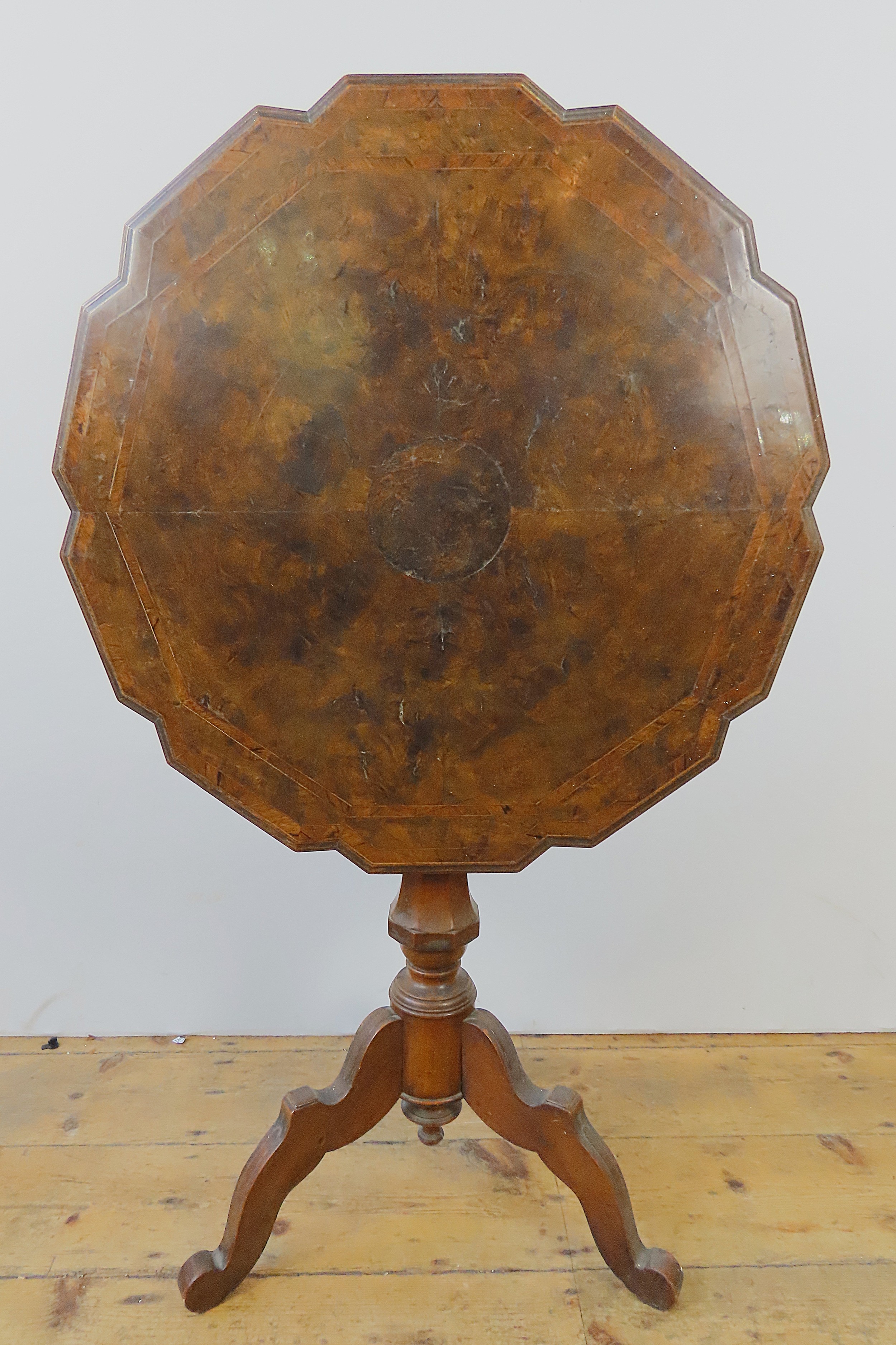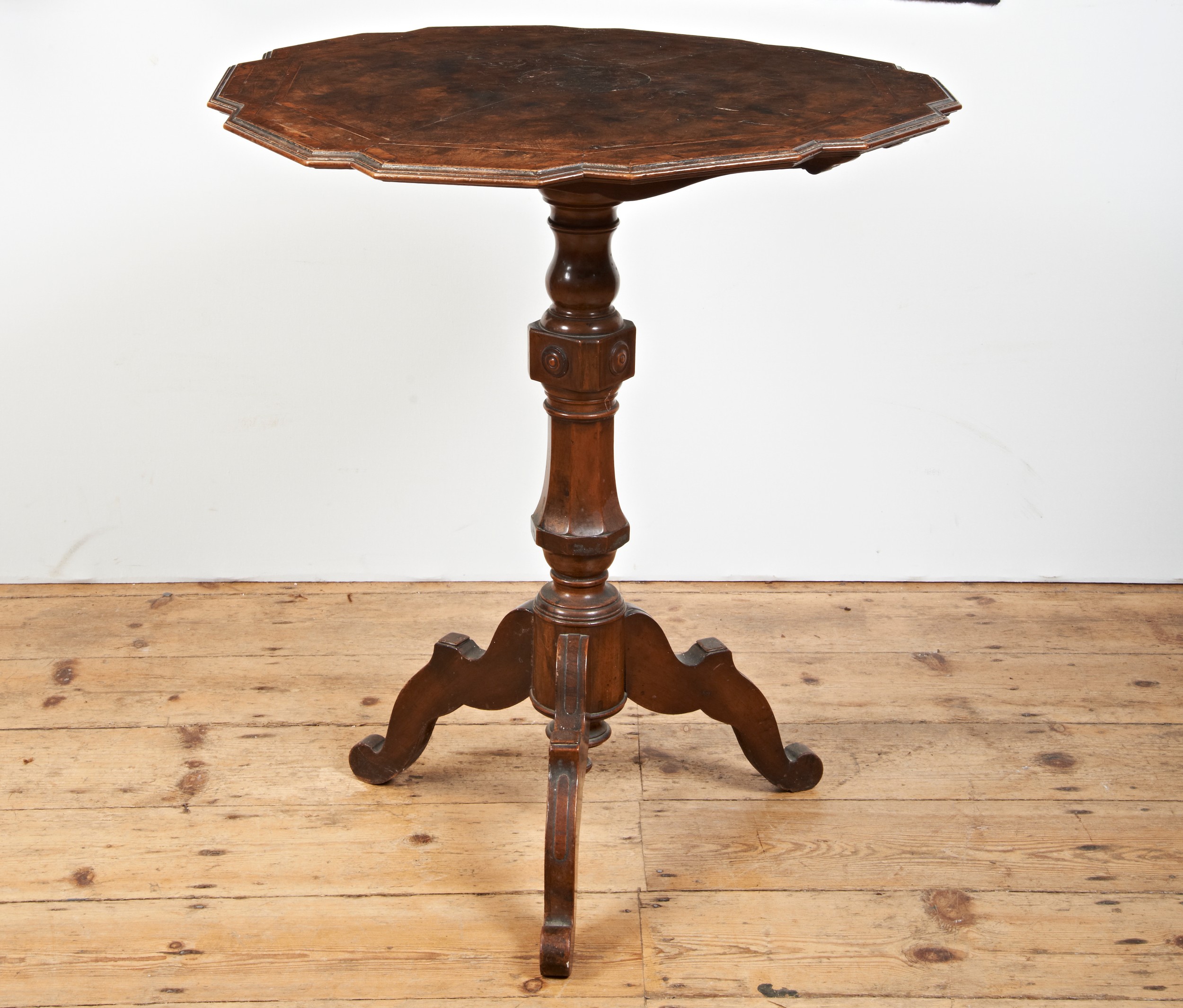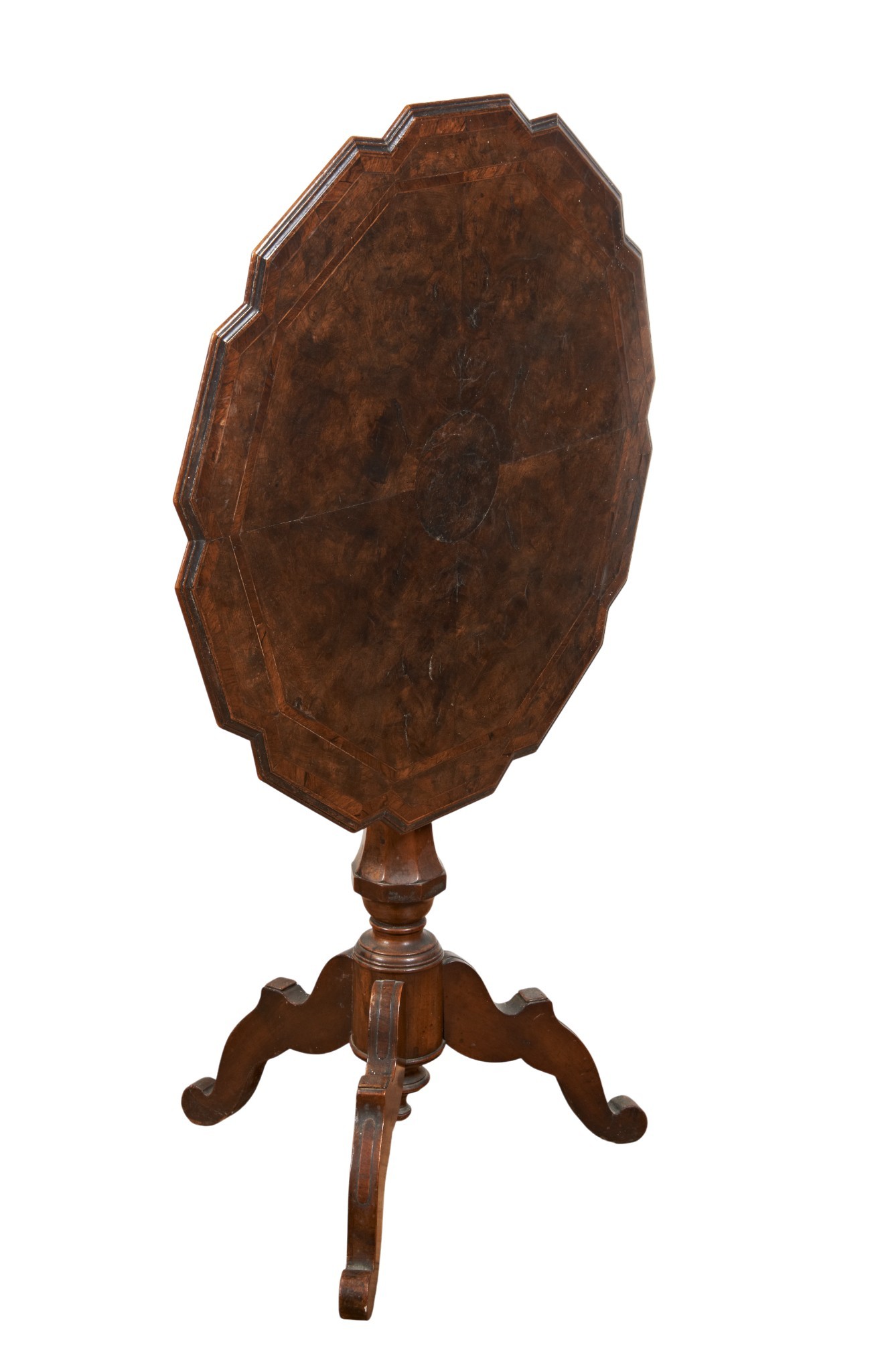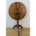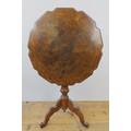 A WALNUT TILT-TOP TABLE with shaped top and tripod base. 65 cms diam 73 cms high