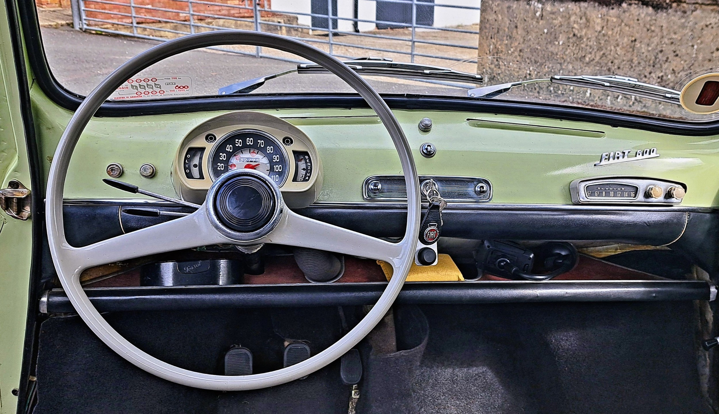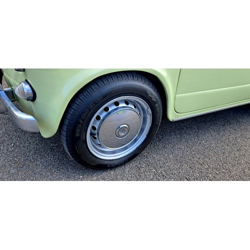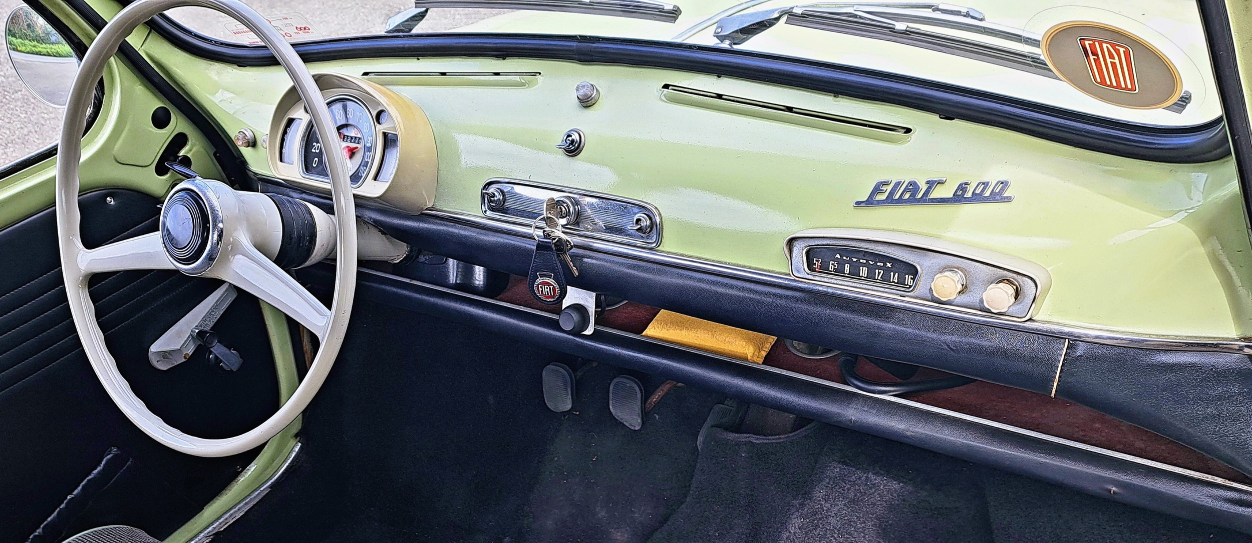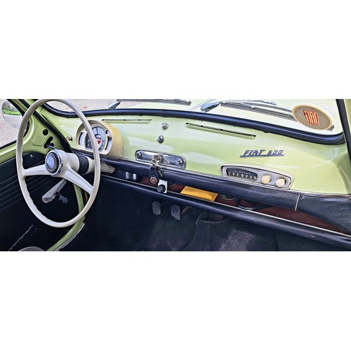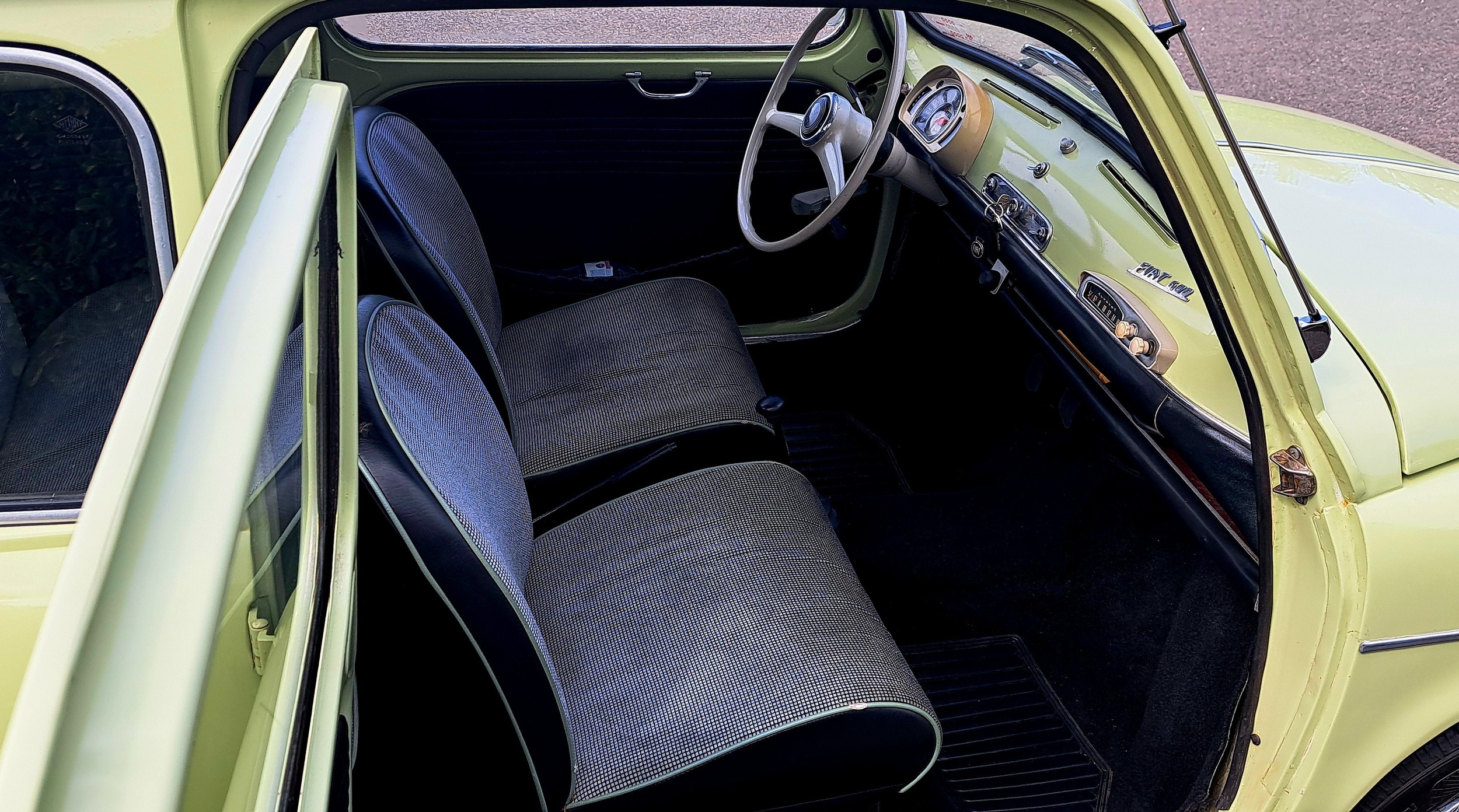 First registered in Pistoia, Tuscany, on the 24th January 1959, this little Fiat is affectionately known as ‘Lollo’. The 600 was imported into the UK from Tuscany 10 years ago, receiving the age-related registration number 197 UYO. The then new owner set about a full body restoration, finishing in the original colour of Pistachio. At the time a more powerful 903cc Fiat 127 Sport engine was installed in place of the original 600cc unit.