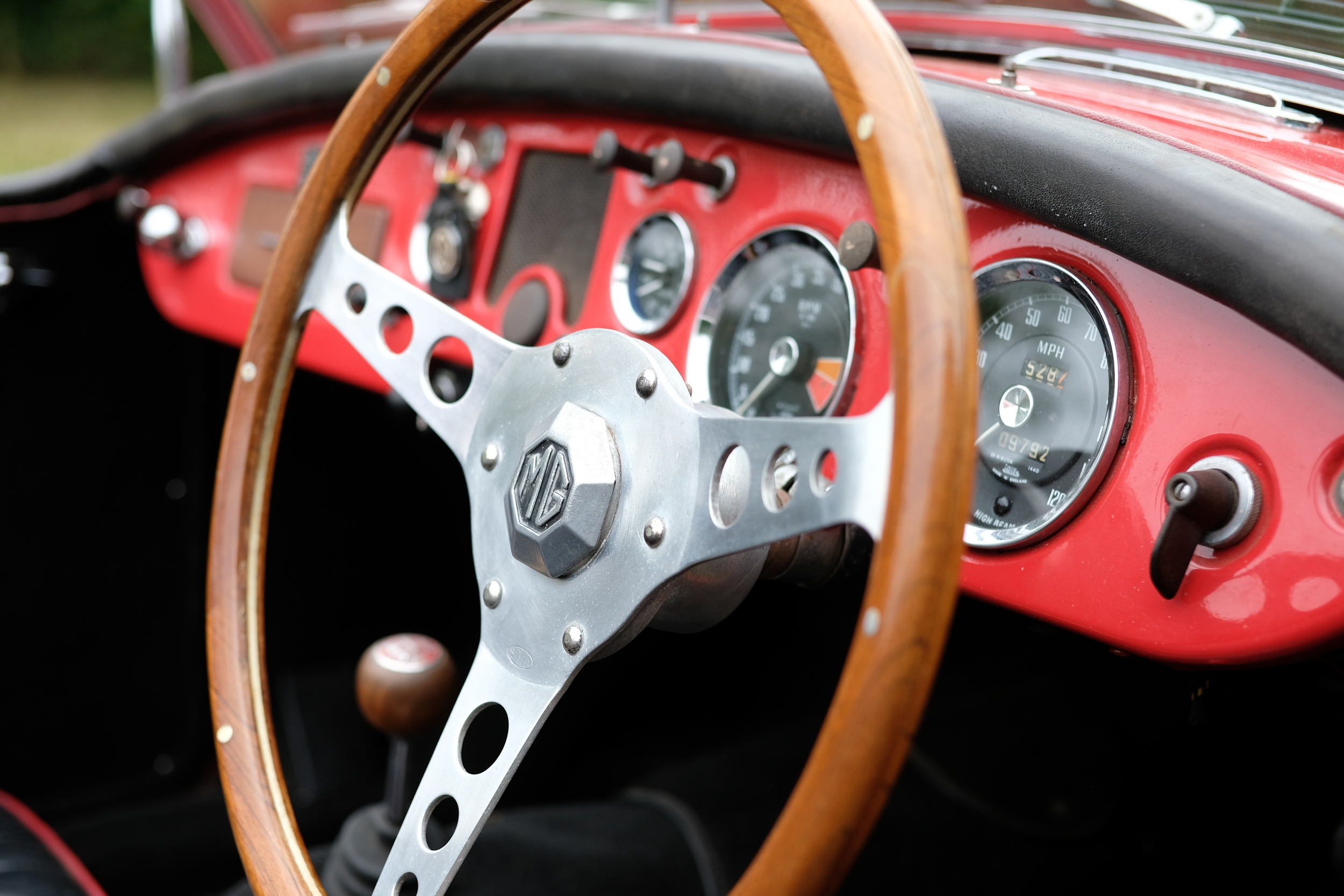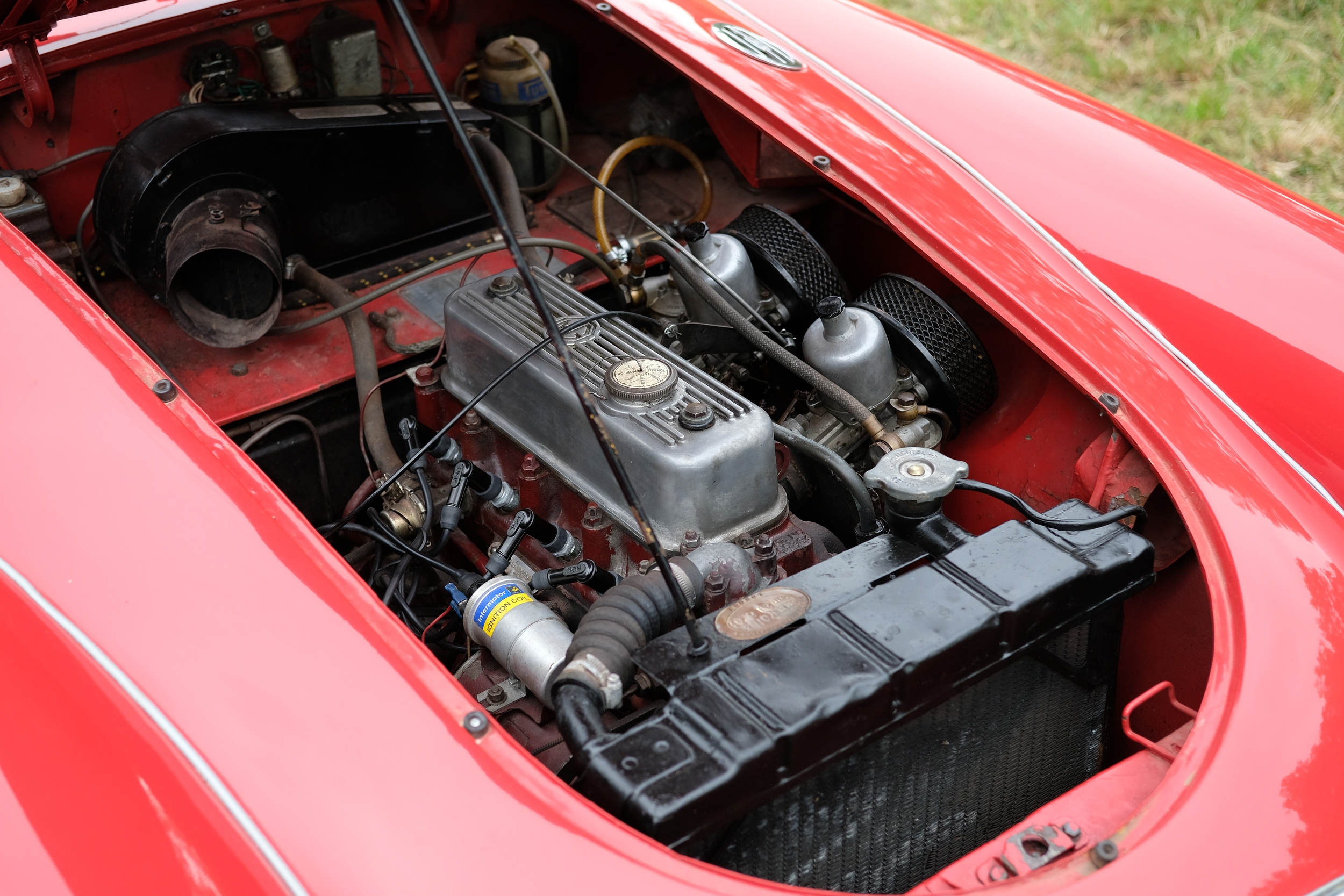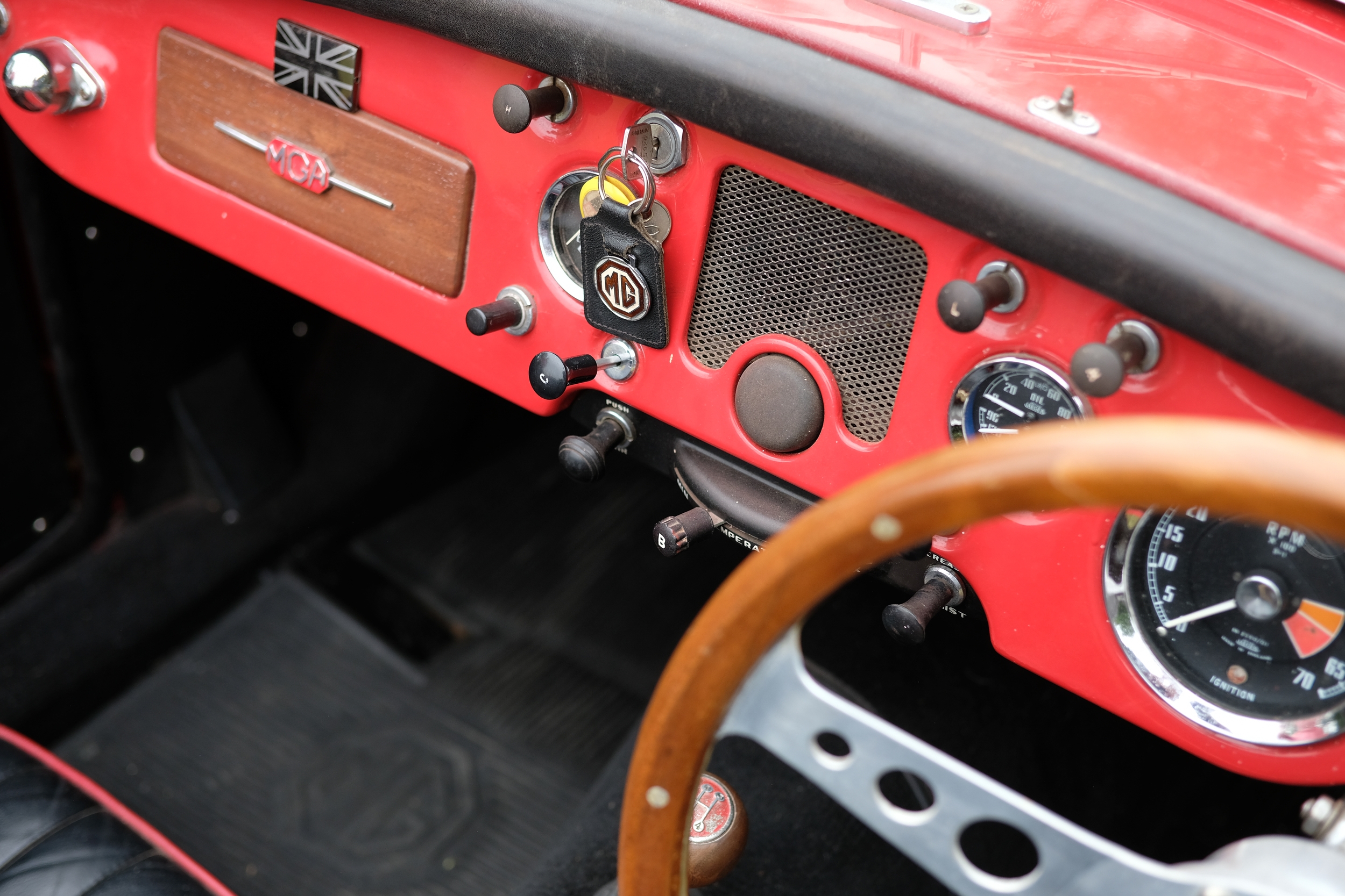 Finished in a vivid Orient Red, over black leather interior, the MGA sits beautifully on a set of 60-spoke wheels shod in excellent tyres. The detailing throughout is highly impressive, with excellent brightwork and rich deep glossy paintwork.