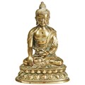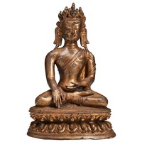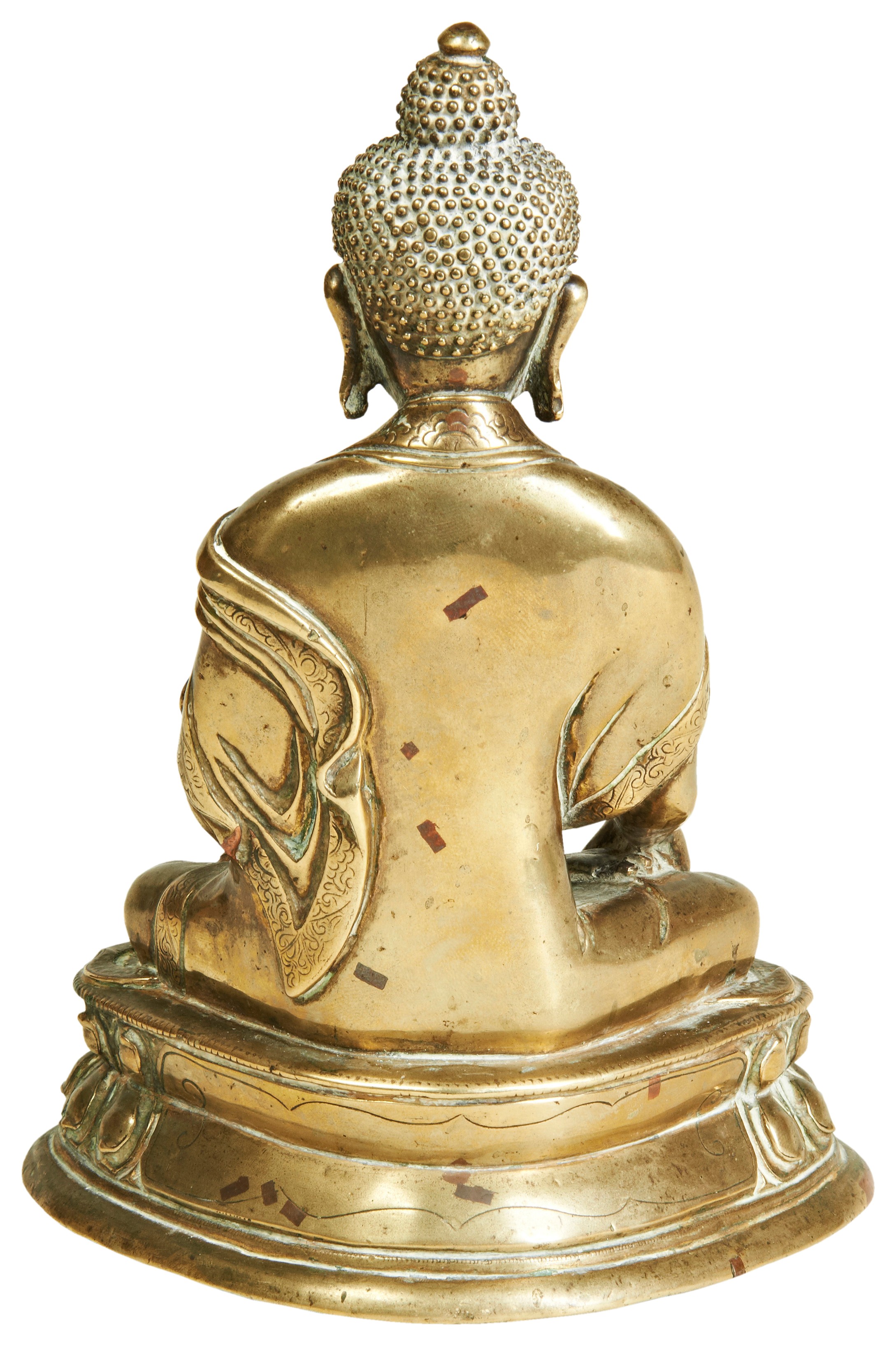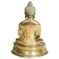 shown seated in dhyanasana, with right hand in dhyanamudra and left hand in bhumisparsamudra, and wearing a dhoti tied above the waist, and a patchwork priest's robe that falls in graceful folds on the double-lotus throne