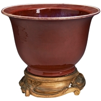 covered overall with a deep red and flambé glaze streaked in bright milky blue