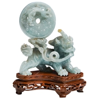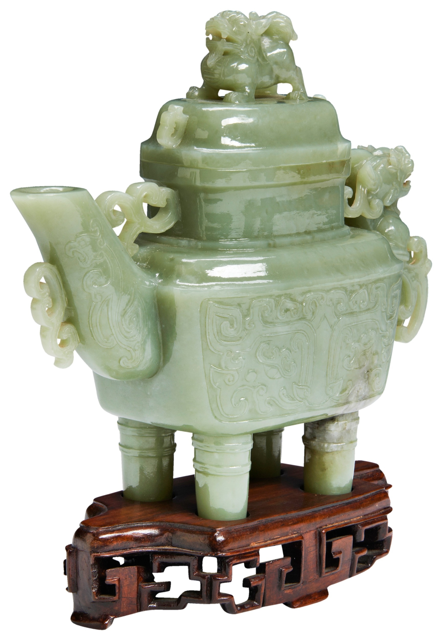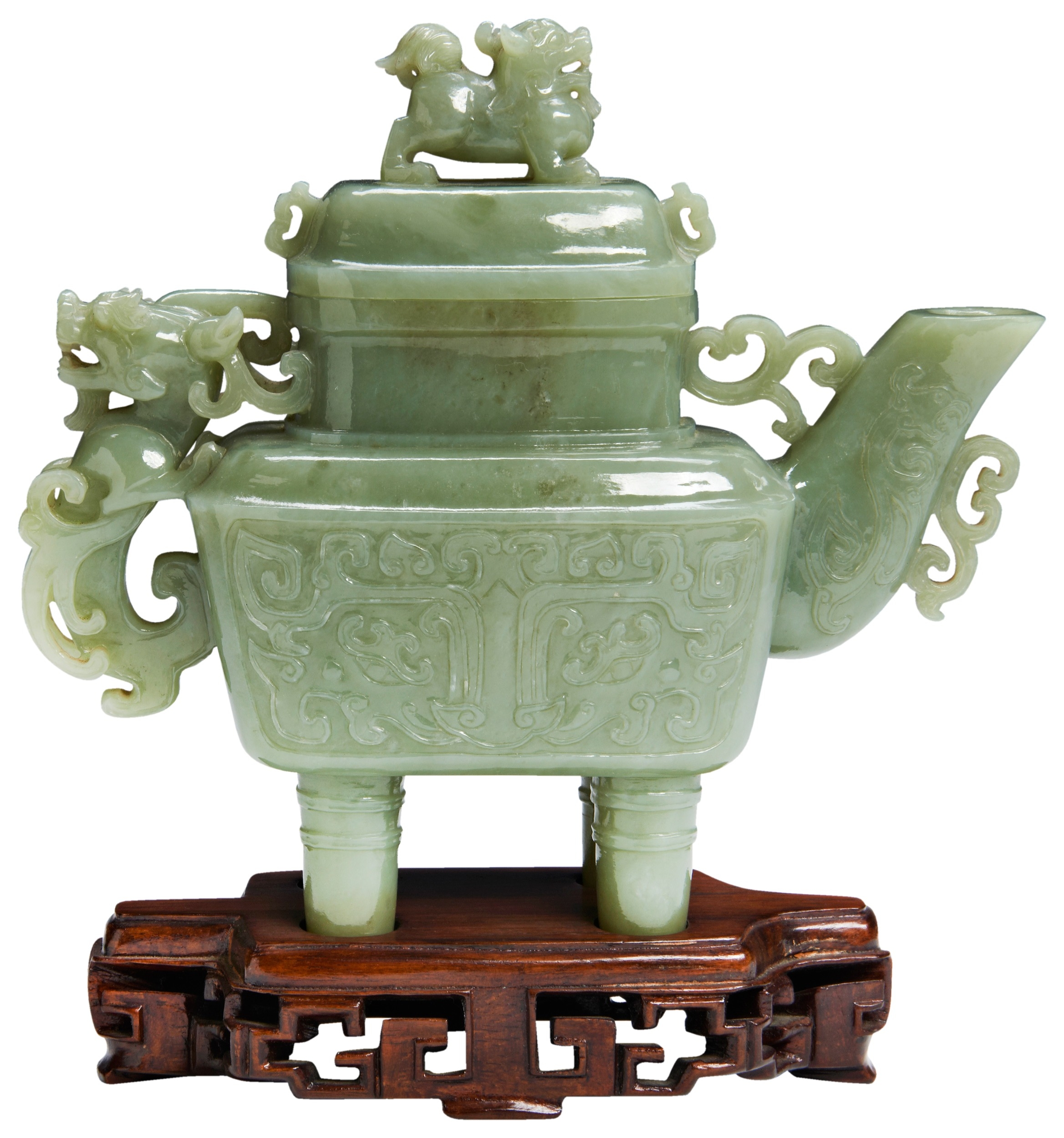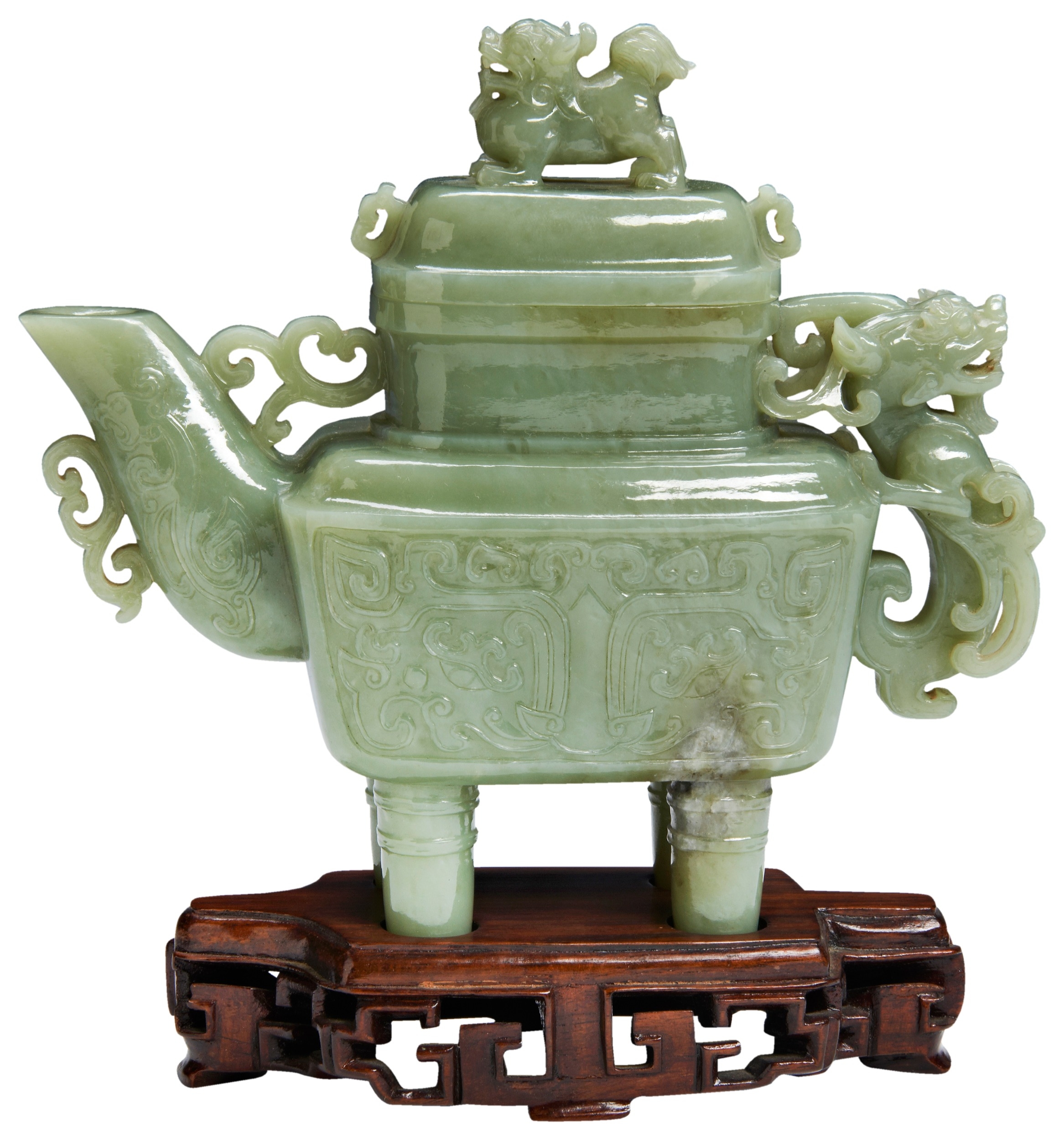 with a carved dragon handle and lion finial, the sides carved with stylised taotie masks, on a fitted carved hardwood stand and box