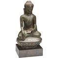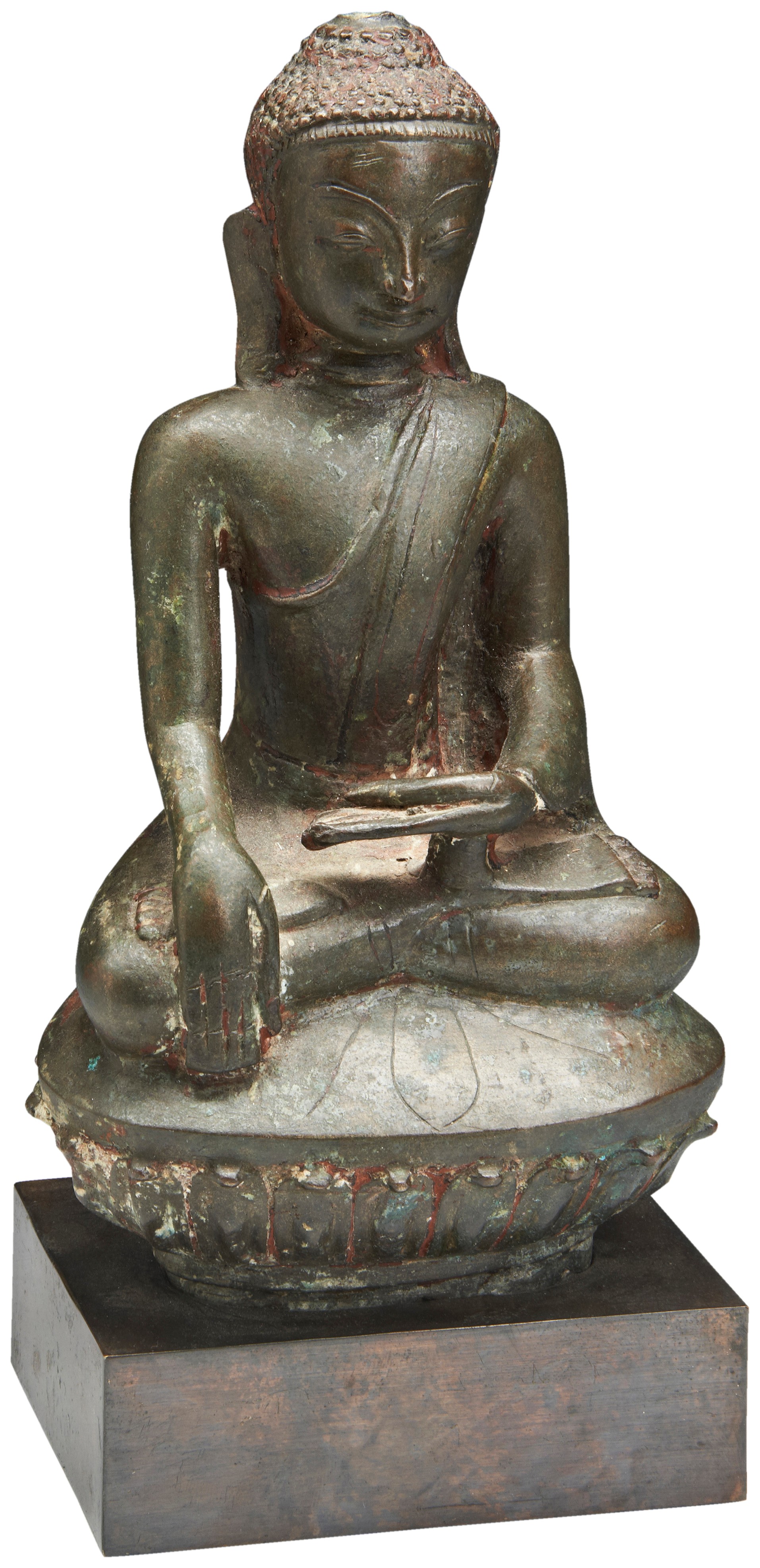 the seated figure in bhumisparsha mudra, the diaphanous robes cling to his form, appearing as if they are a part of his slender body, on a lotus petal base, with a museum-style stand