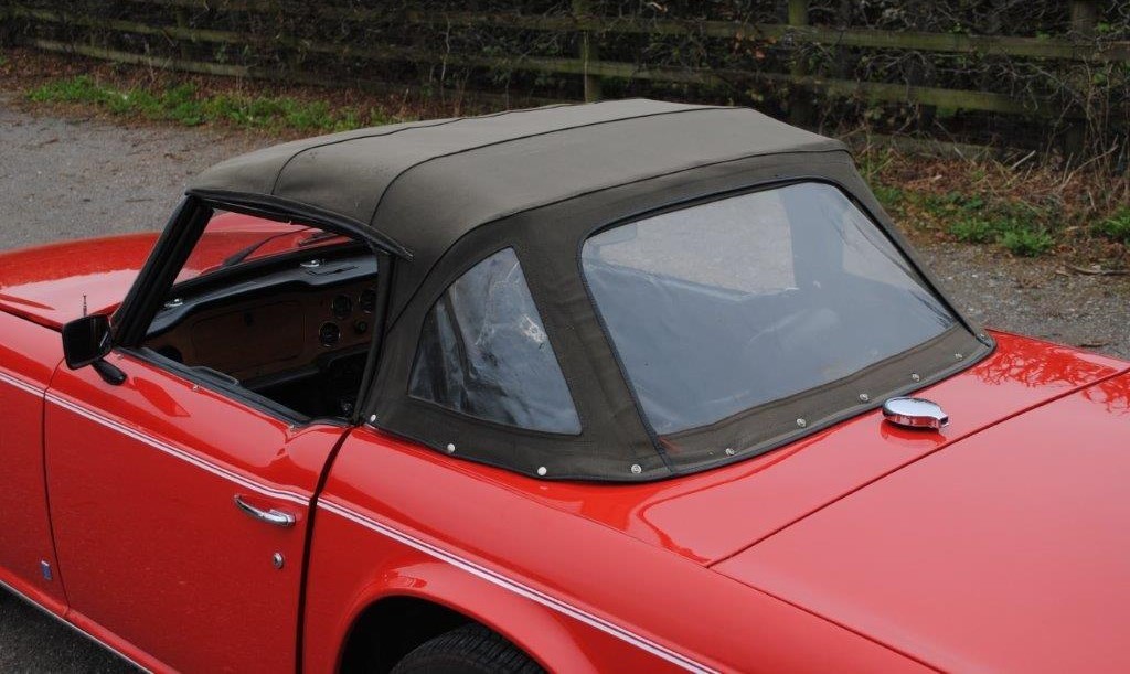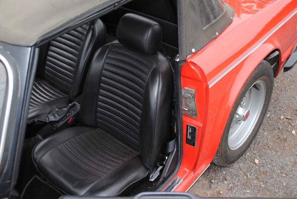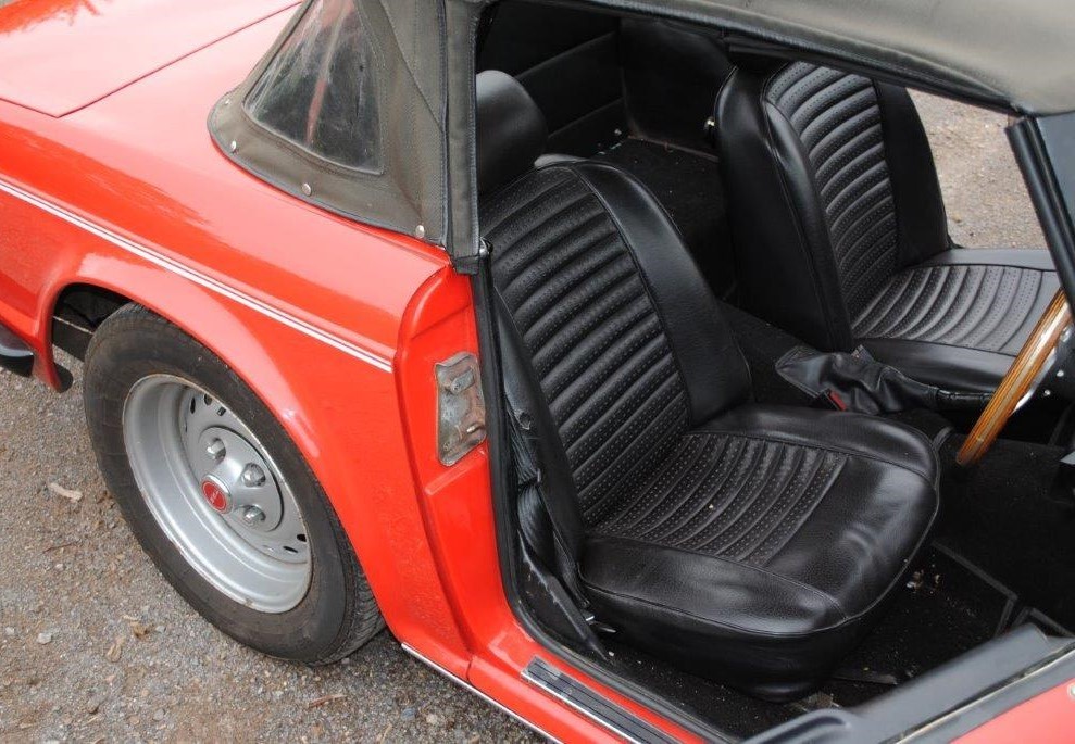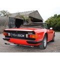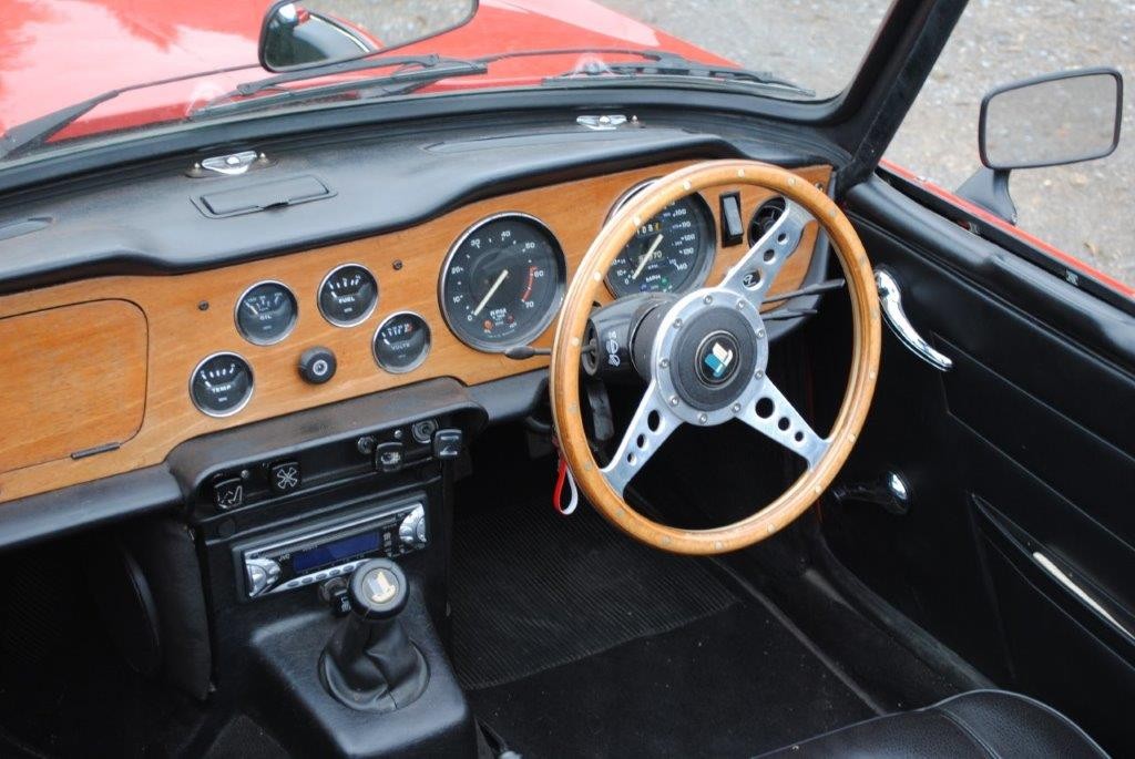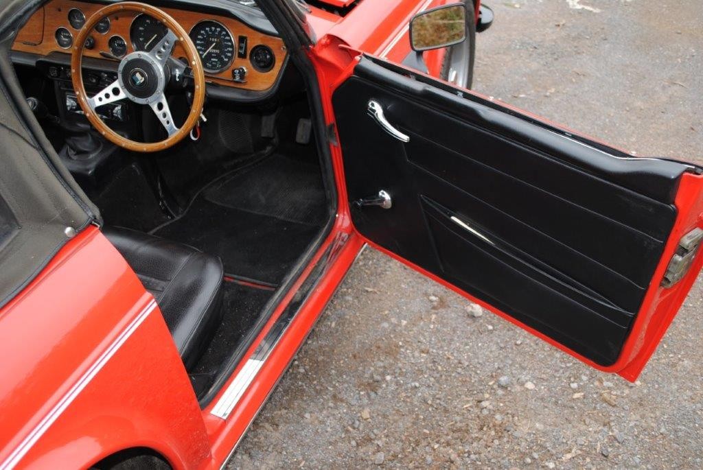 Delivered in April of 1974, this TR6 was specified in Mimosa Yellow, later being refinished in the mid-1980s in a bright shade of Pimento Red. Still presented in standard specification, the only external modification is the fitting of Racetorations quarter bumpers (the originals are included). The interior appears to be original with the exception of a slightly more modern stereo and Moto-Lita sports steering wheel. The original convertible hood has been replaced with a black mohair item. In 2018 the TR6 was subject to a rear end impact, which was fully repaired by an insurance-approved bodyshop at the time (a clear HPI report is provided with the car). The paintwork remains in generally good order, showing minor stonechips and a few minor marks/bubbles.