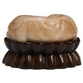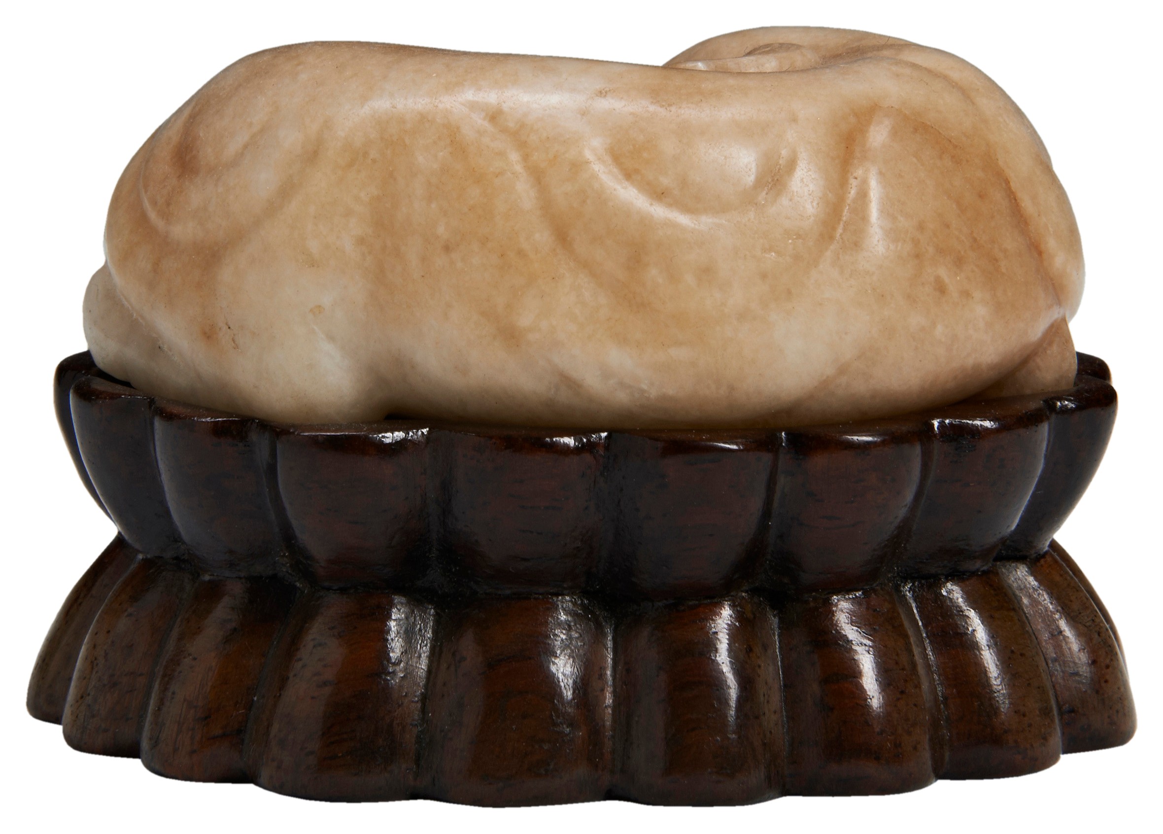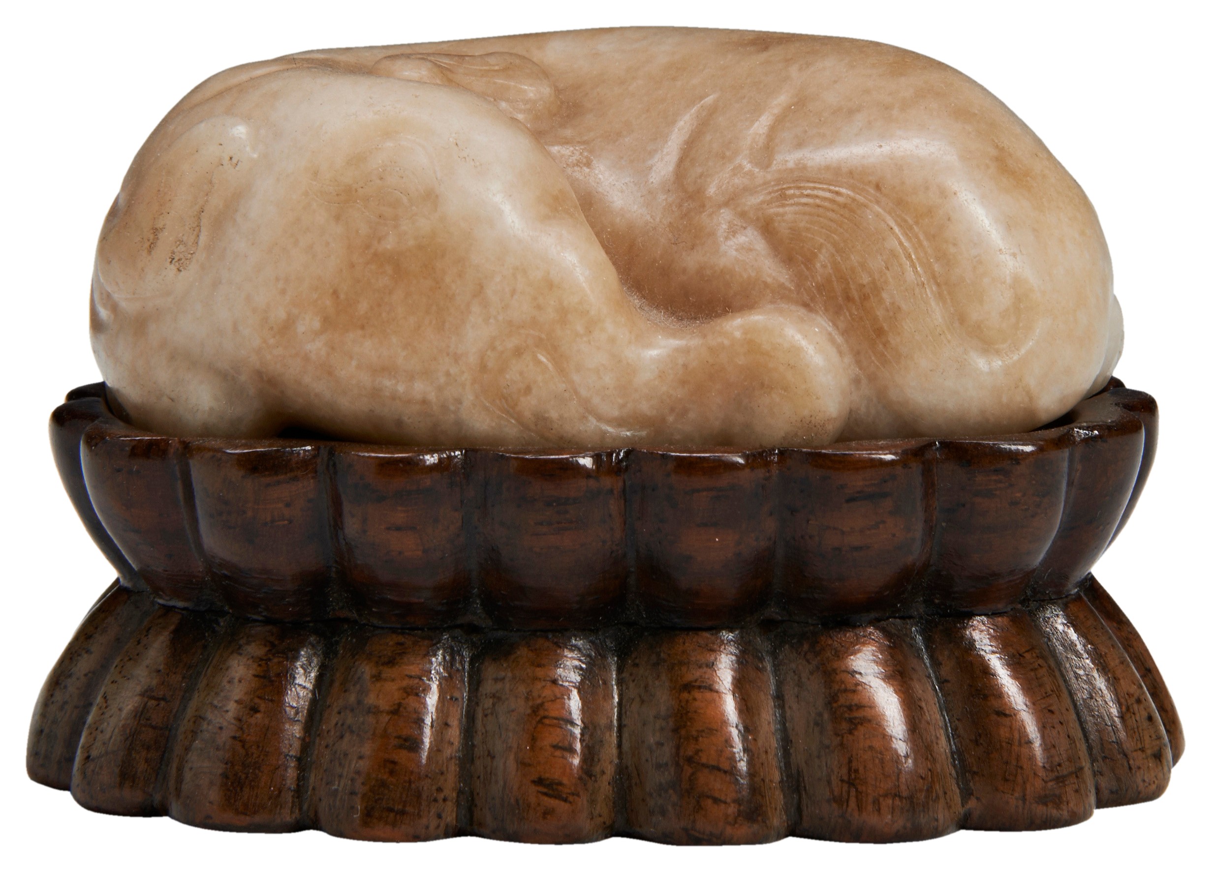 modelled recumbent with the head turned backwards, the legs are neatly tucked beneath its body, raised on a fitted double-lotus carved hardwood stand