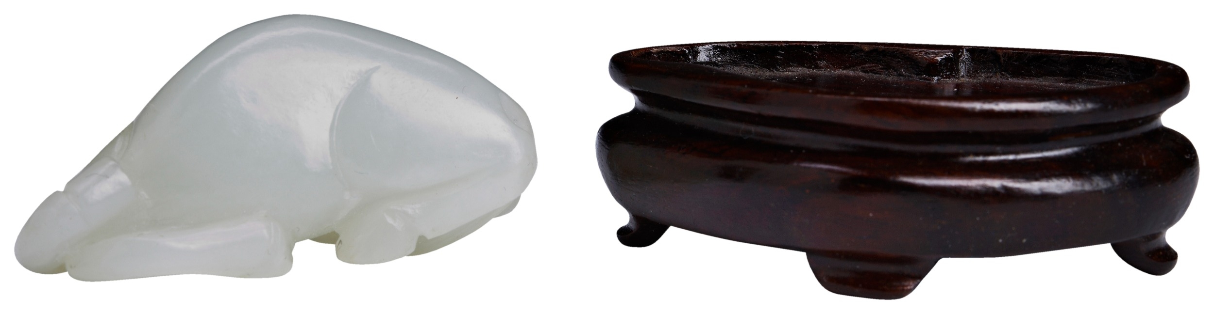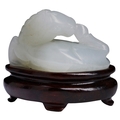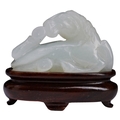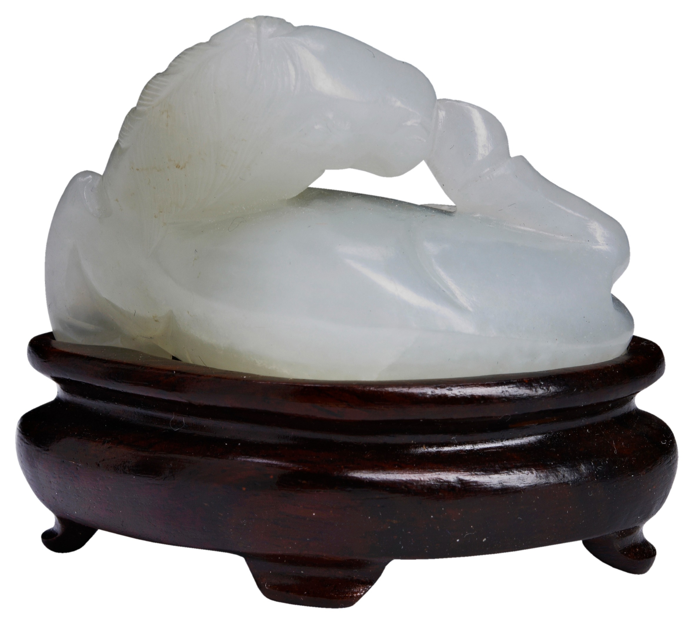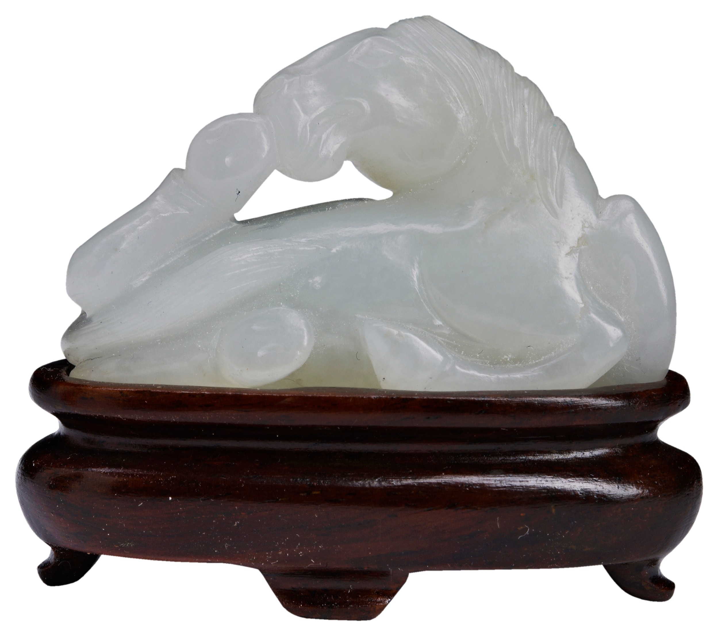 A WHITE JADE CARVING OF A RECUMBENT HORSE,