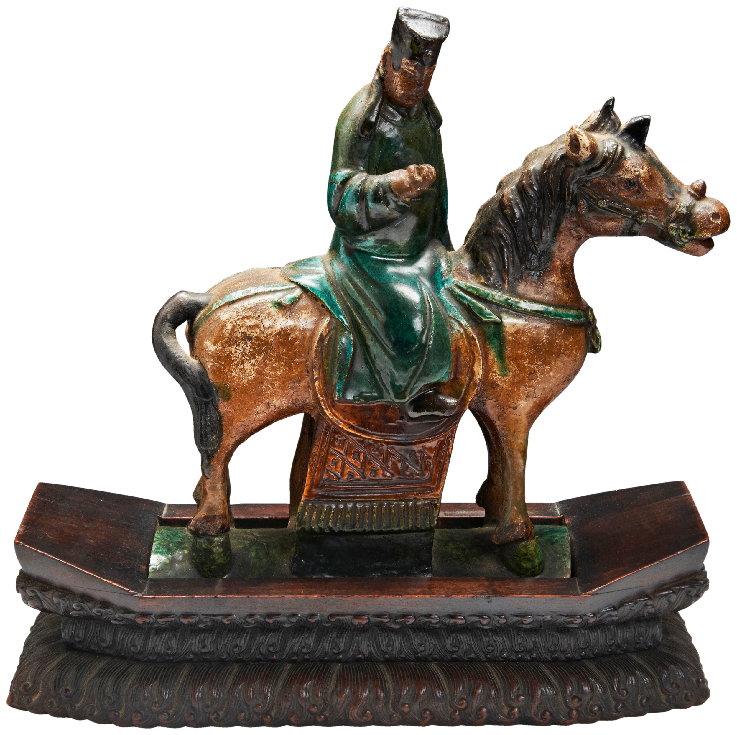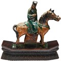 depicting Guan Yu (The God of War) on horse back, raised on a fine shaped rectangular base finely carved to the sides with crashing waves