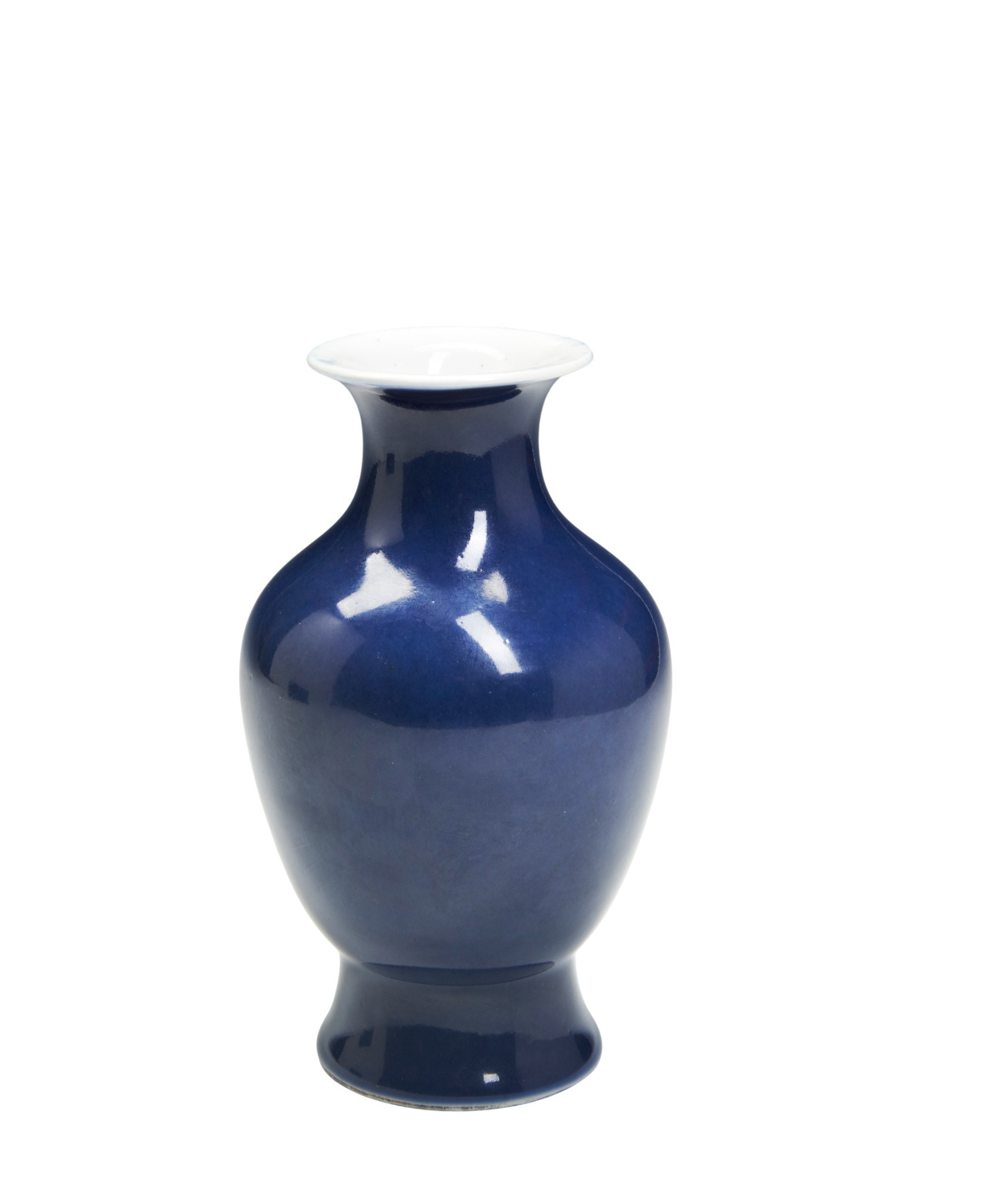 covered with an even, deep cobalt-blue glaze stopping neatly above the foot, the mouth rim is glazed white