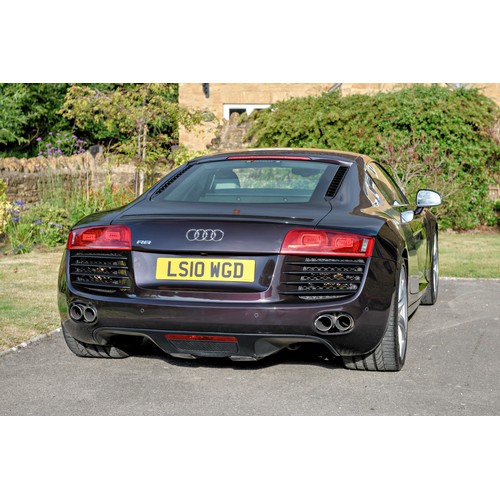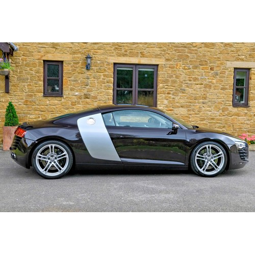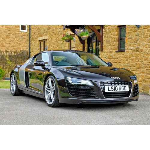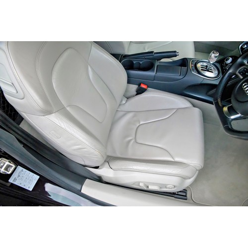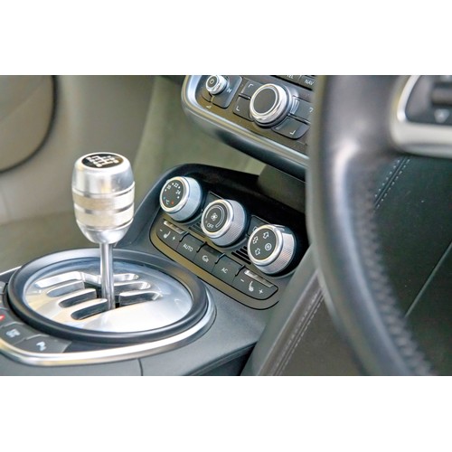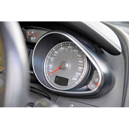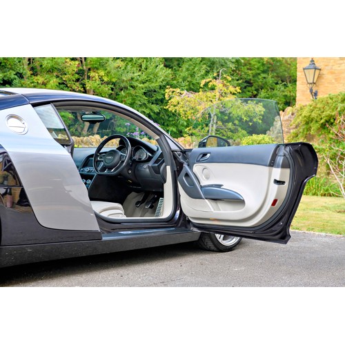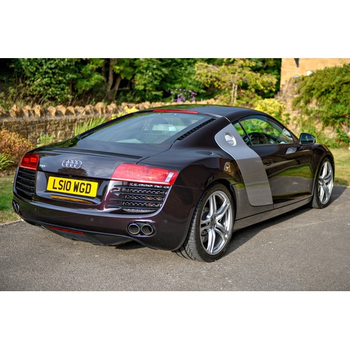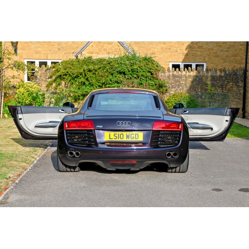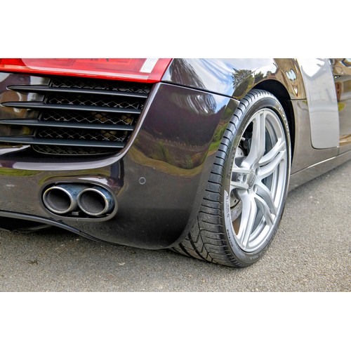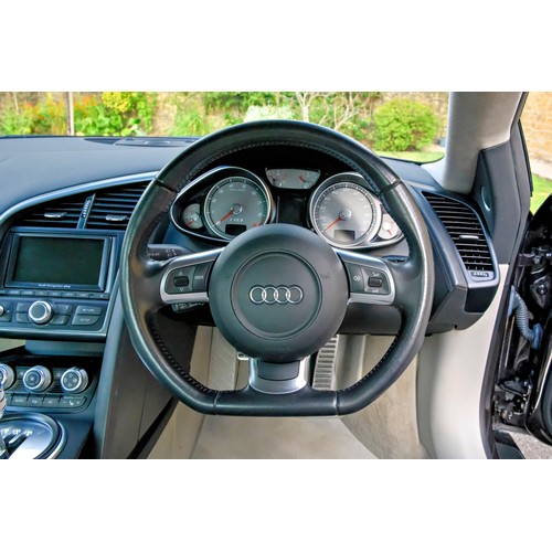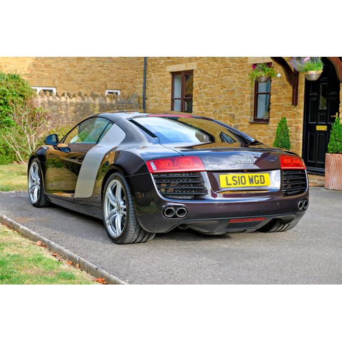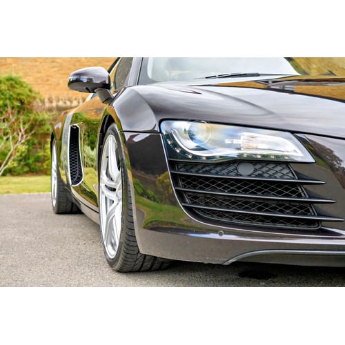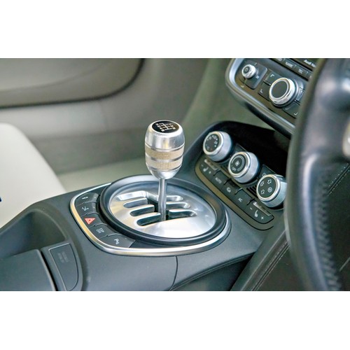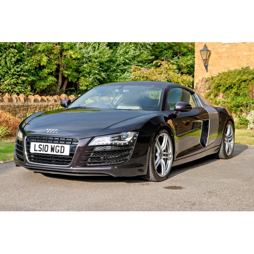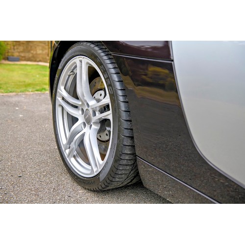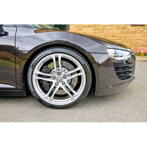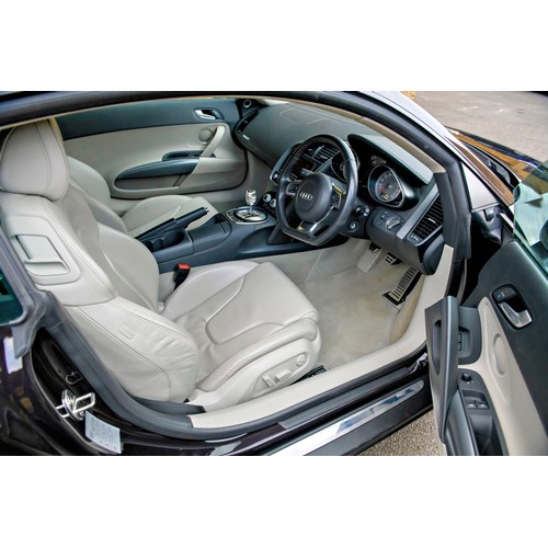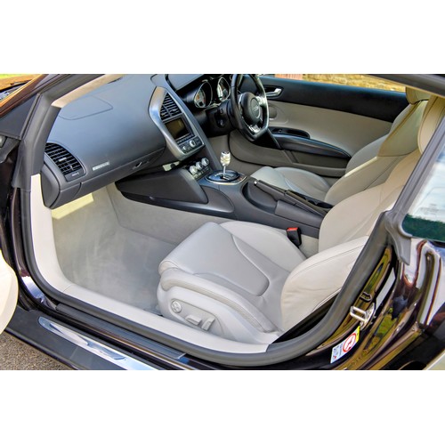 This attractive 2010 Audi R8 V8, specified with the desirable gated six-speed manual gearbox, has been in current private ownership for some 9 years. An exceptionally clean, well specified example purchased from specialist Bramley Motors in 2016, the R8 is finished in a rare shade of pearl effect metallic Audi Exclusive Cherry Black with light grey side blades, an extended light fine Nappa grey leather interior, and such options as Magnetic Ride Suspension, Navigation Plus, Audi Parking System Advanced, Bang and Olufsen Sound System, Alcantara Headlining, Electrically Adjustable Front Seating, Auto Dimming Rear View Mirrors, Light Package, Mobile Phone Preparation, CD Autochanger, Heated Front Seating, Tyre Pressure Control System, Cruise Control, Storage Package, Coloured Stitching and Audi Hill Hold Assist.
