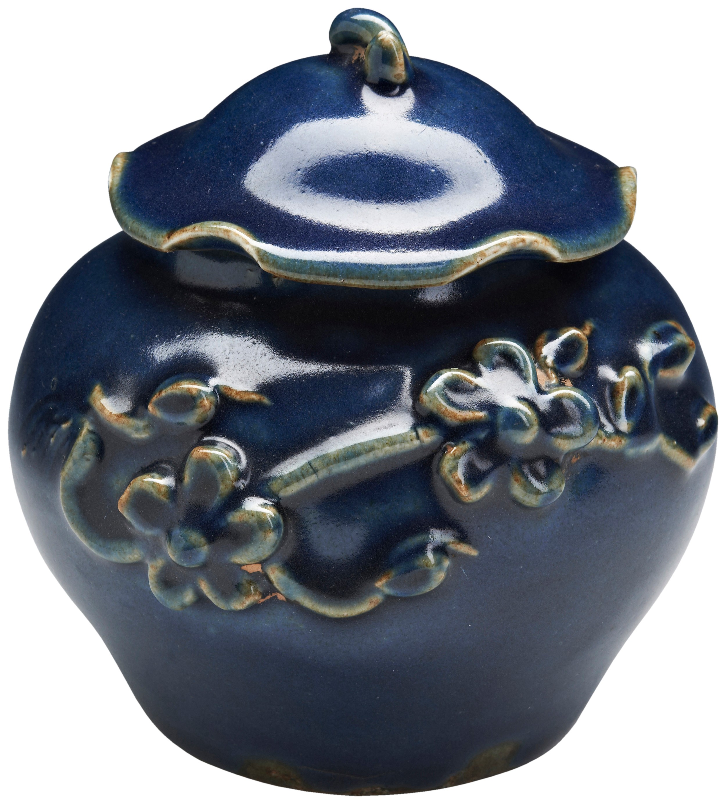 A BLUE-GLAZED MOULDED JAR AND COVER