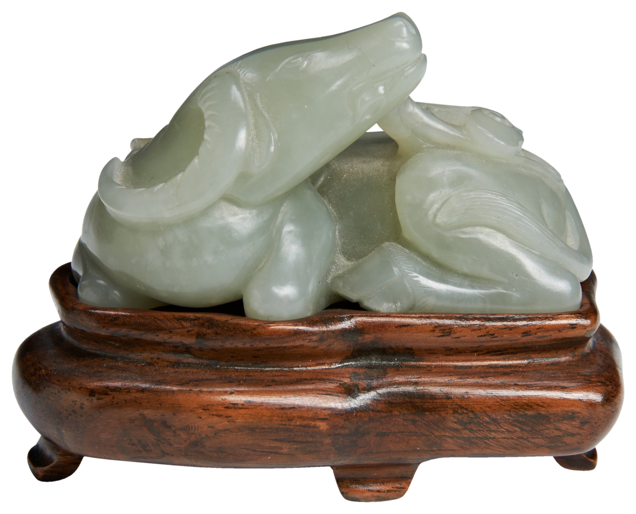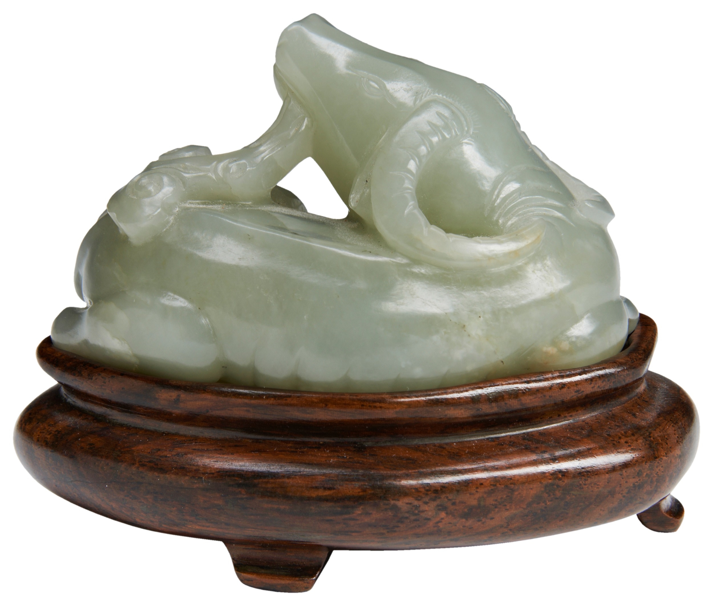 crisply carved with its head turned backwards over the body holding a lingzhi spray in its mouth, the legs neatly tucked beneath its body, on a fitted hardwood stand
