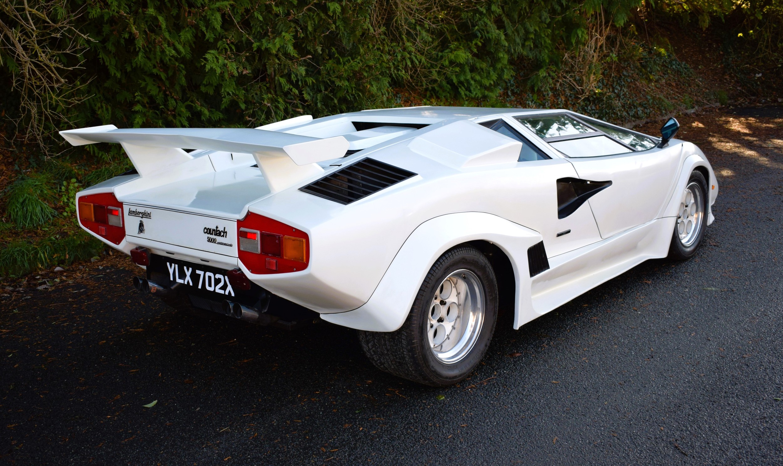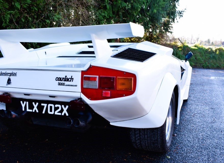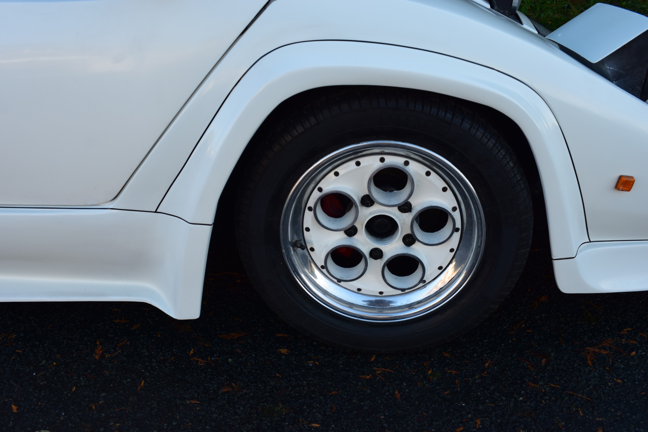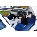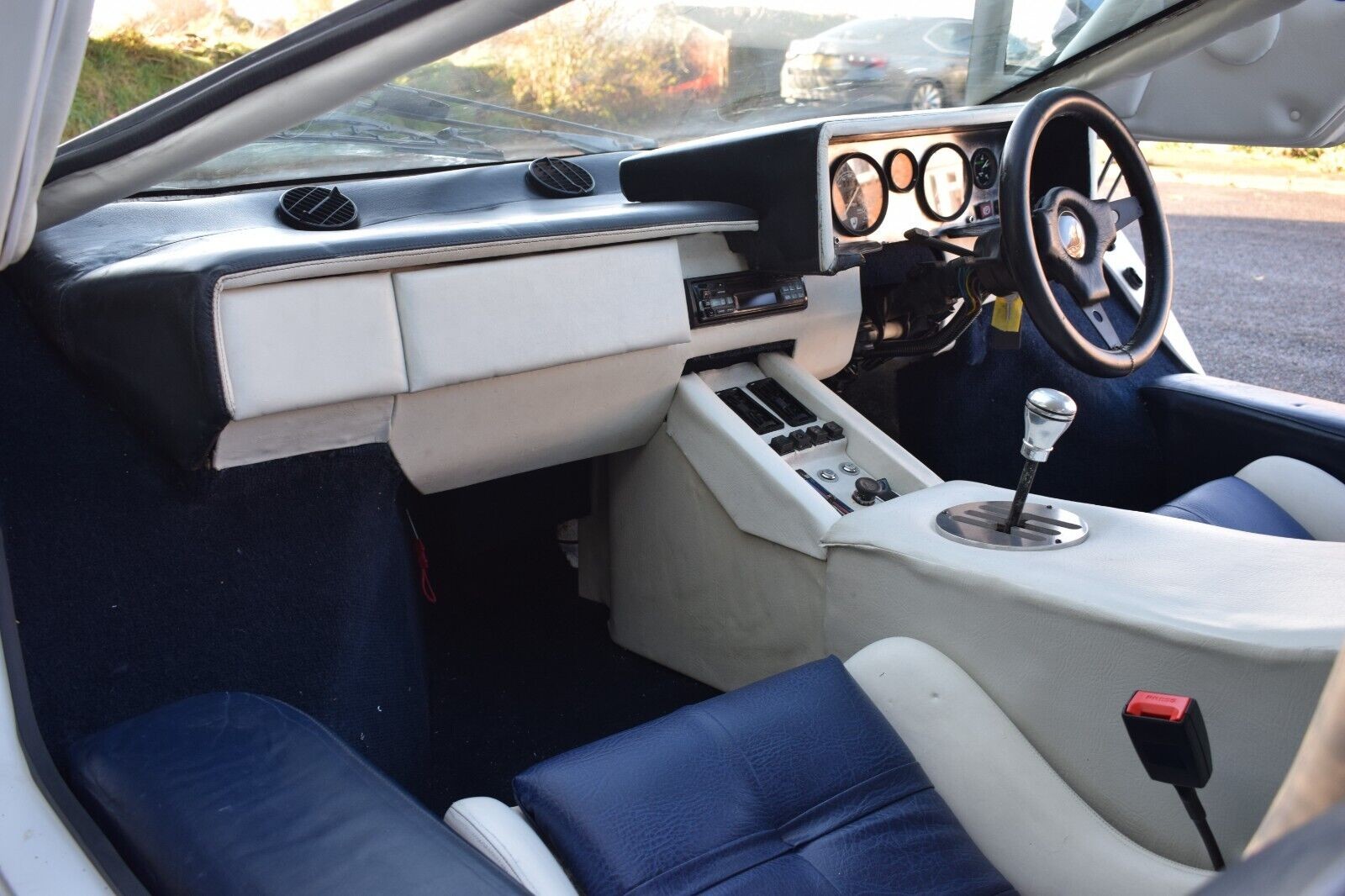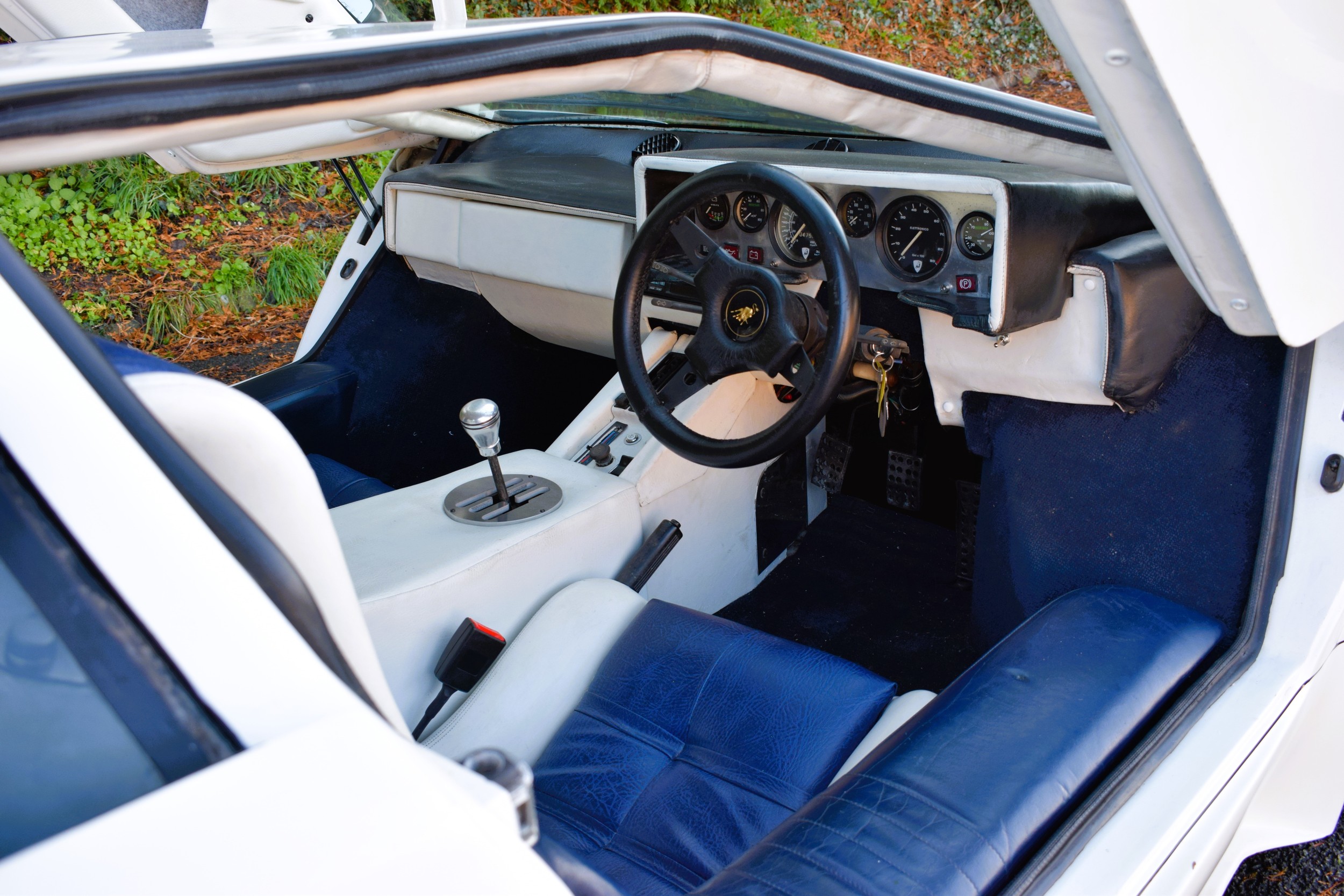 This early well built ‘Mirage’ Countach 5000QV has been styled as per the ‘Koenig Turbo Countach’, as such featuring Koenig side skirts, colour-coded telephone dial split-rim alloy wheels, and the delta rear wing. The chassis, a re-creation of the original Countach item, was reputedly designed by Lee Noble on a a full tubular steel space frame, with authentic double wishbone front and rear suspension, twin rear trailing arms, rose joints throughout, and Spax adjustable coil-over dampers all round (with twin dampers to the rear). The hubs, handbrake mechanisms, vented brake discs and Brembo four-pot calipers are all early Porsche 911 items, clearly a well thought out build. The underneath of the car is fully flat floored to the underside for improved aerodynamics. The Countach sits on 15 inch, 3 piece alloy split rim items by Image Wheels (England), with highly polished rims. The interior has recently been retrimmed in white with contrasting navy blue trim, designed for a finish as close as possible to the original car. The dials are correct Lamborghini items.