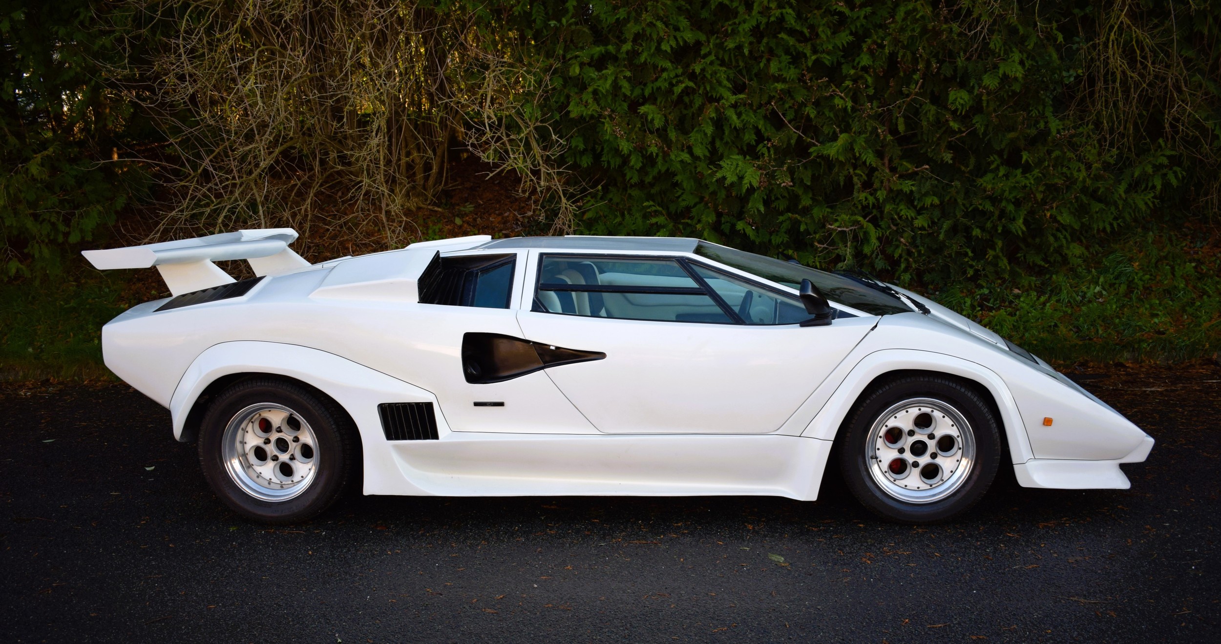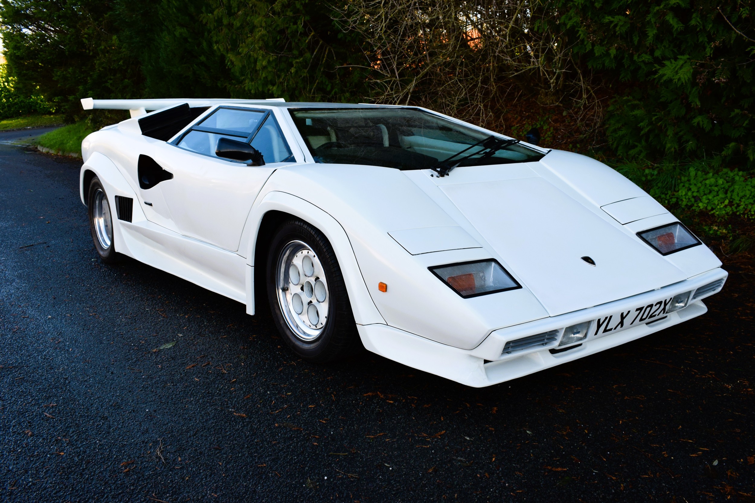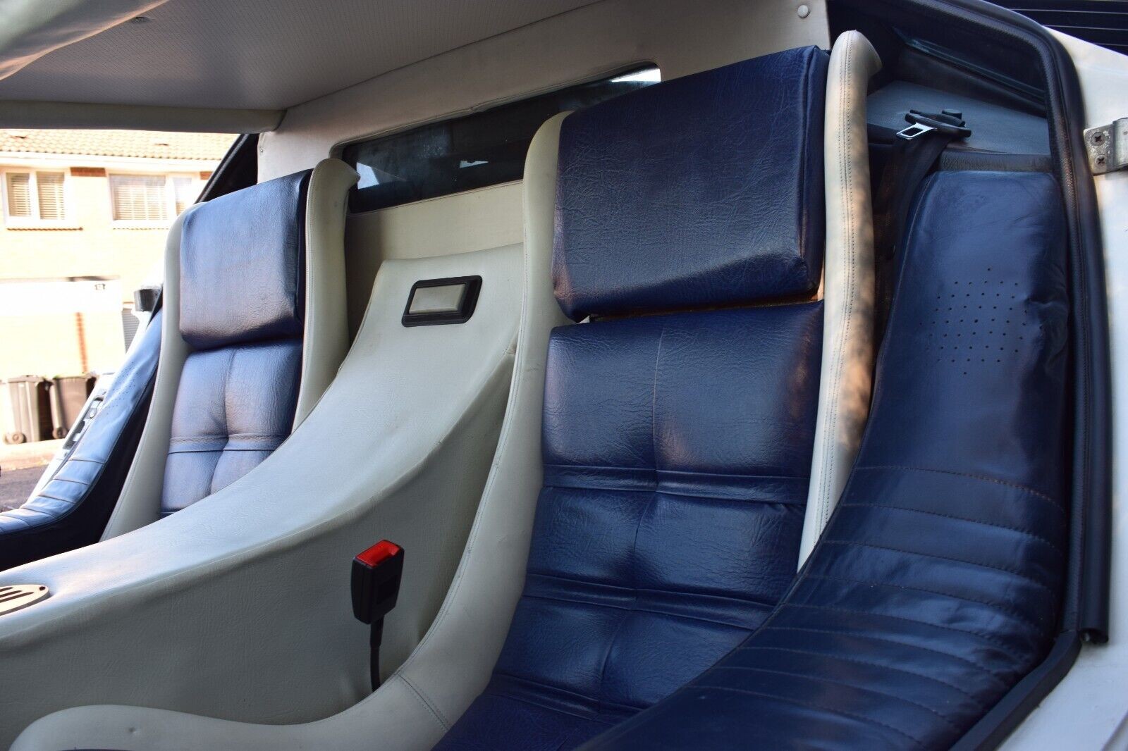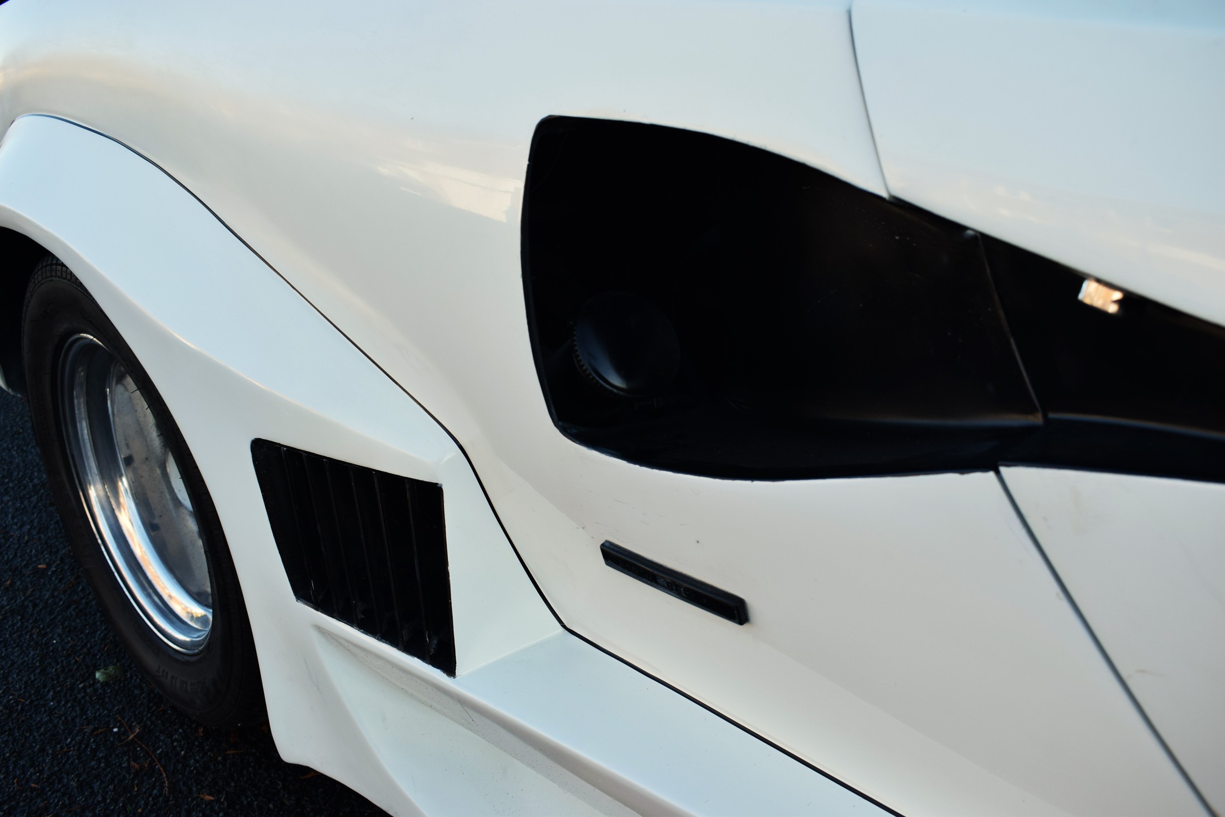 This early well built ‘Mirage’ Countach 5000QV has been styled as per the ‘Koenig Turbo Countach’, as such featuring Koenig side skirts, colour-coded telephone dial split-rim alloy wheels, and the delta rear wing. The chassis, a re-creation of the original Countach item, was reputedly designed by Lee Noble on a a full tubular steel space frame, with authentic double wishbone front and rear suspension, twin rear trailing arms, rose joints throughout, and Spax adjustable coil-over dampers all round (with twin dampers to the rear). The hubs, handbrake mechanisms, vented brake discs and Brembo four-pot calipers are all early Porsche 911 items, clearly a well thought out build. The underneath of the car is fully flat floored to the underside for improved aerodynamics. The Countach sits on 15 inch, 3 piece alloy split rim items by Image Wheels (England), with highly polished rims. The interior has recently been retrimmed in white with contrasting navy blue trim, designed for a finish as close as possible to the original car. The dials are correct Lamborghini items.