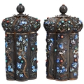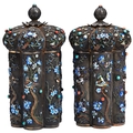 A PAIR OF CHINESE EXPORT SILVER-GILT, ENAMEL AND HARDSTONE COVERED TEA CADDIES