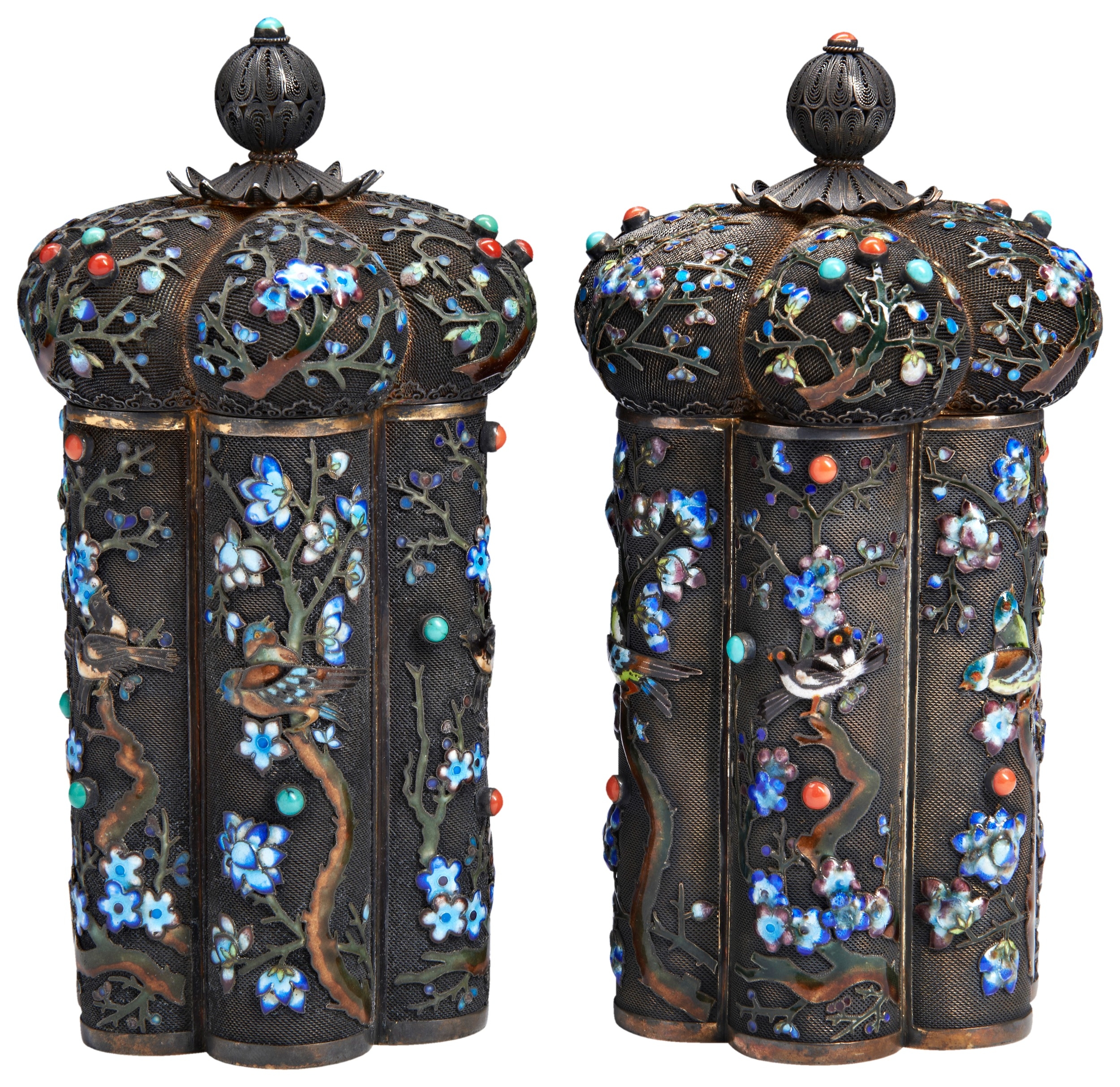 the lobed filigree sides and covers finely worked in coloured enamels, turquoise and coral 'jewels' with with birds perched amongst blossoming branches