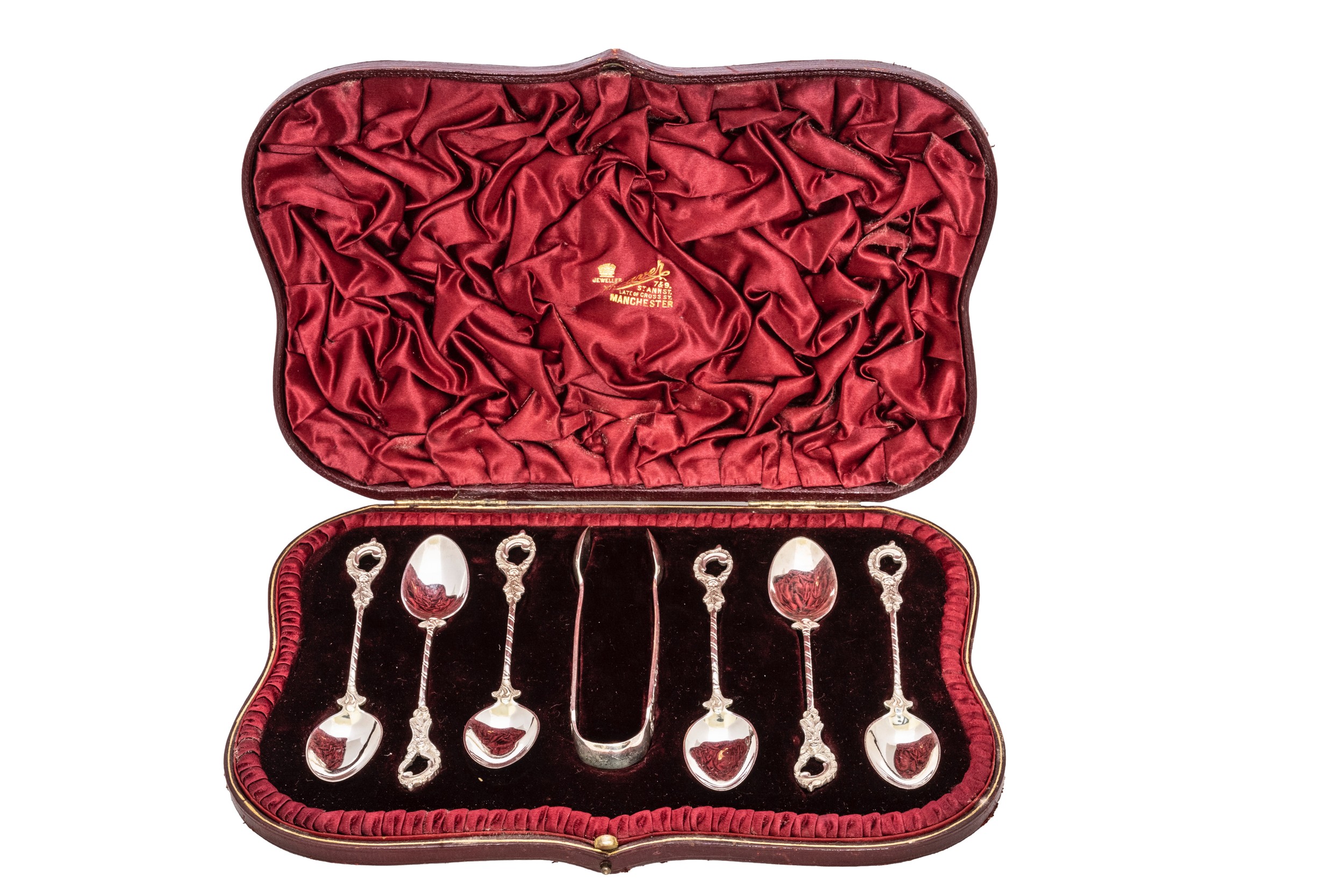 together with a matching pair of sugar tongs, with ornate scroll foliate handles, presented in a cartouche form case