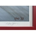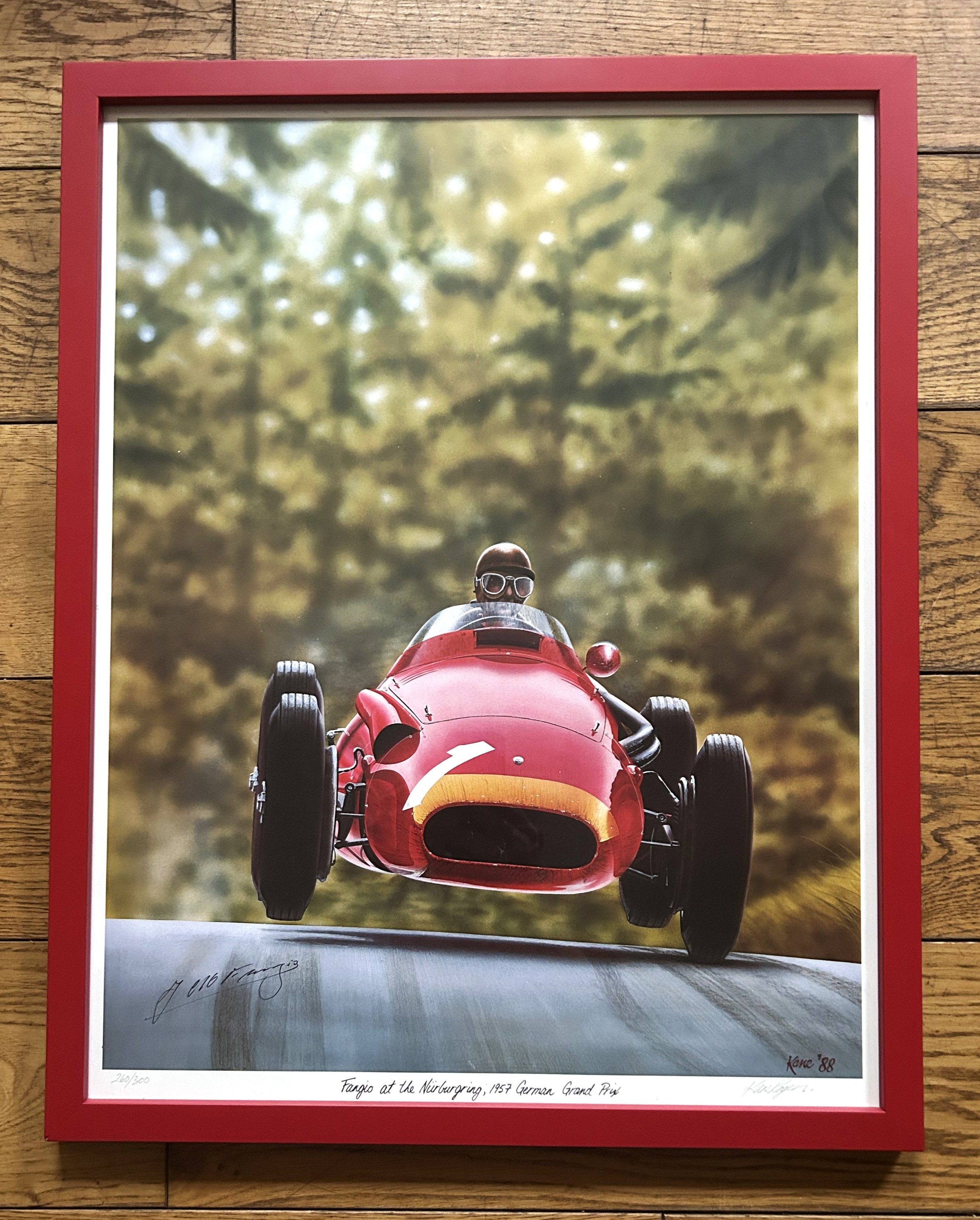 A signed, limited edition 260/300, depicting Fangio at speed over the brow of the hill at the Nurburgring in his Maserati 250F.