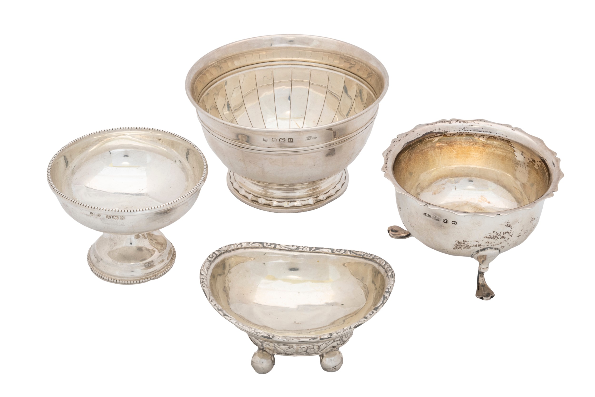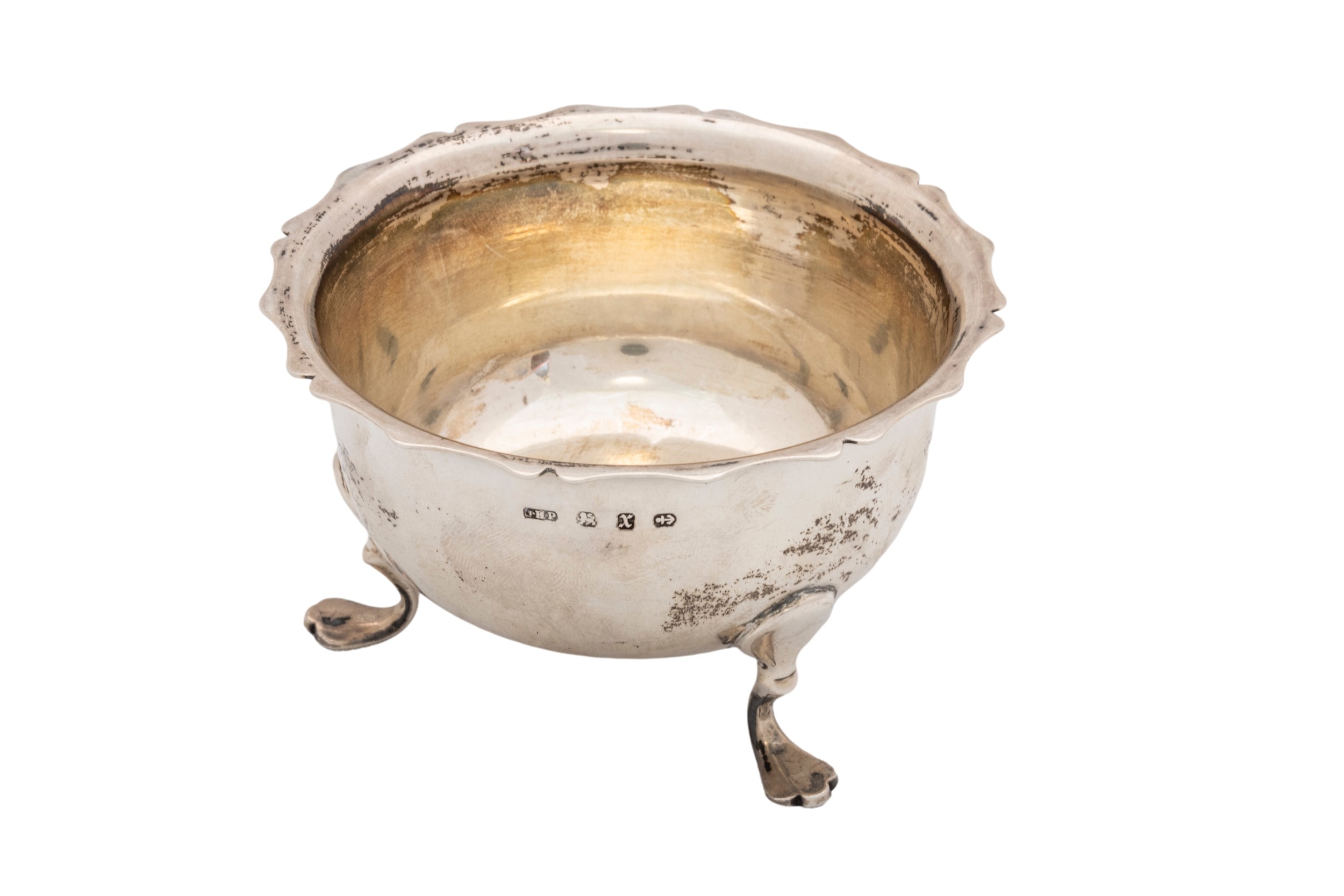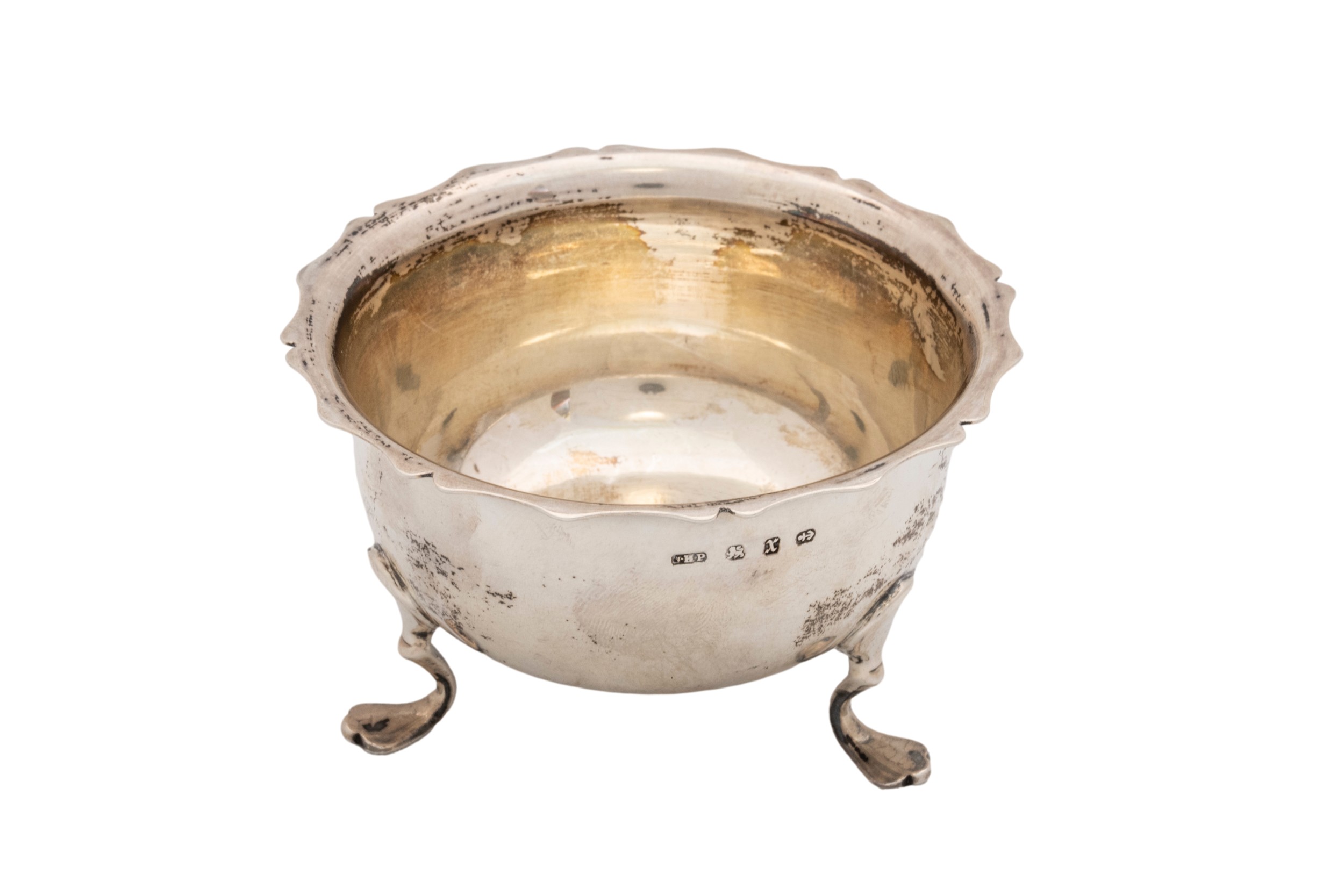 Birmingham, 1932, a small silver bowl with raised feet, an 800 standard silver salt and a small loaded silver bowl, approx. 240g weighable silver.