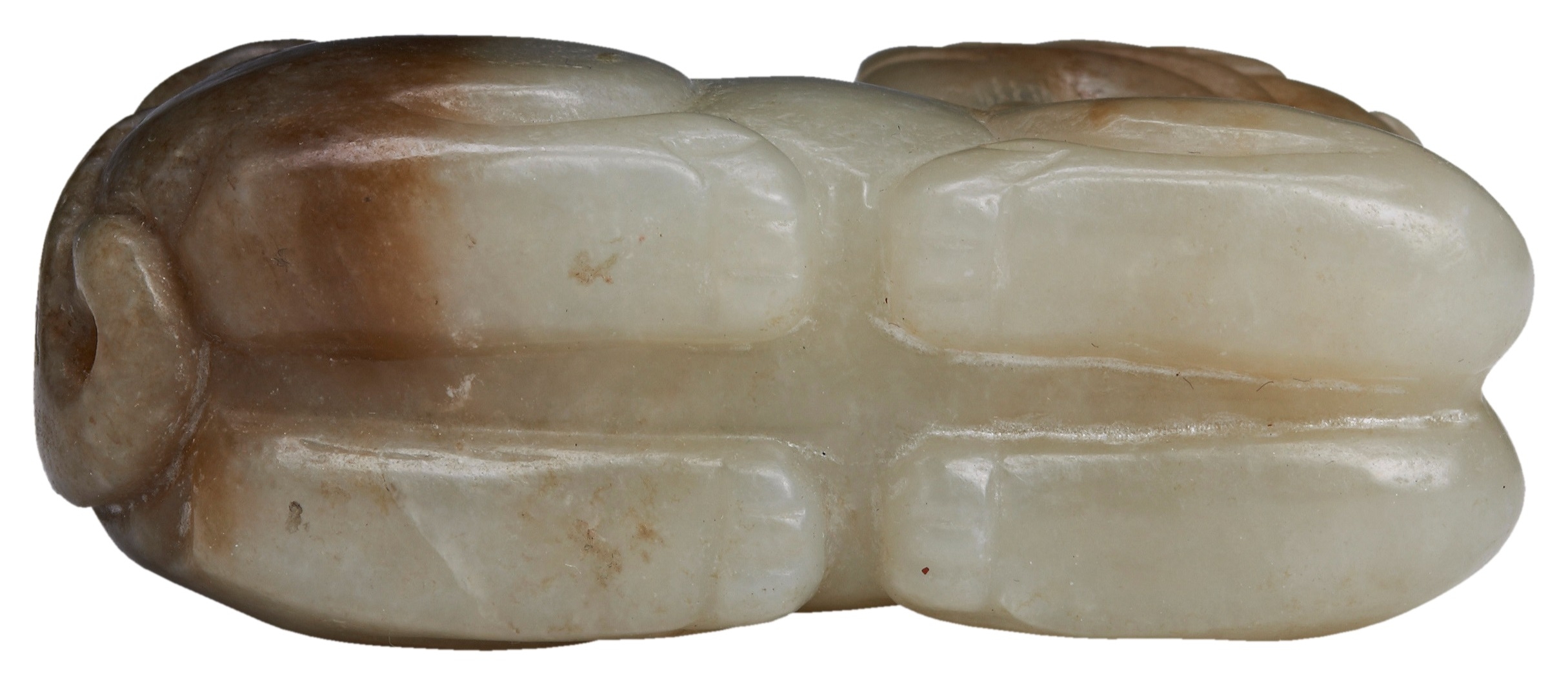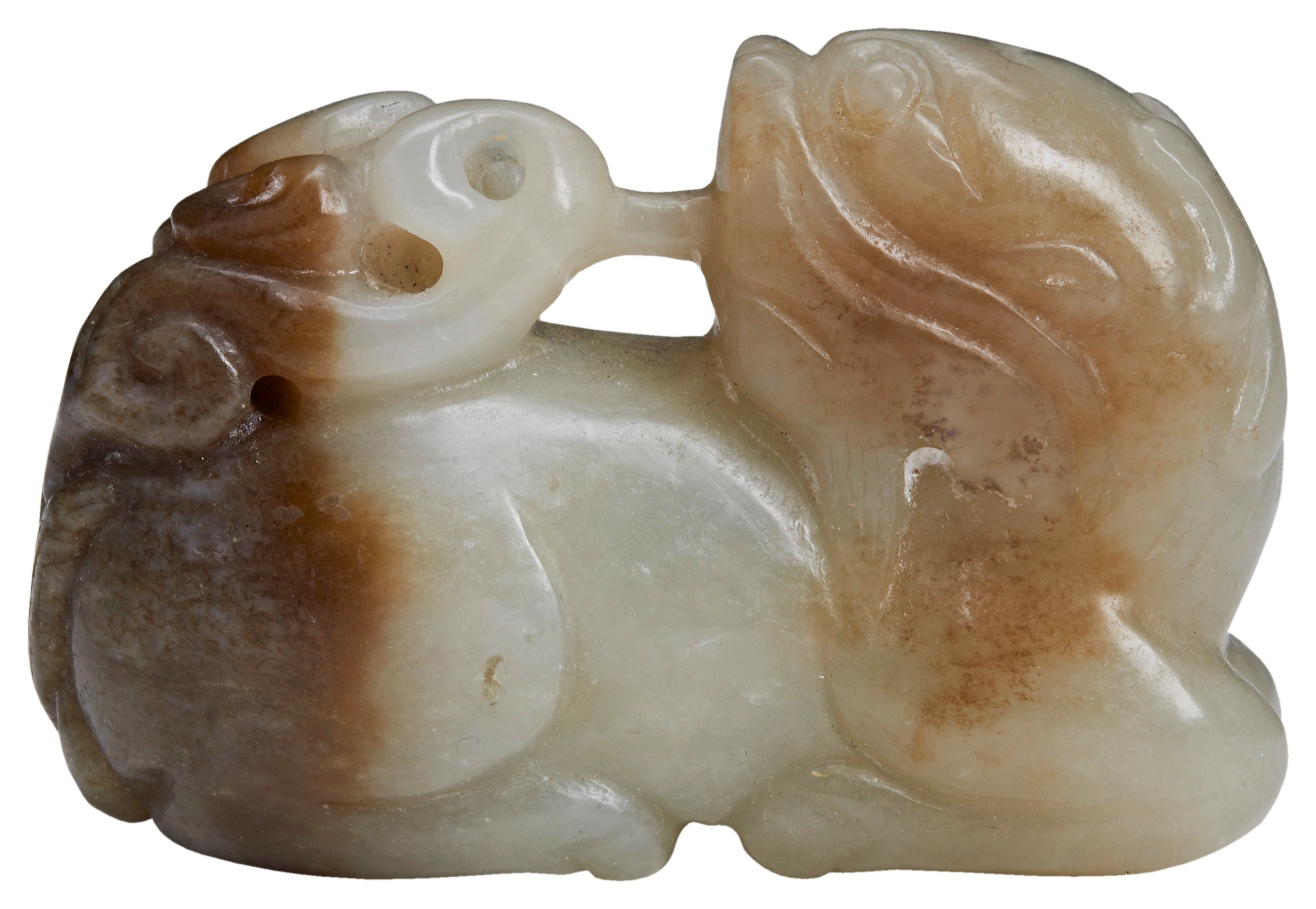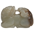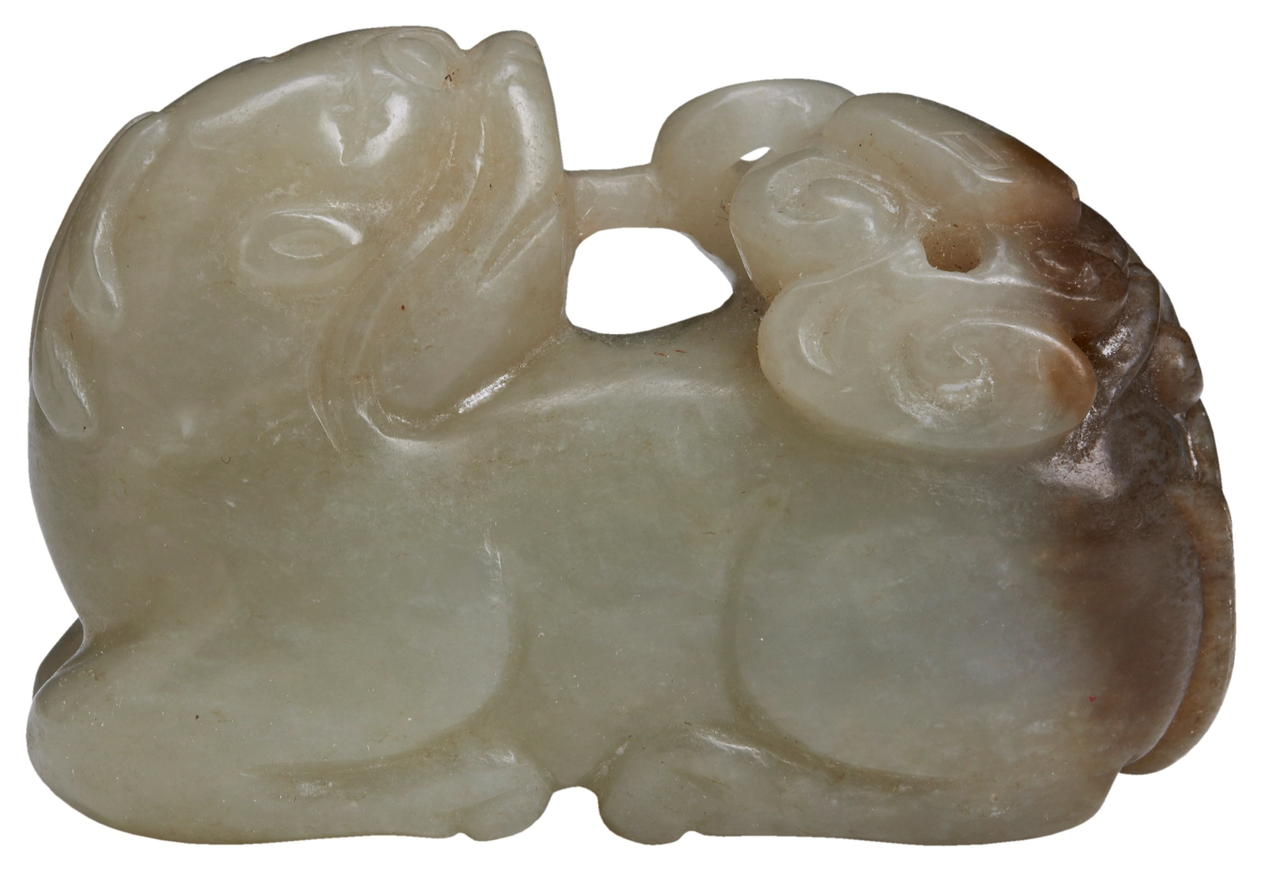 with two horns and head turned back, holding in its mouth an openwork ruyi-cloud supporting a book with upright trefoil tail, the four feet neatly tucked underneath, the stone pale celadon and slightly mottled on one side with russet hind quarters and tail.