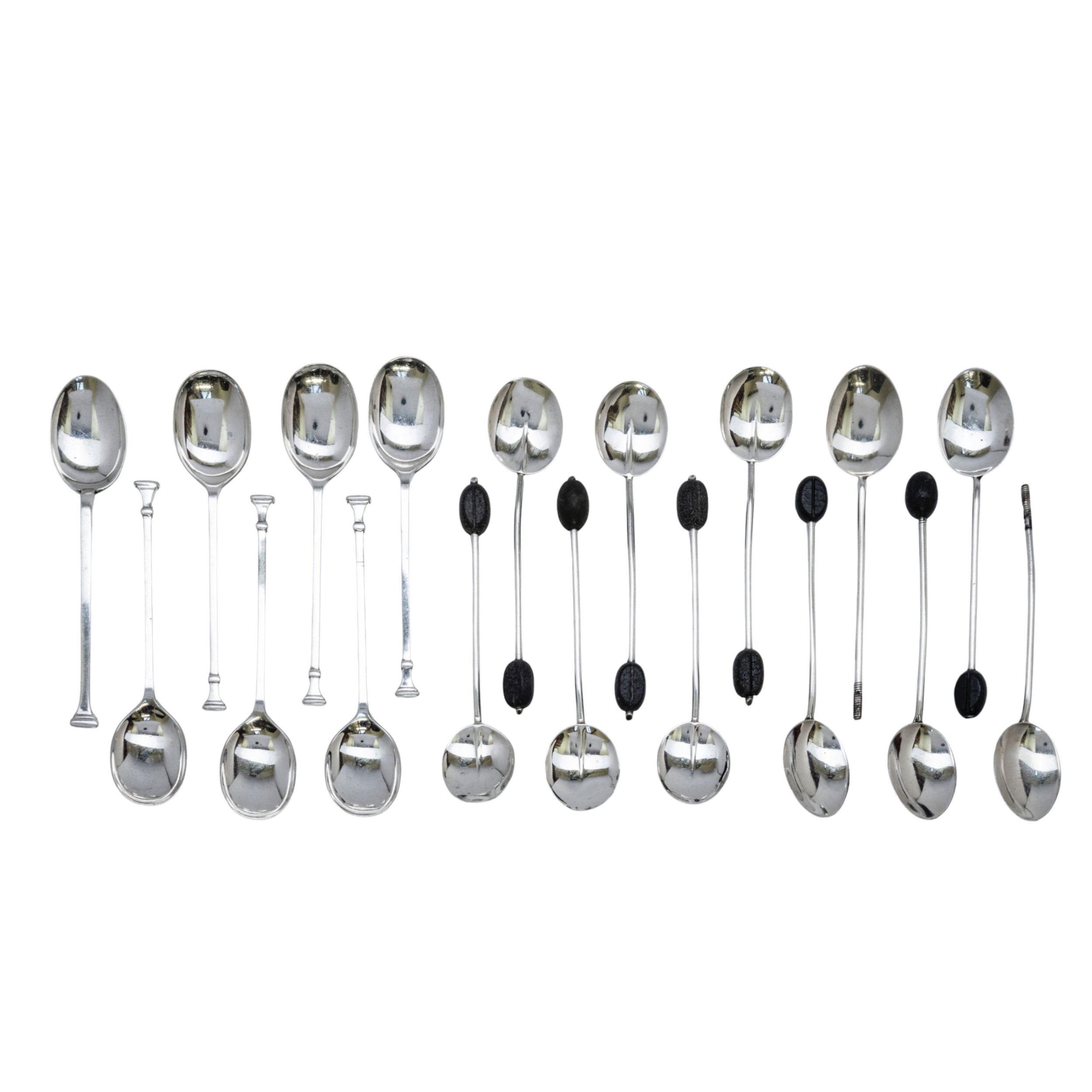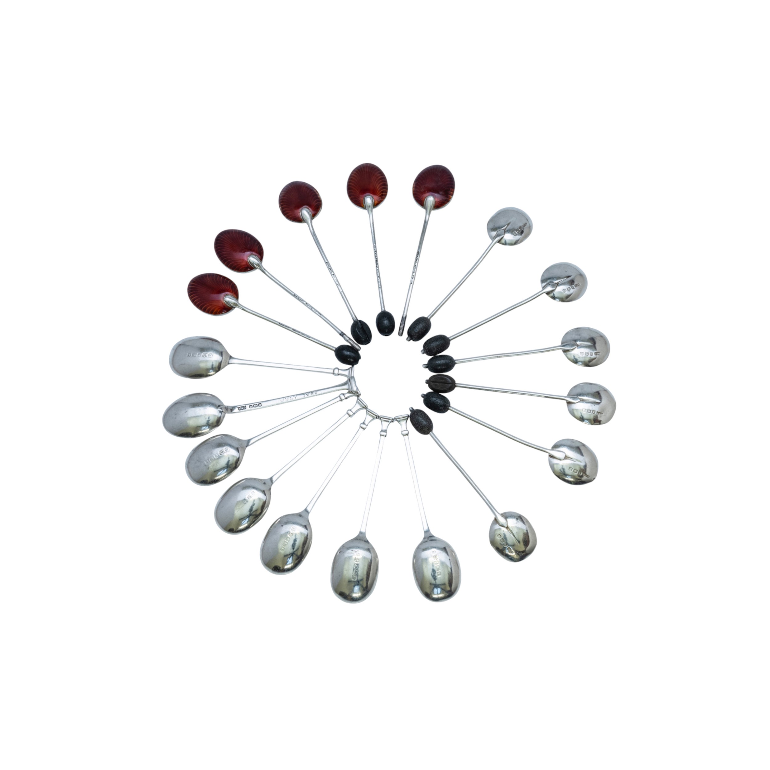 ELEVEN SILVER AND ENAMEL COFFEE SPOONS