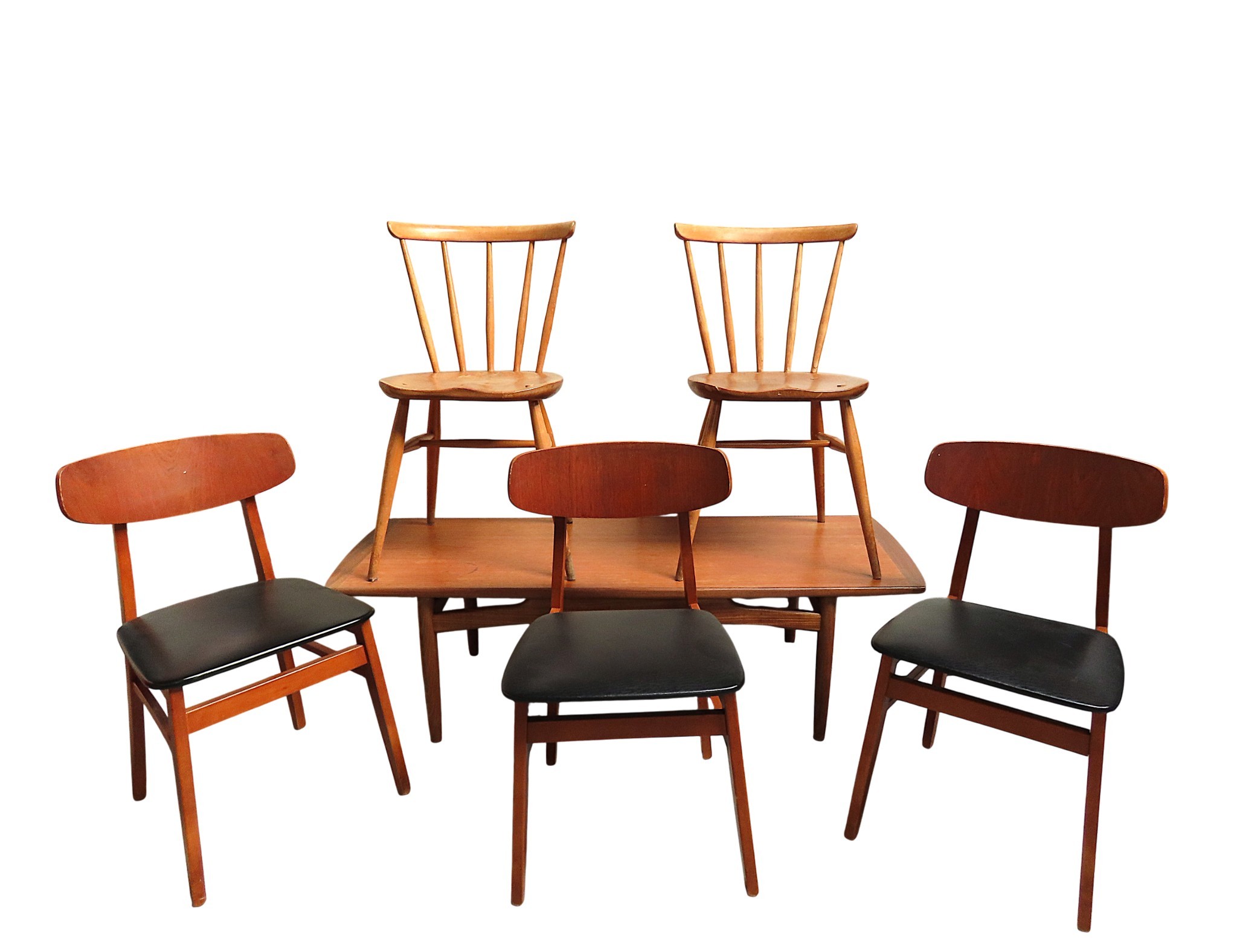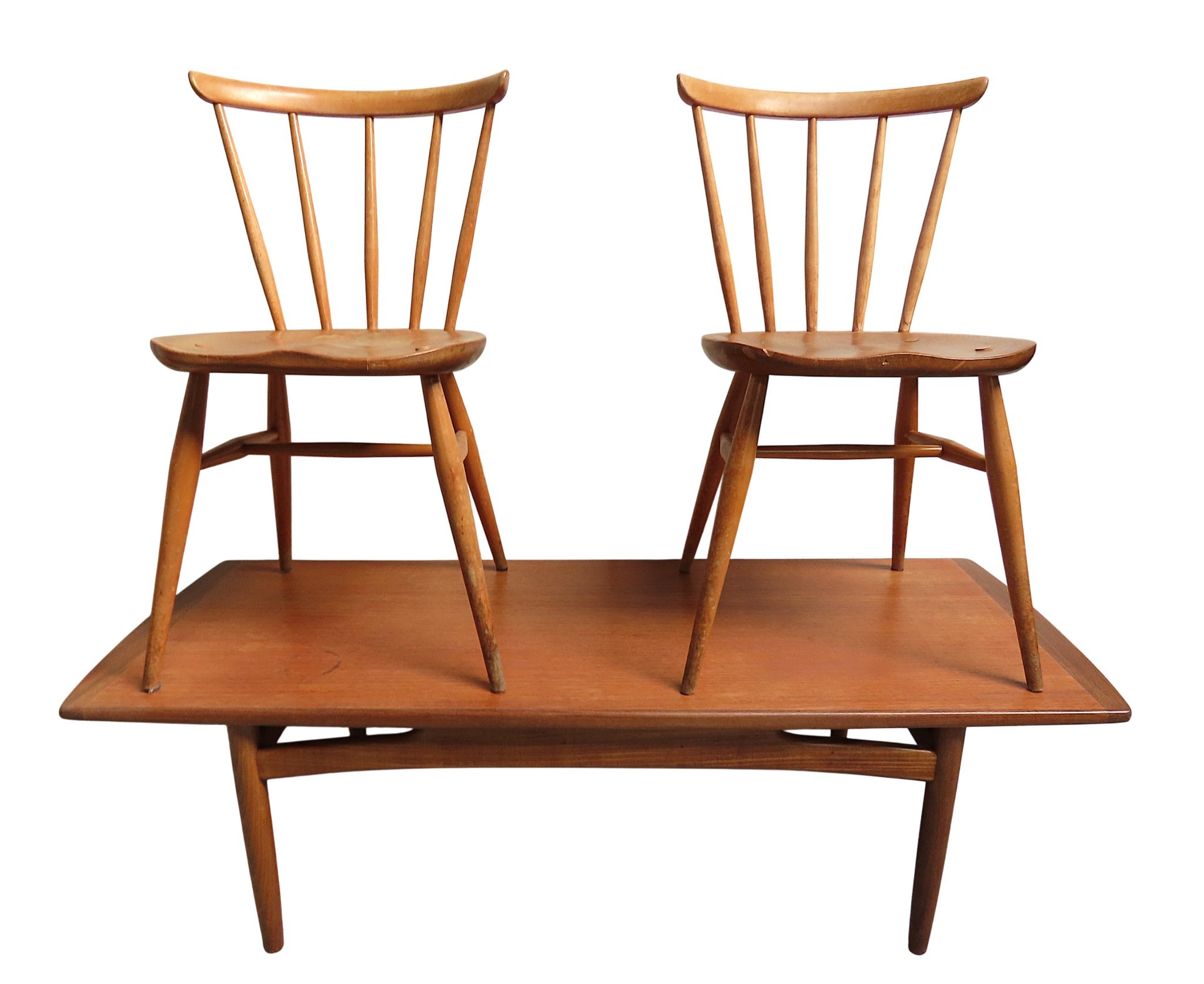 TWO ERCOL SPINDLE BACK CHAIRS AND A MID CENTURY COFFEE TABLE