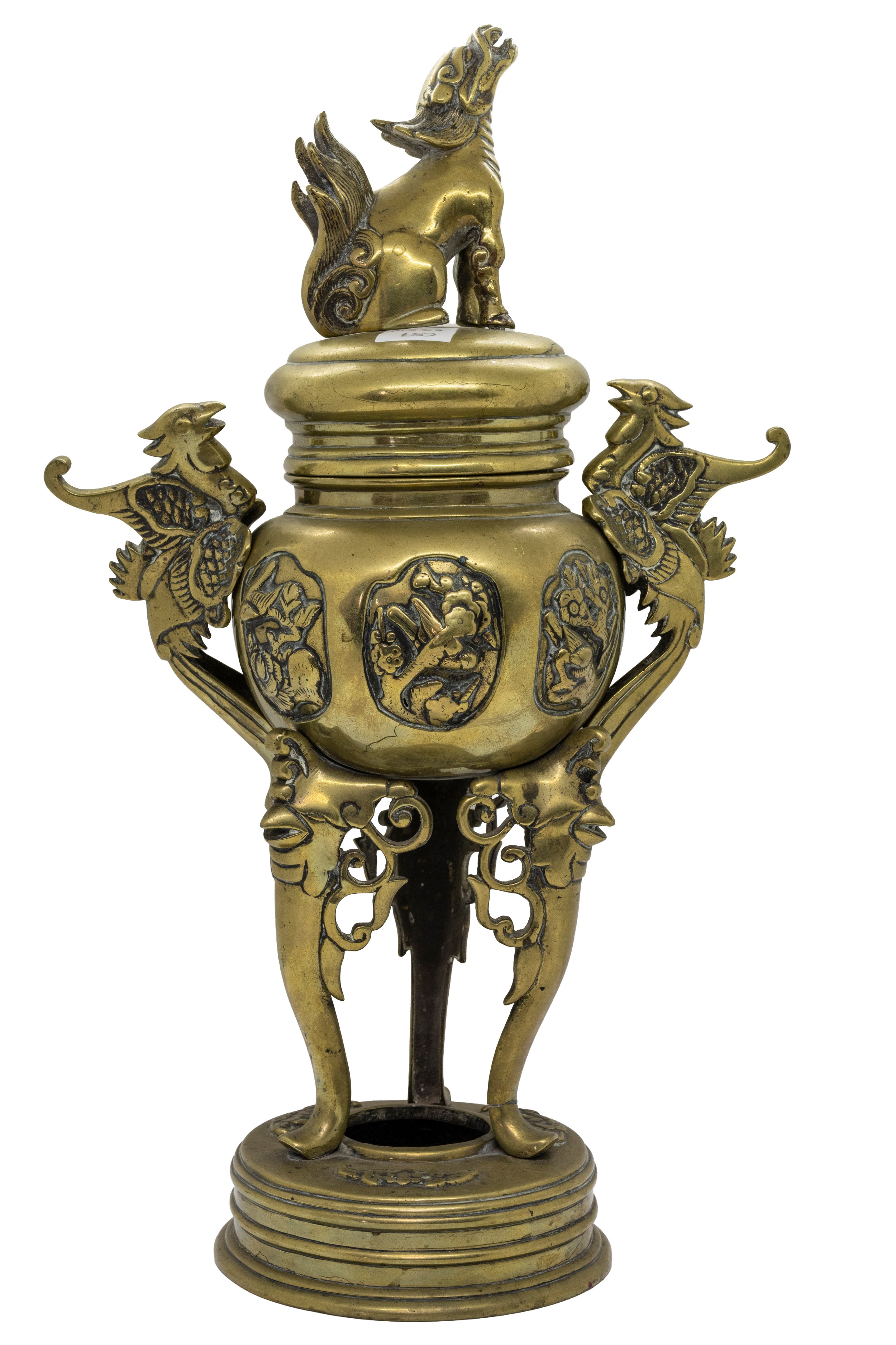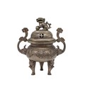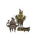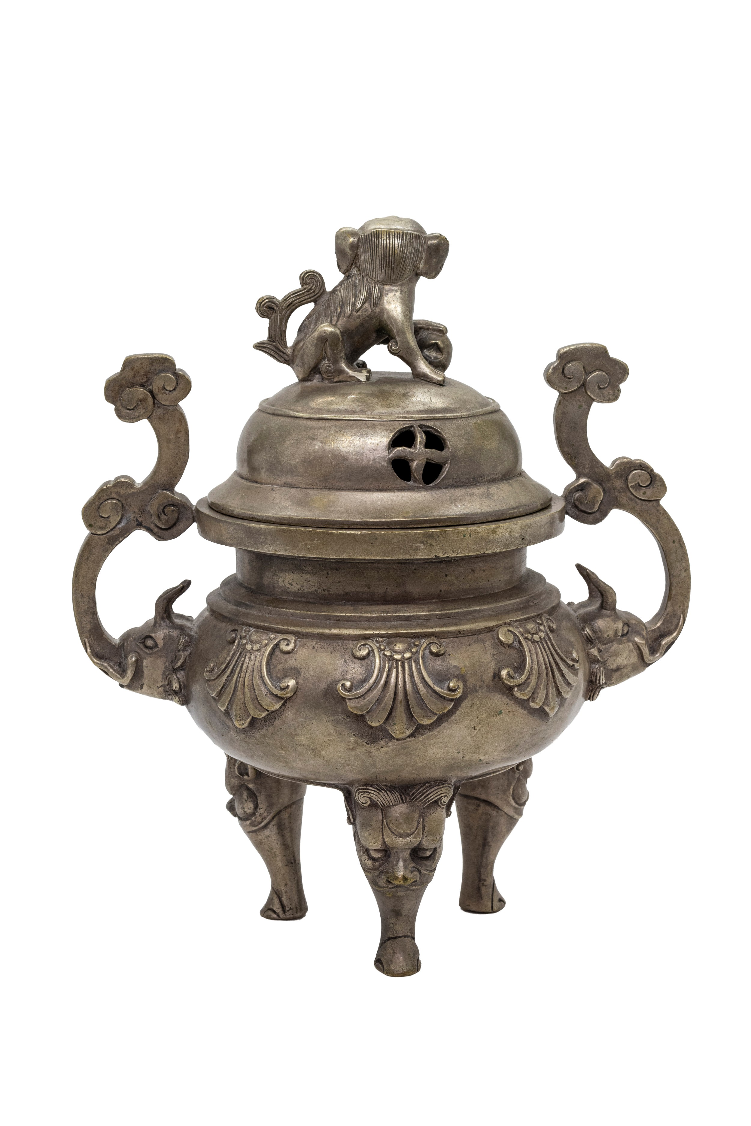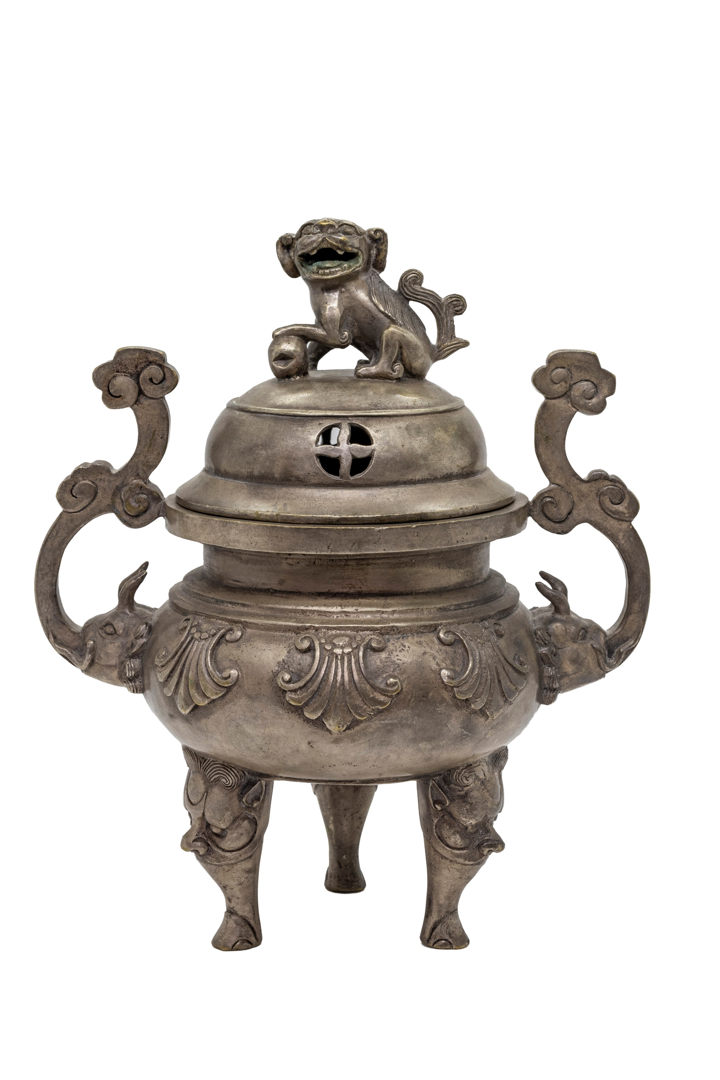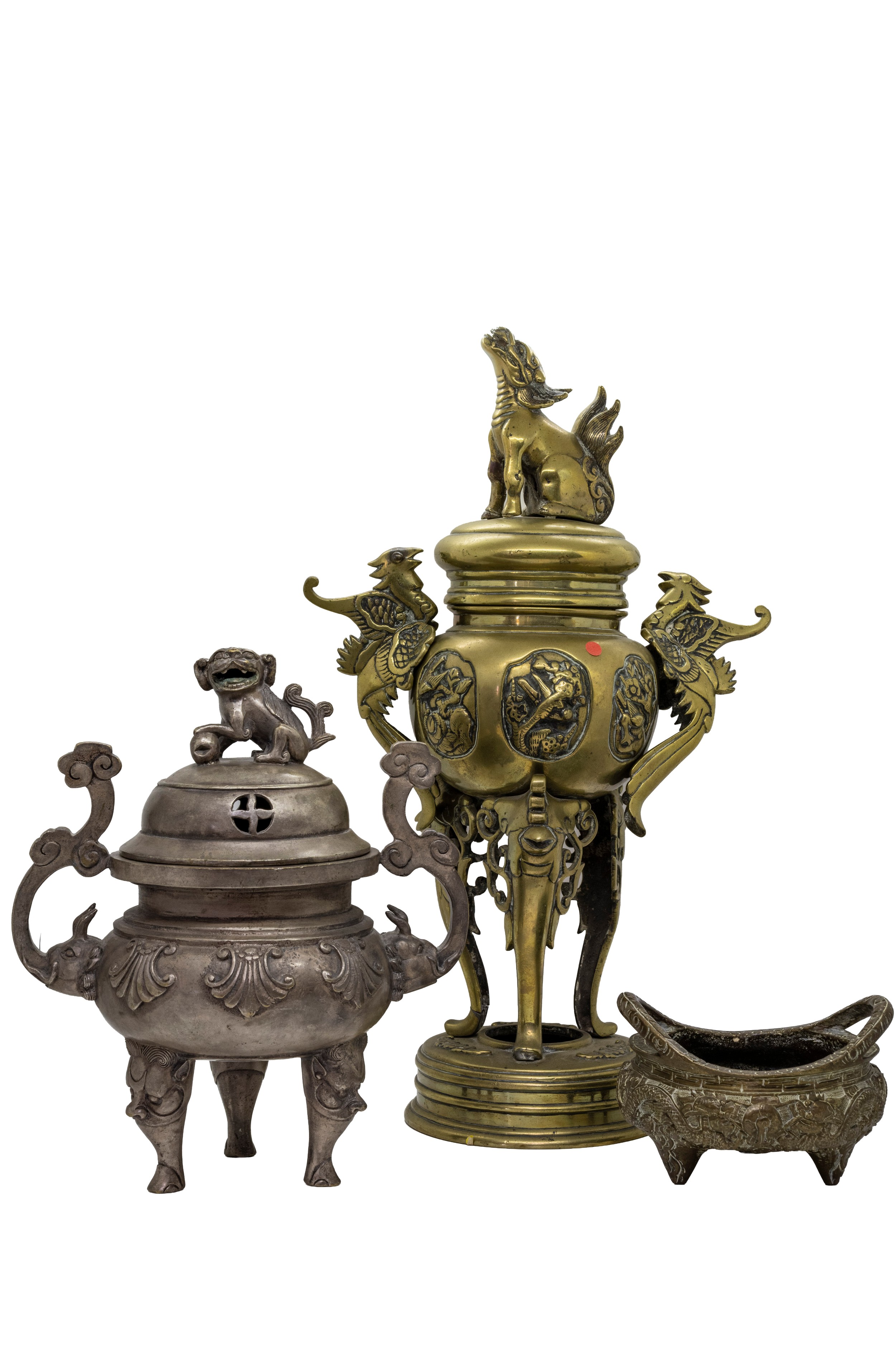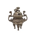 39cm high; together with A CAST BRONZE 'DRAGON' TRIPOD CENSER, AND A SILVERED-METAL TRIPOD CENSER AND COVER (3)