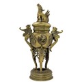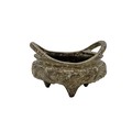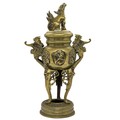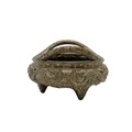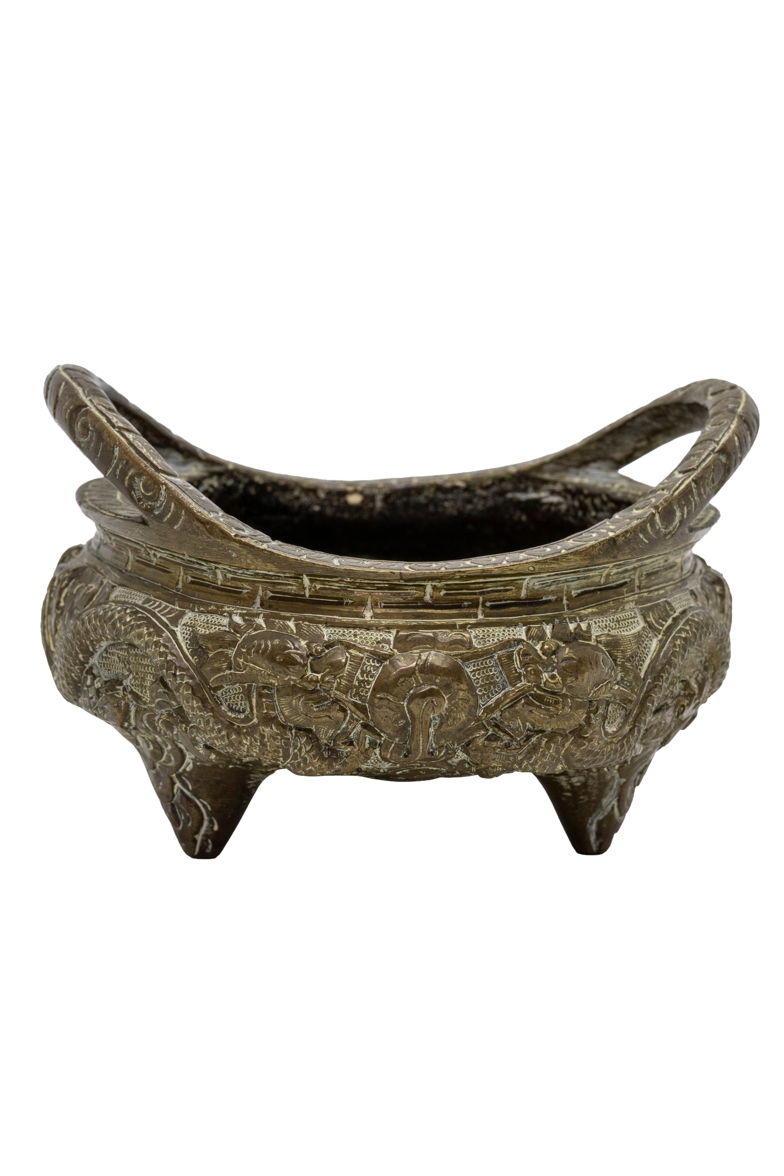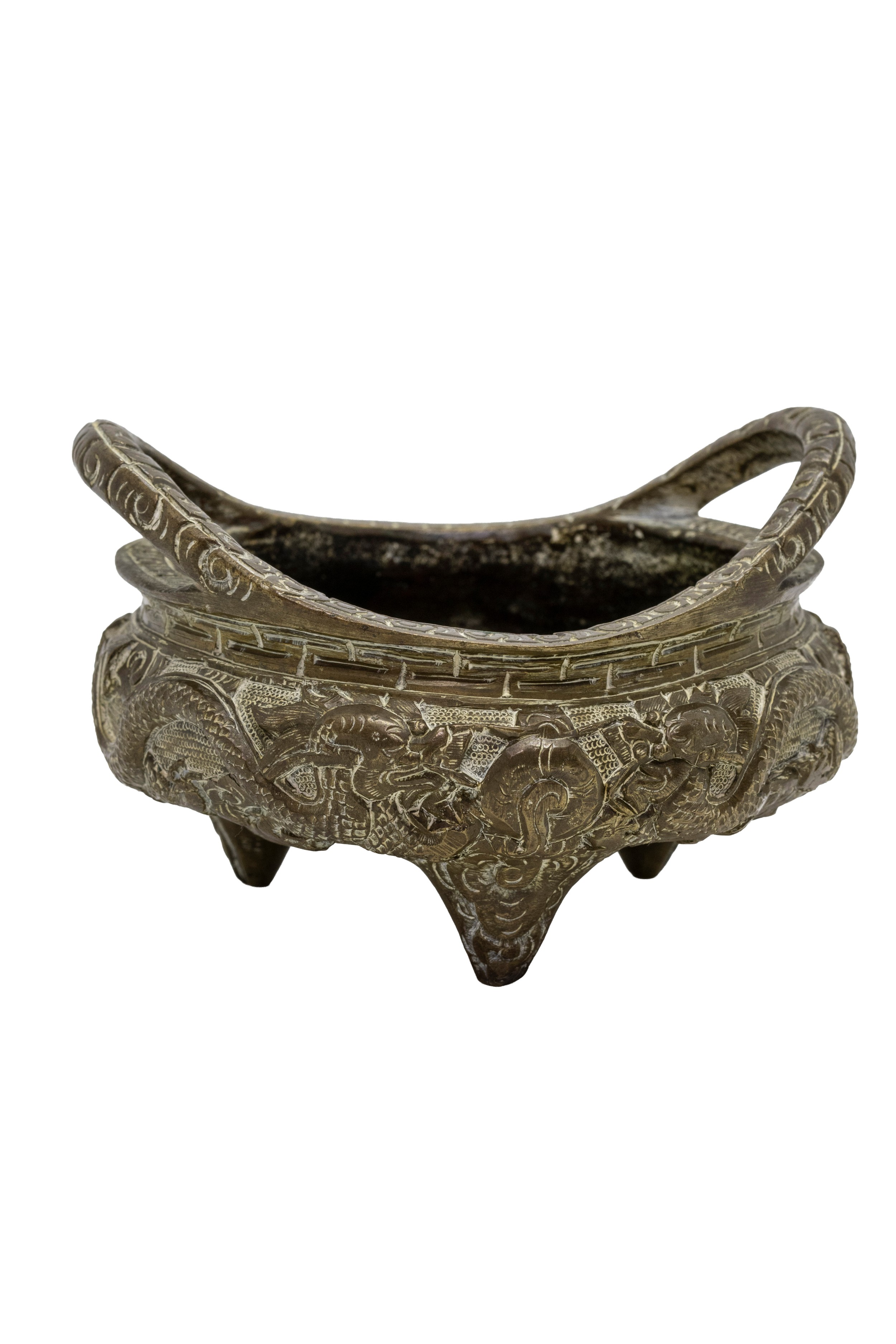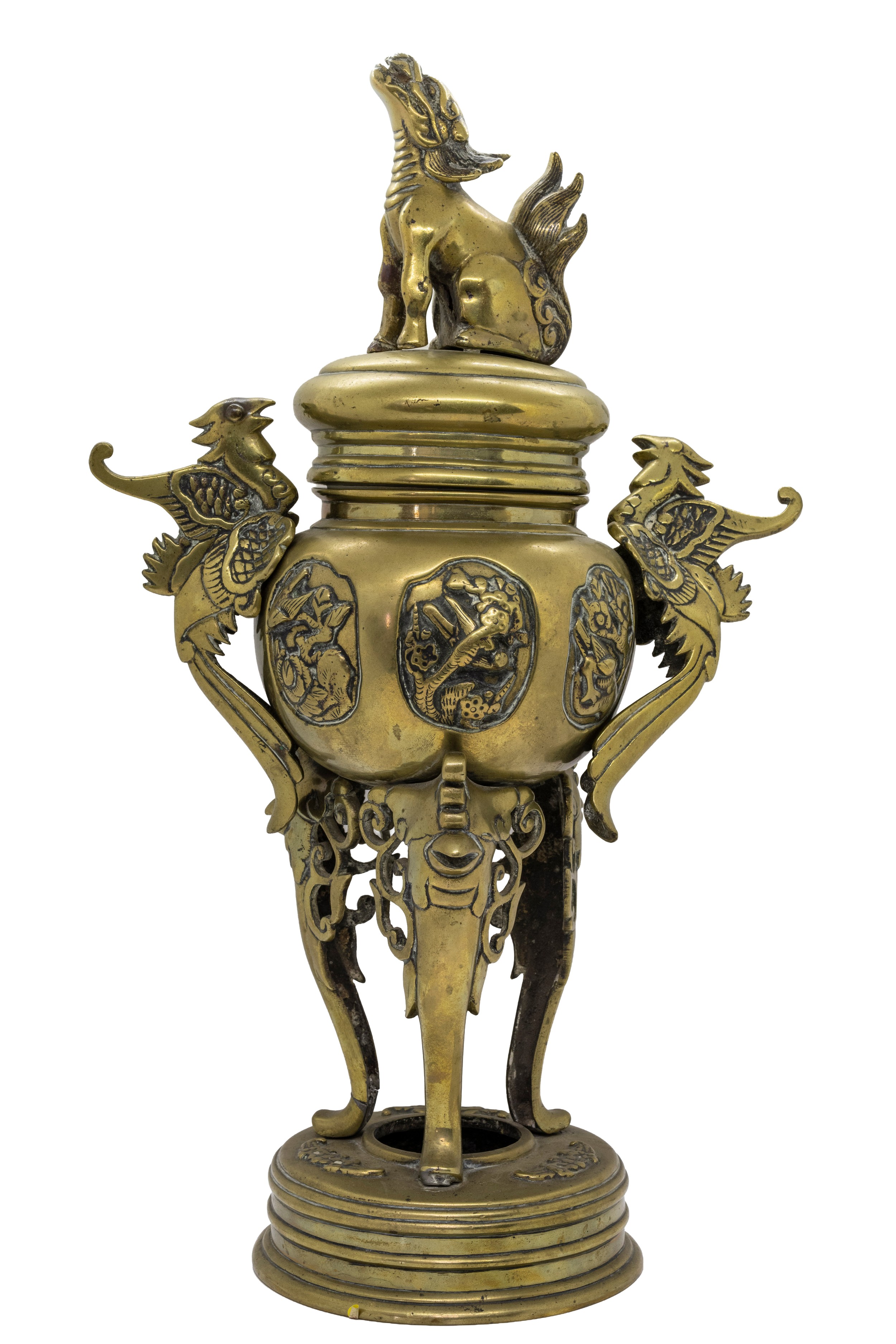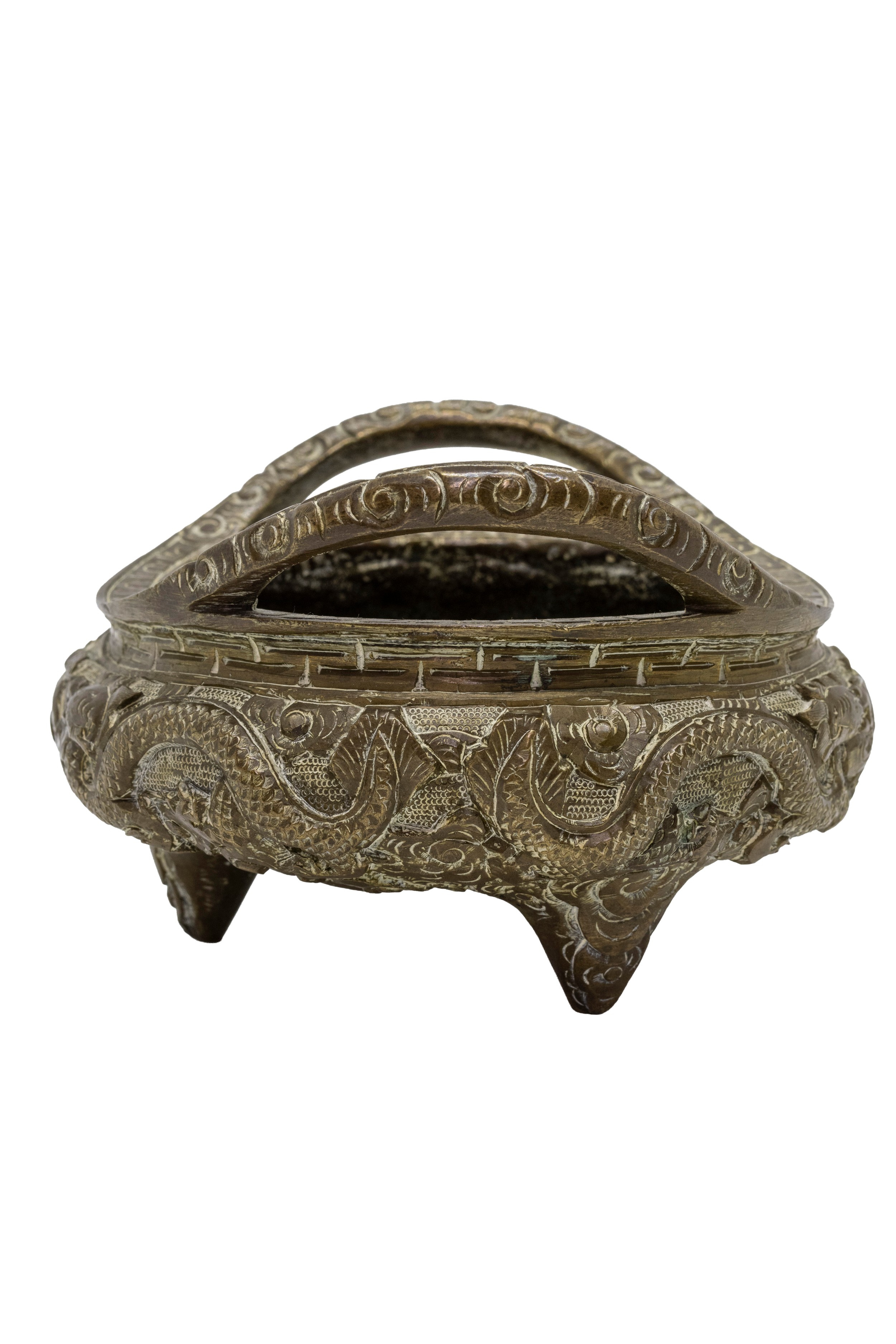 39cm high; together with A CAST BRONZE 'DRAGON' TRIPOD CENSER, AND A SILVERED-METAL TRIPOD CENSER AND COVER (3)