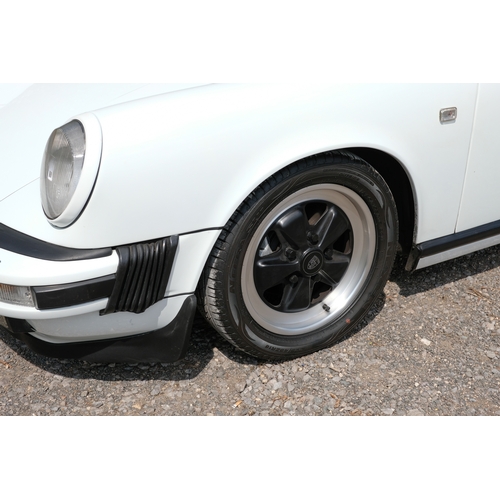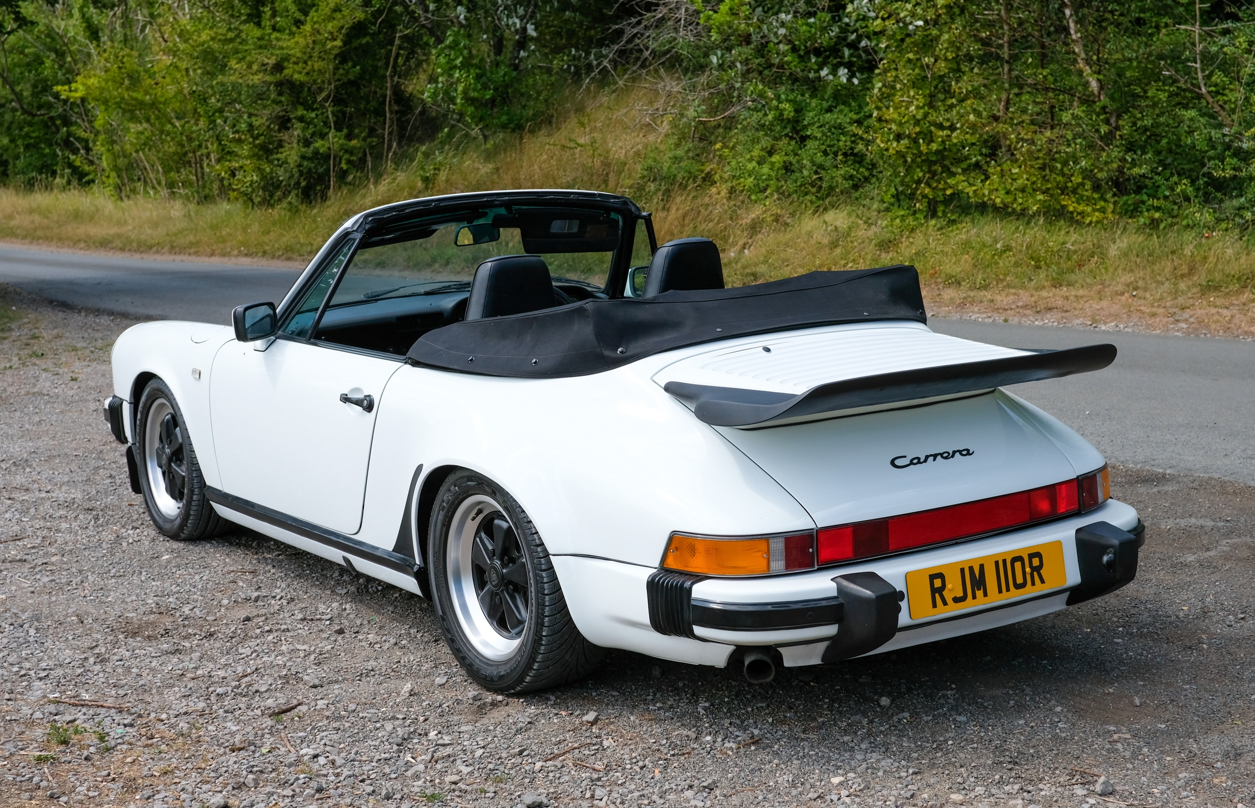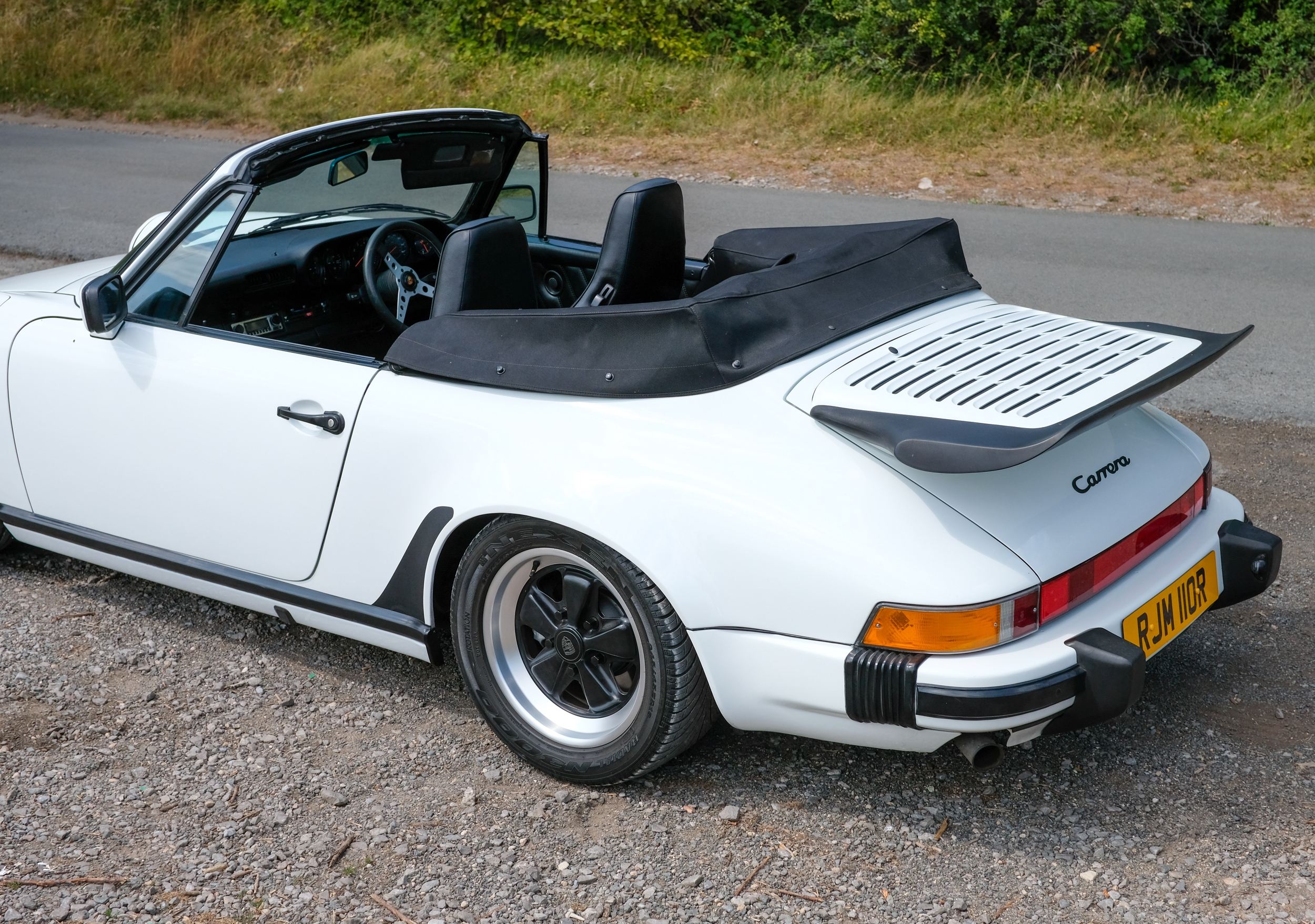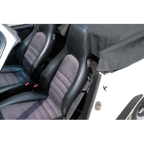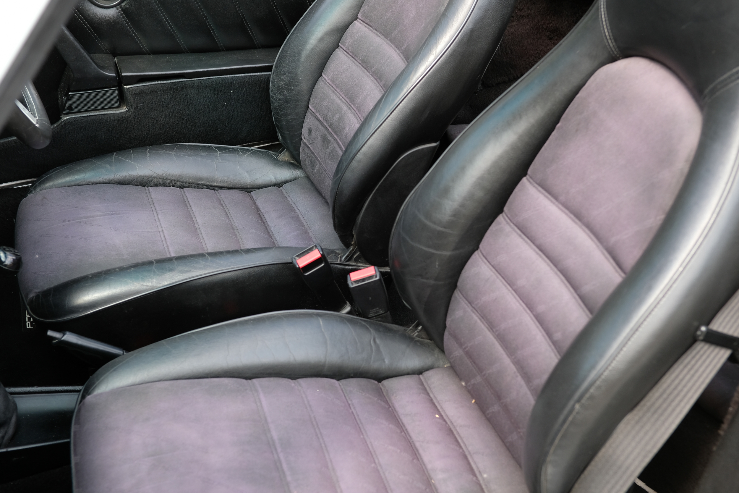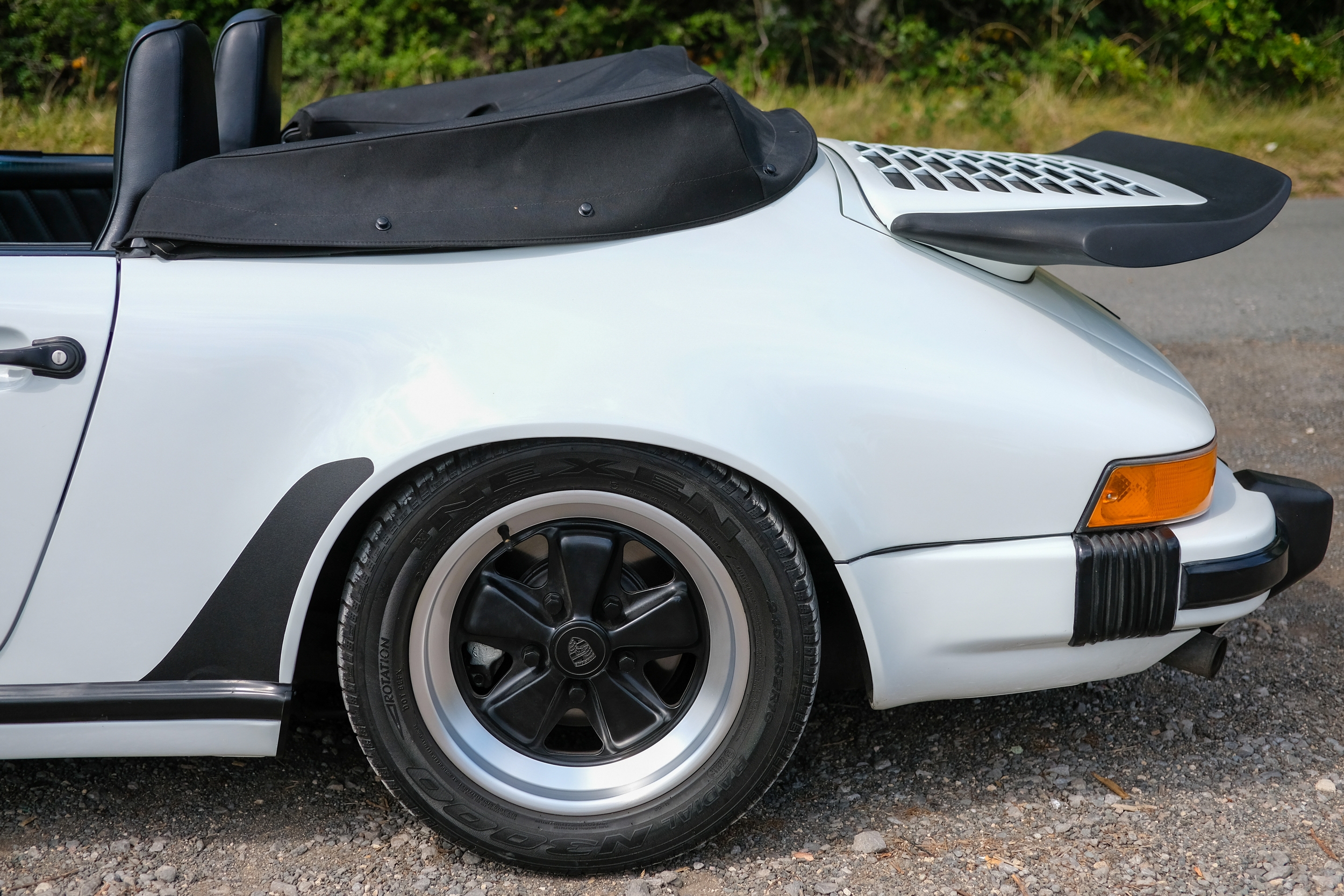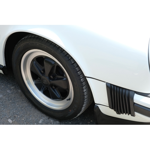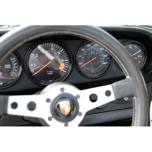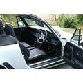 The factory 16-inch Fuchs alloy wheels with black centres and anodised rims remain in excellent condition, paired with front rubber lip spoiler and the signature ‘whale tail’ rear spoiler - a combination that not only completes the period look but also contributes to improved high-speed stability. Inside, the car features factory leather/cloth sports seats, black leather door cards, and original black carpets. The black canvas hood remains in good condition with only light creasing from stowage, and has reportedly never been used by the vendor, with the car exclusively used in dry conditions.