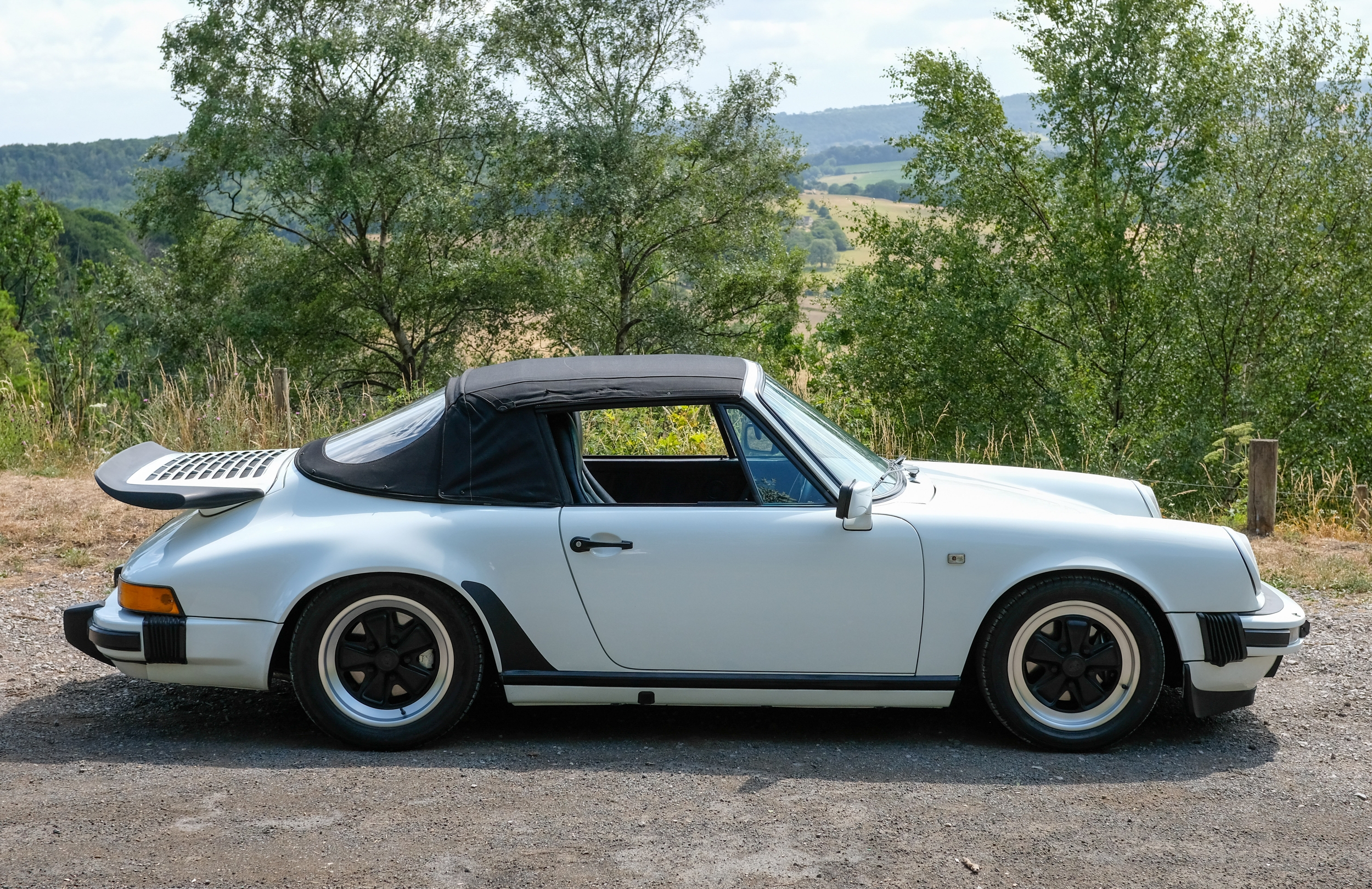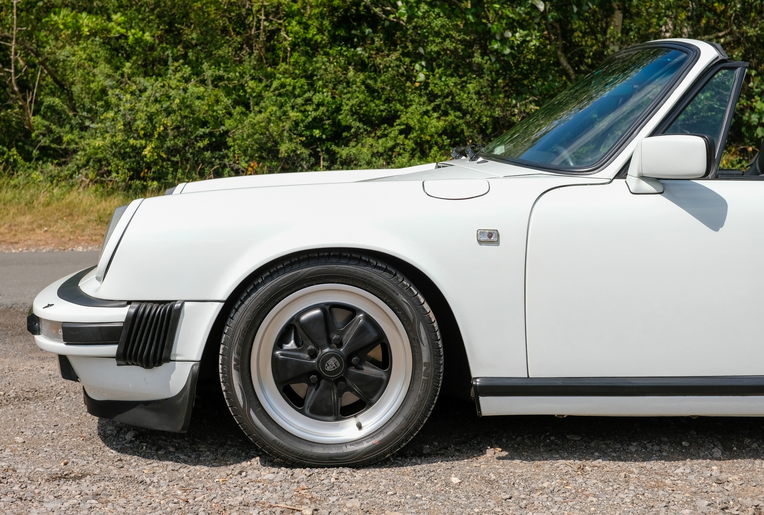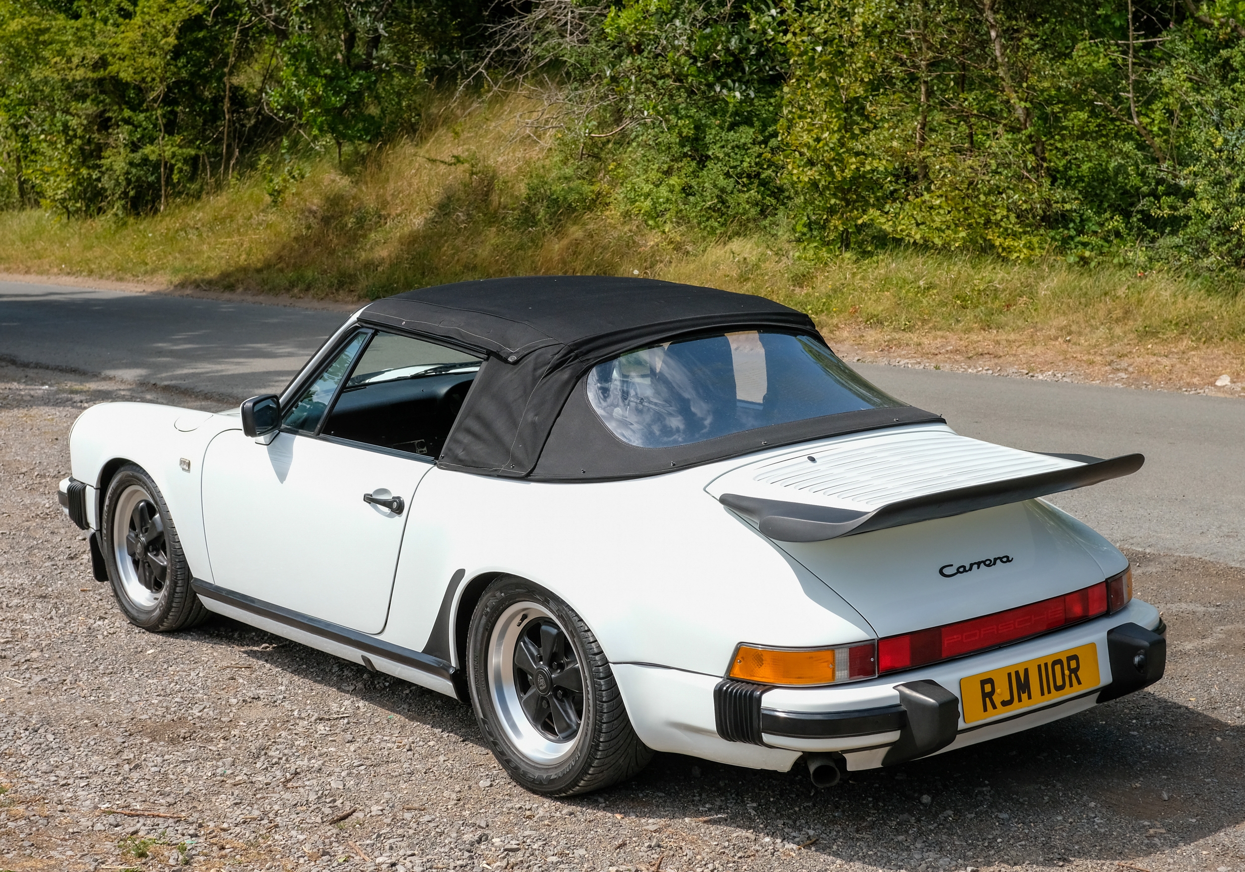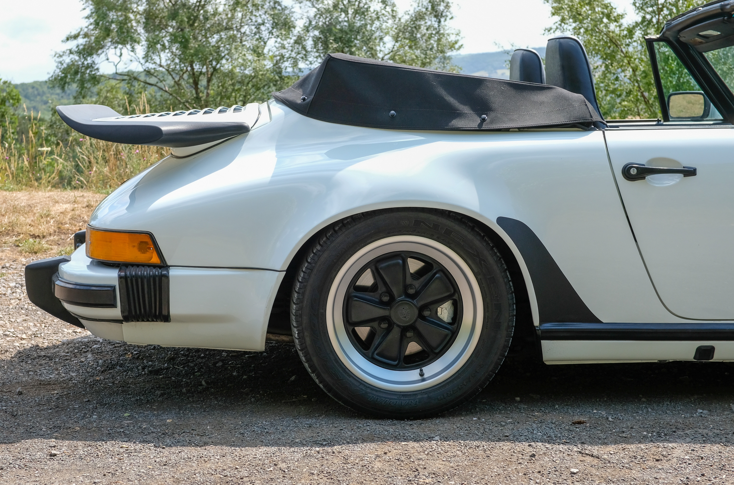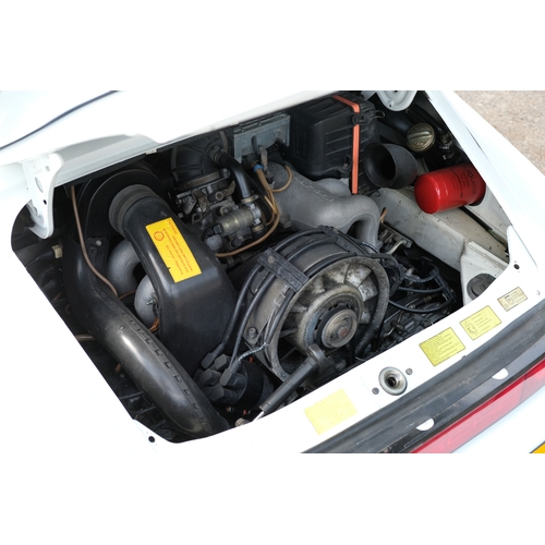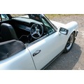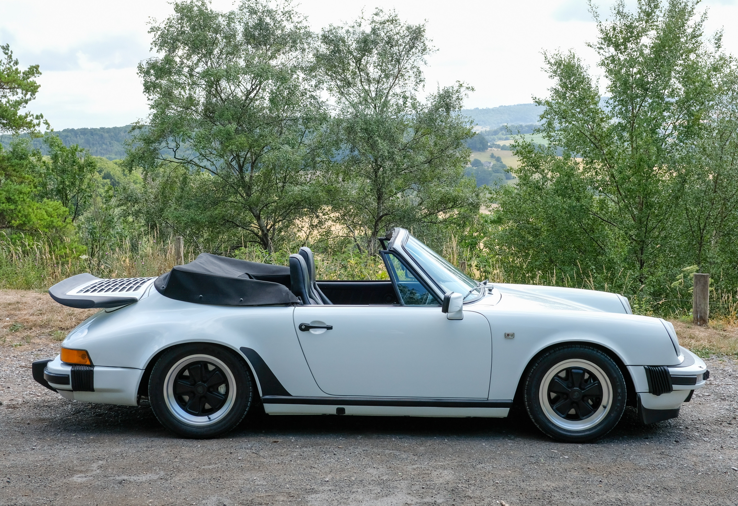 The factory 16-inch Fuchs alloy wheels with black centres and anodised rims remain in excellent condition, paired with front rubber lip spoiler and the signature ‘whale tail’ rear spoiler - a combination that not only completes the period look but also contributes to improved high-speed stability. Inside, the car features factory leather/cloth sports seats, black leather door cards, and original black carpets. The black canvas hood remains in good condition with only light creasing from stowage, and has reportedly never been used by the vendor, with the car exclusively used in dry conditions.