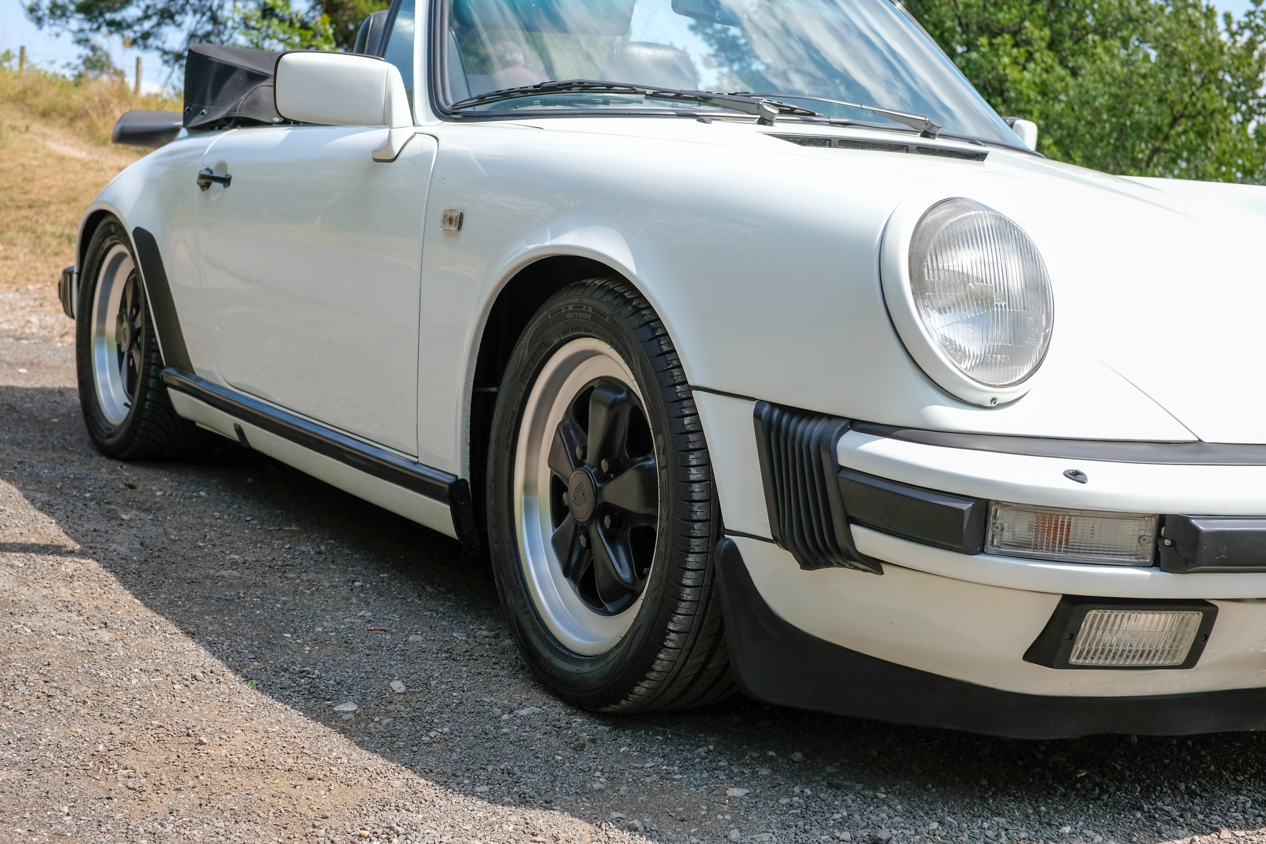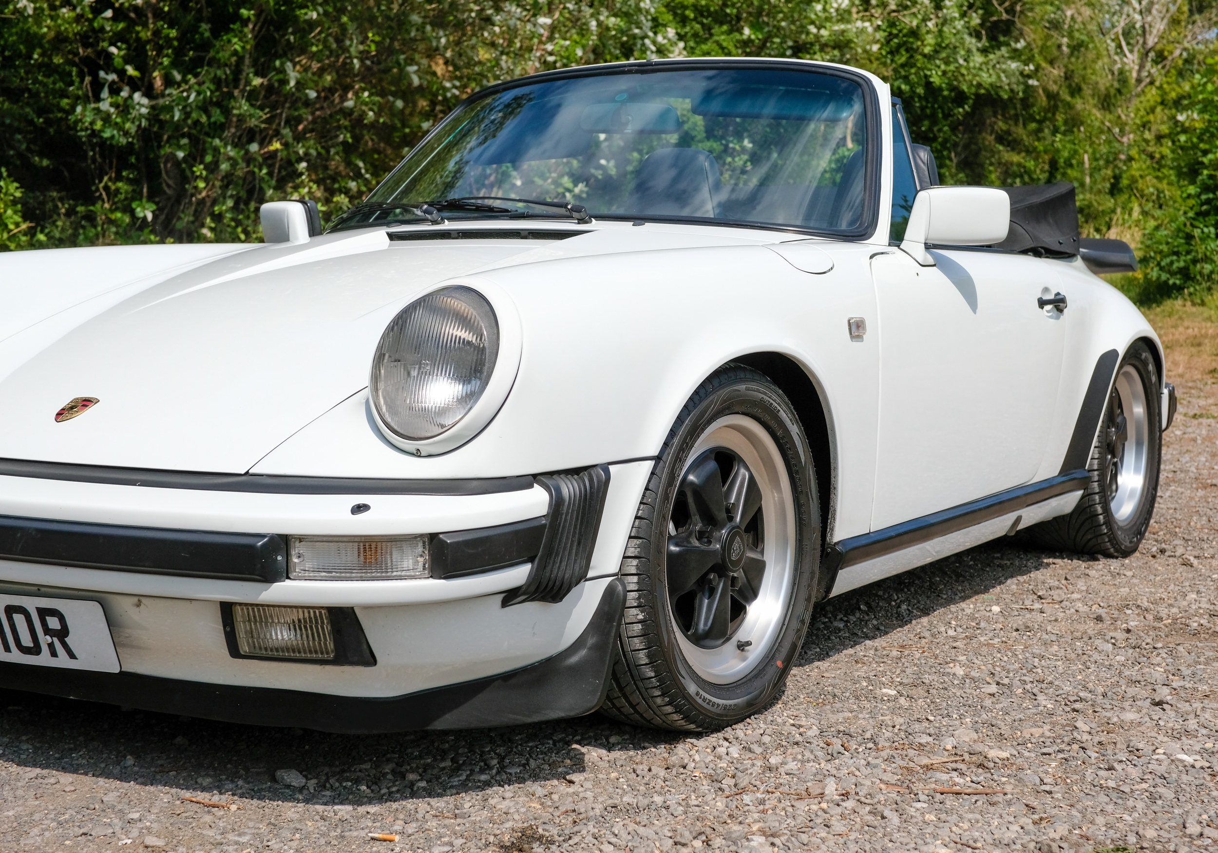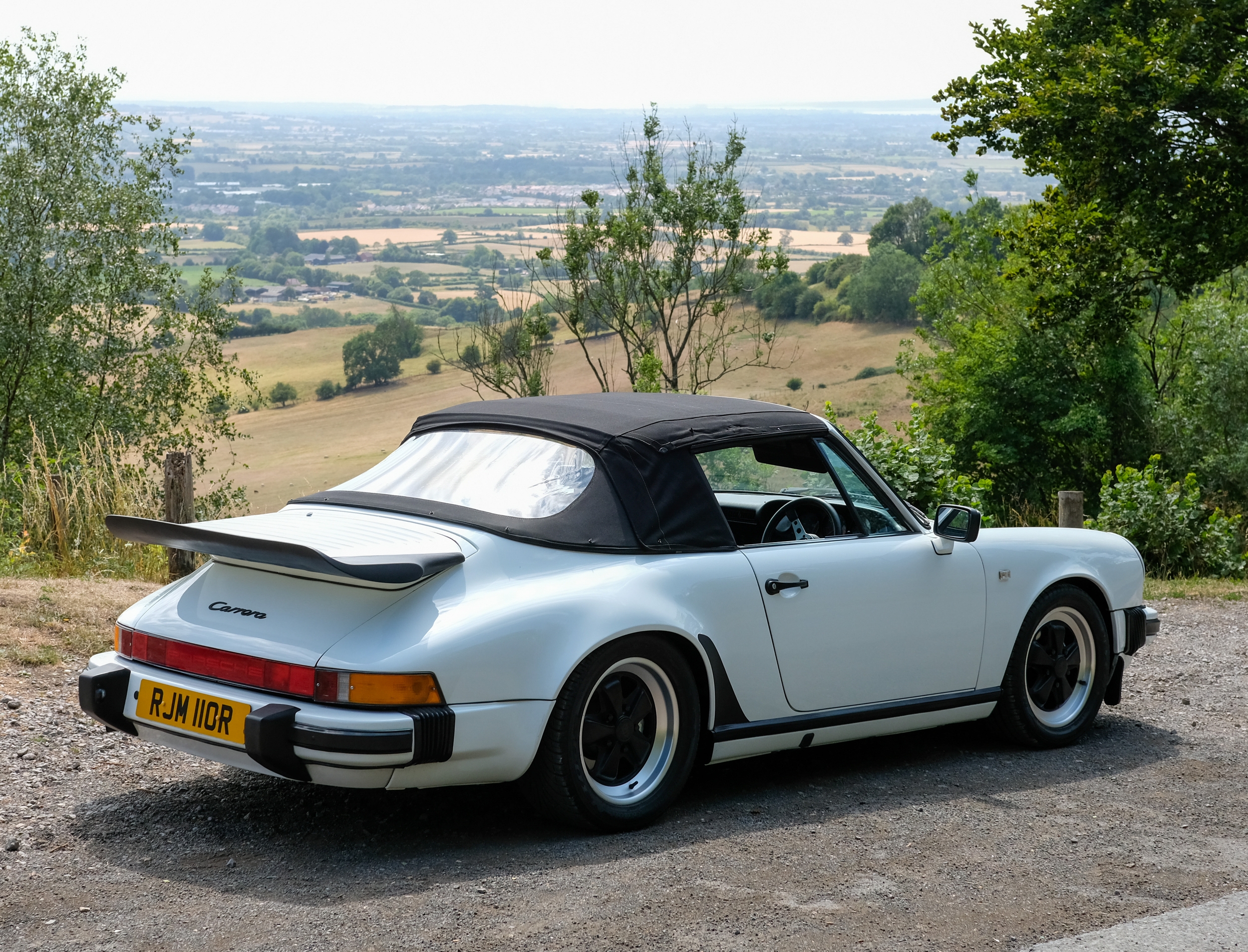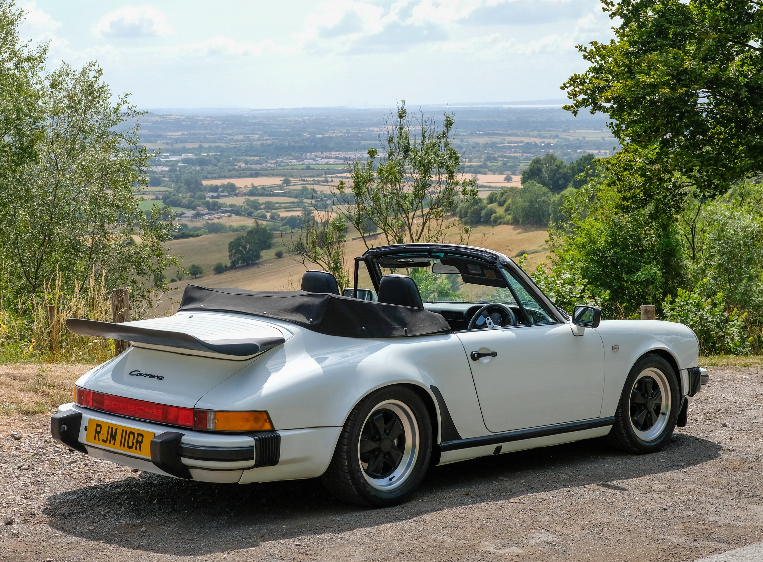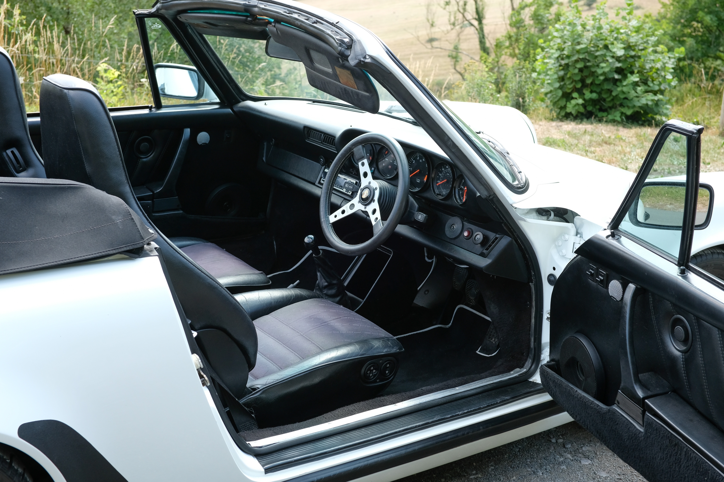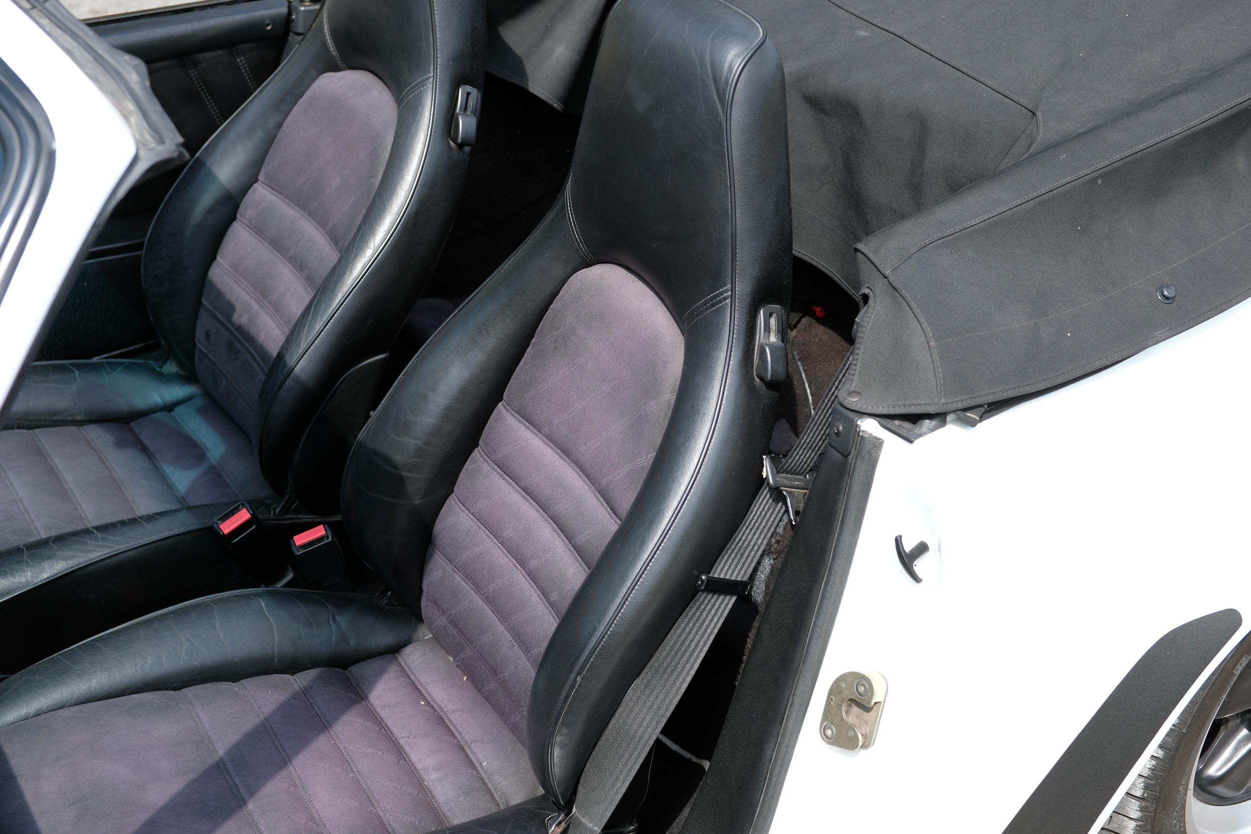 The factory 16-inch Fuchs alloy wheels with black centres and anodised rims remain in excellent condition, paired with front rubber lip spoiler and the signature ‘whale tail’ rear spoiler - a combination that not only completes the period look but also contributes to improved high-speed stability. Inside, the car features factory leather/cloth sports seats, black leather door cards, and original black carpets. The black canvas hood remains in good condition with only light creasing from stowage, and has reportedly never been used by the vendor, with the car exclusively used in dry conditions.