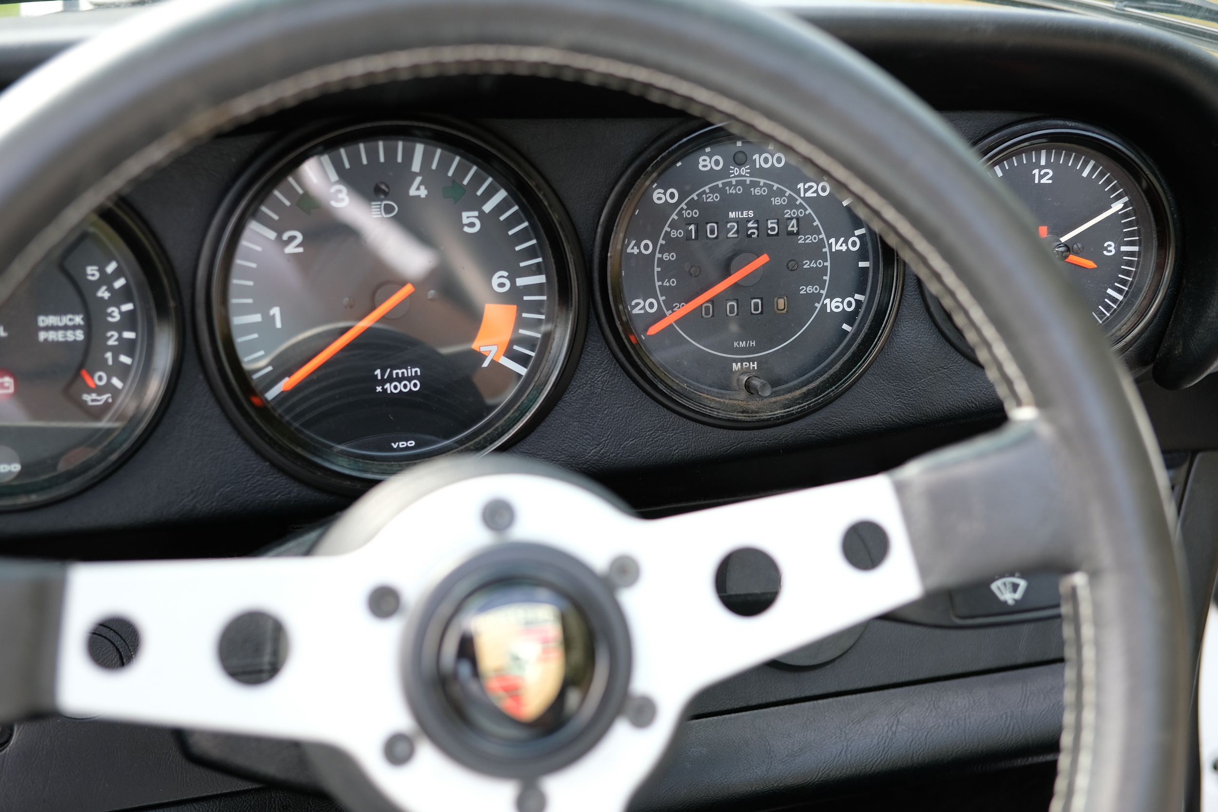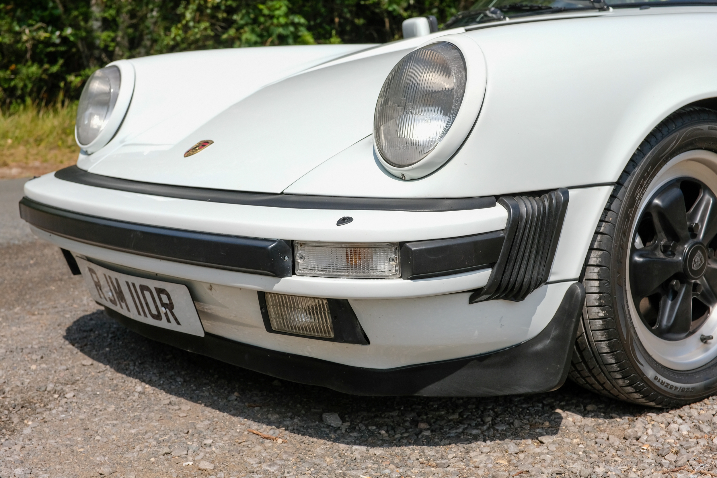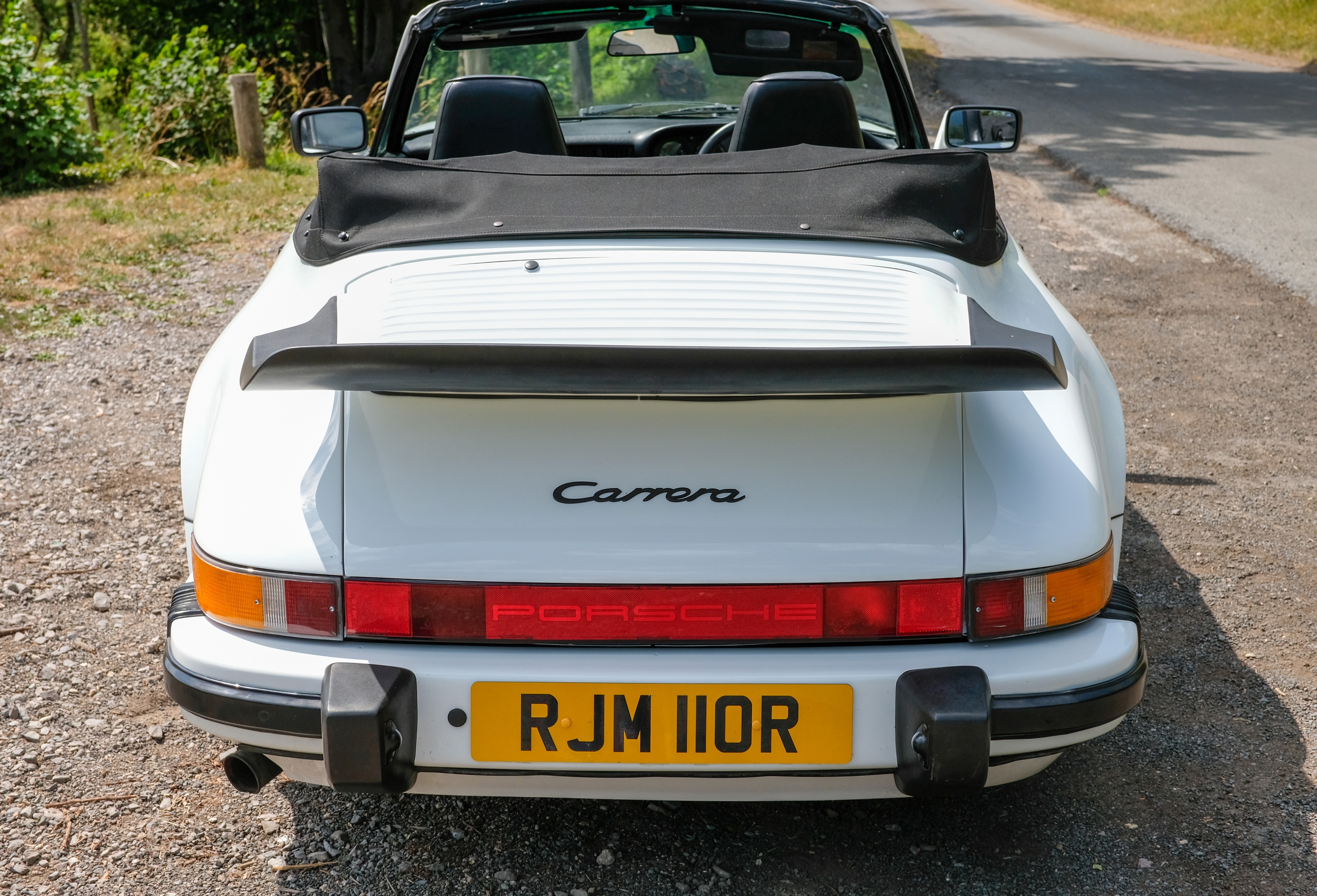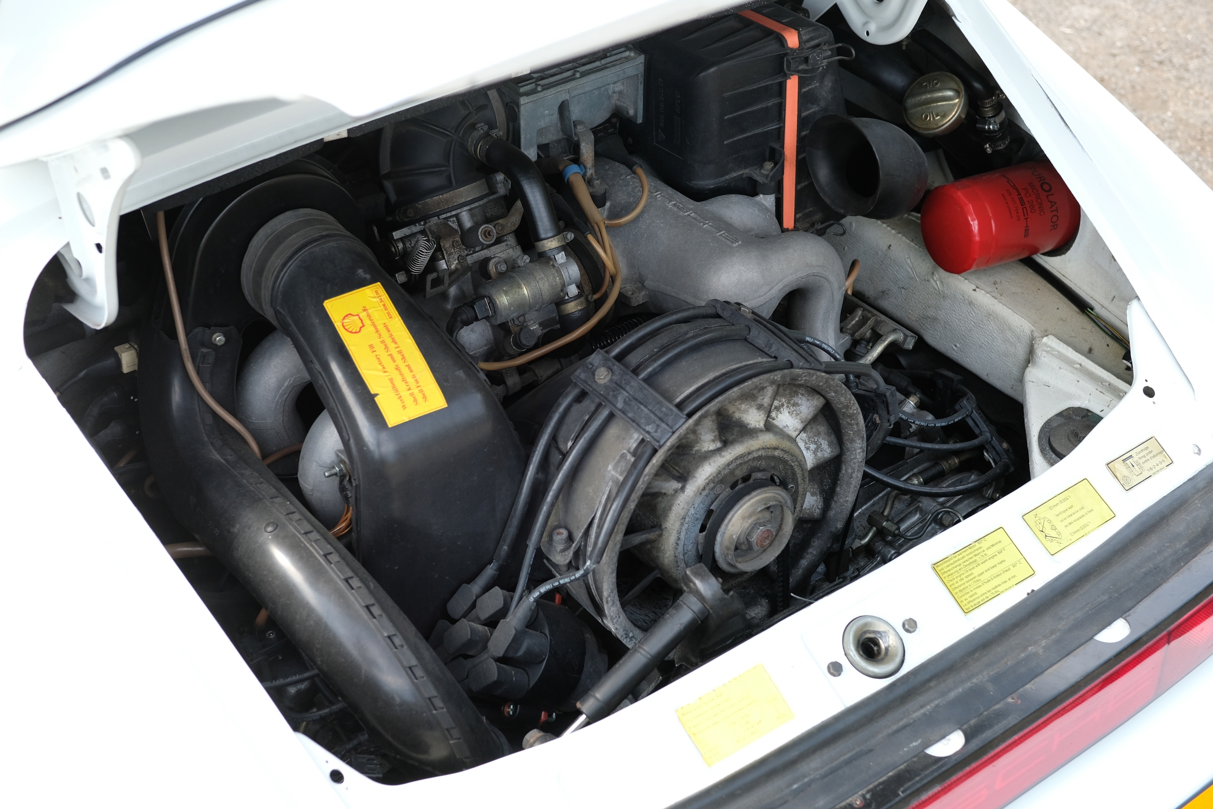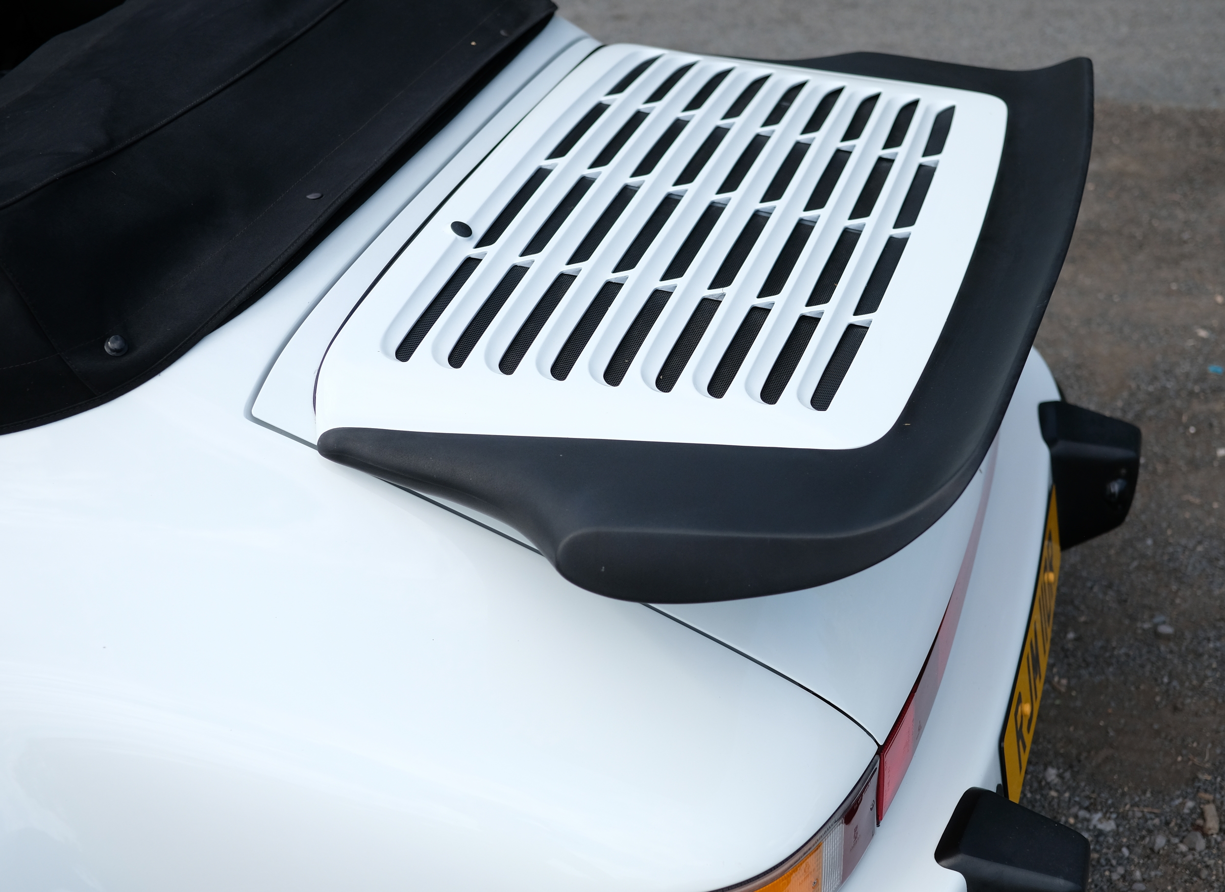 The factory 16-inch Fuchs alloy wheels with black centres and anodised rims remain in excellent condition, paired with front rubber lip spoiler and the signature ‘whale tail’ rear spoiler - a combination that not only completes the period look but also contributes to improved high-speed stability. Inside, the car features factory leather/cloth sports seats, black leather door cards, and original black carpets. The black canvas hood remains in good condition with only light creasing from stowage, and has reportedly never been used by the vendor, with the car exclusively used in dry conditions.