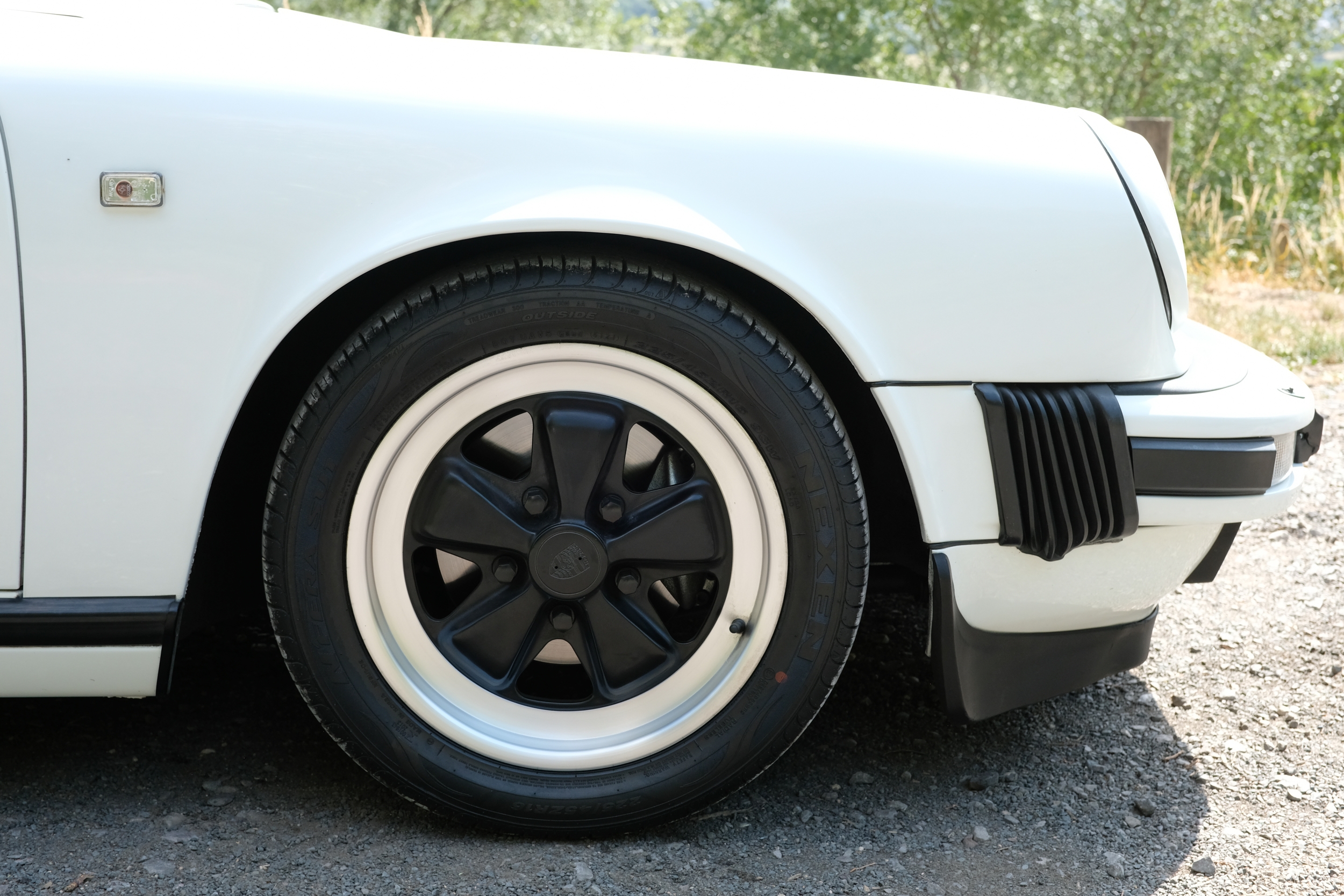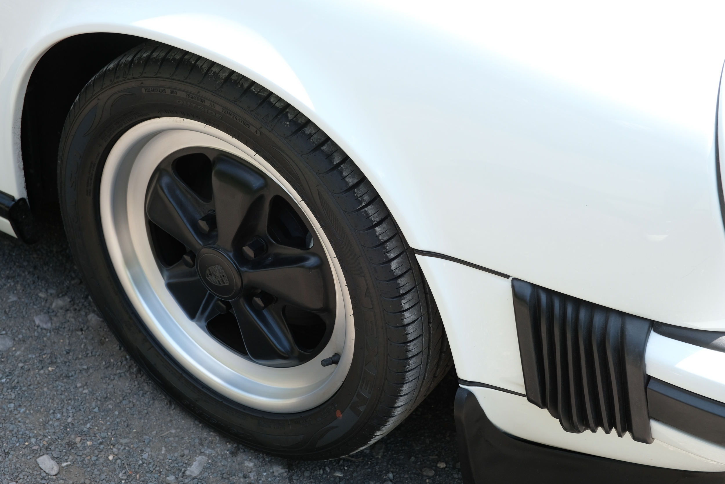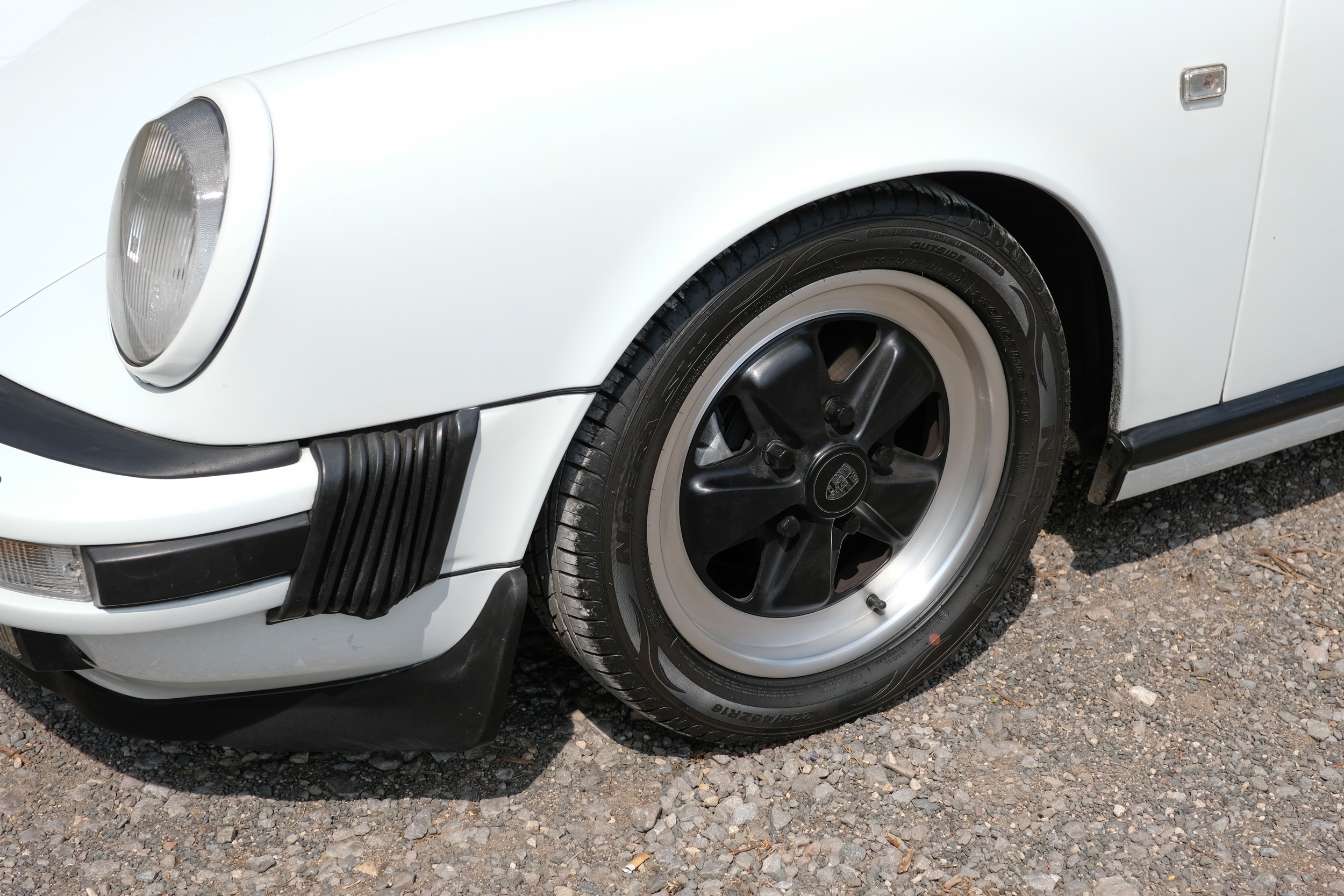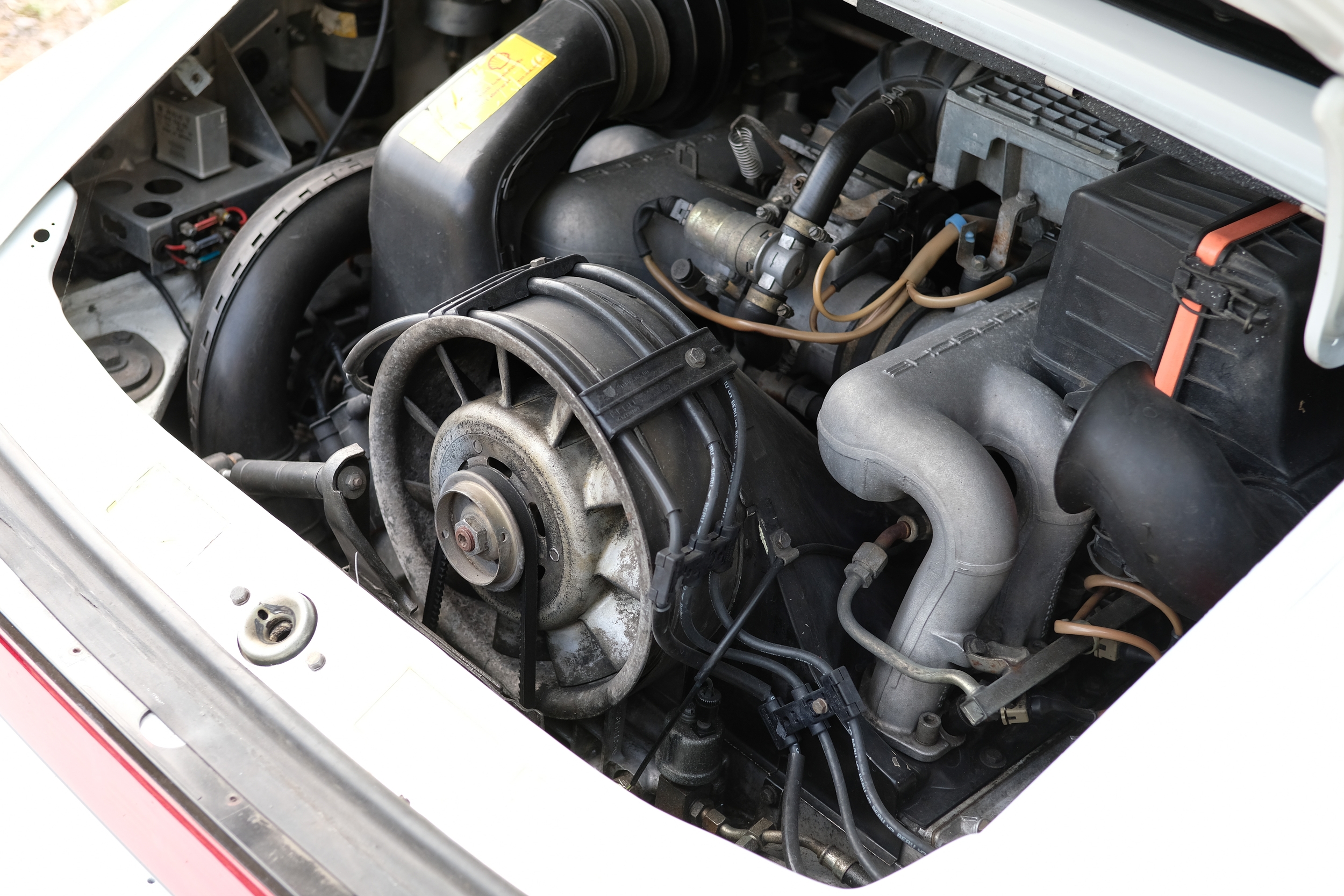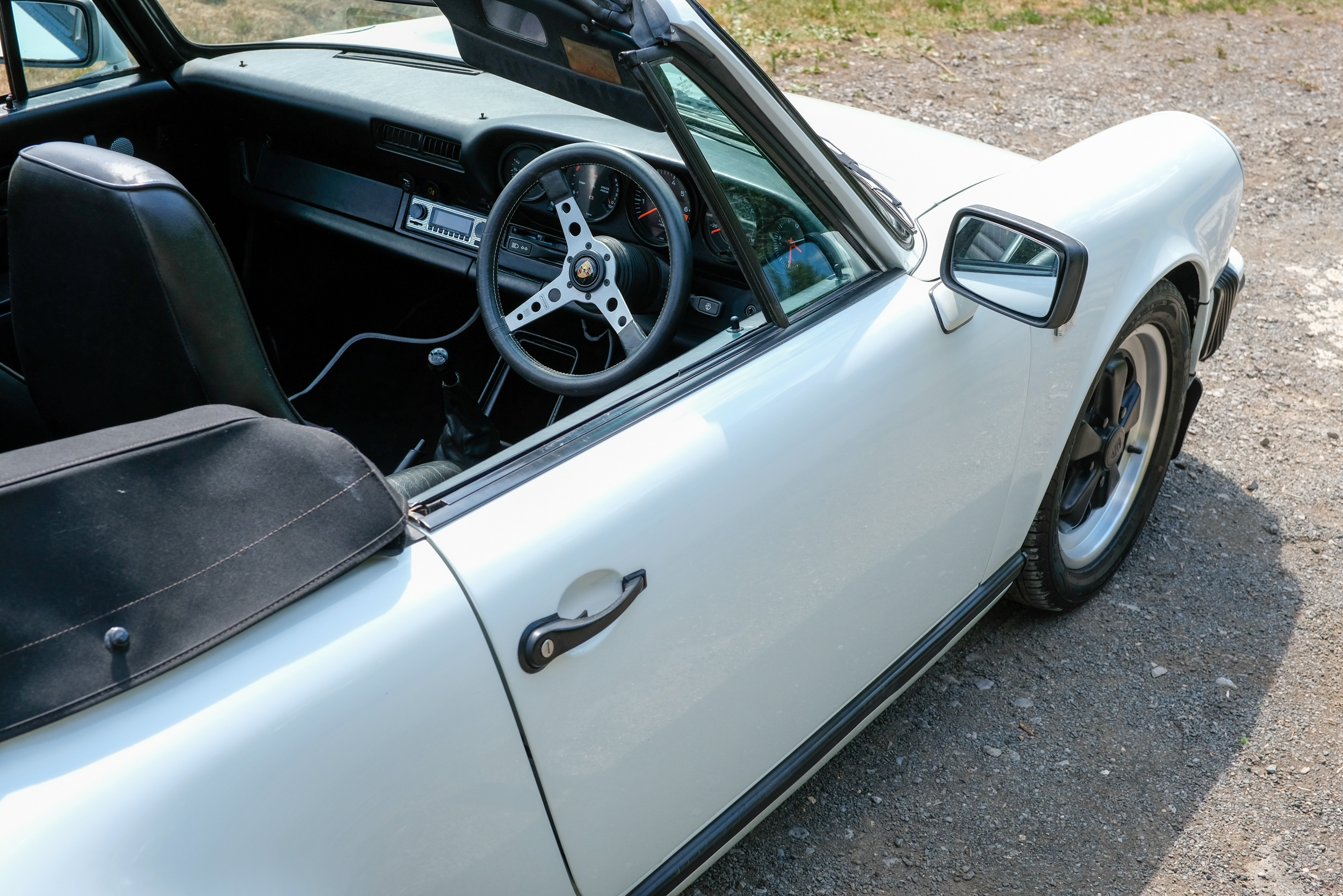 The factory 16-inch Fuchs alloy wheels with black centres and anodised rims remain in excellent condition, paired with front rubber lip spoiler and the signature ‘whale tail’ rear spoiler - a combination that not only completes the period look but also contributes to improved high-speed stability. Inside, the car features factory leather/cloth sports seats, black leather door cards, and original black carpets. The black canvas hood remains in good condition with only light creasing from stowage, and has reportedly never been used by the vendor, with the car exclusively used in dry conditions.