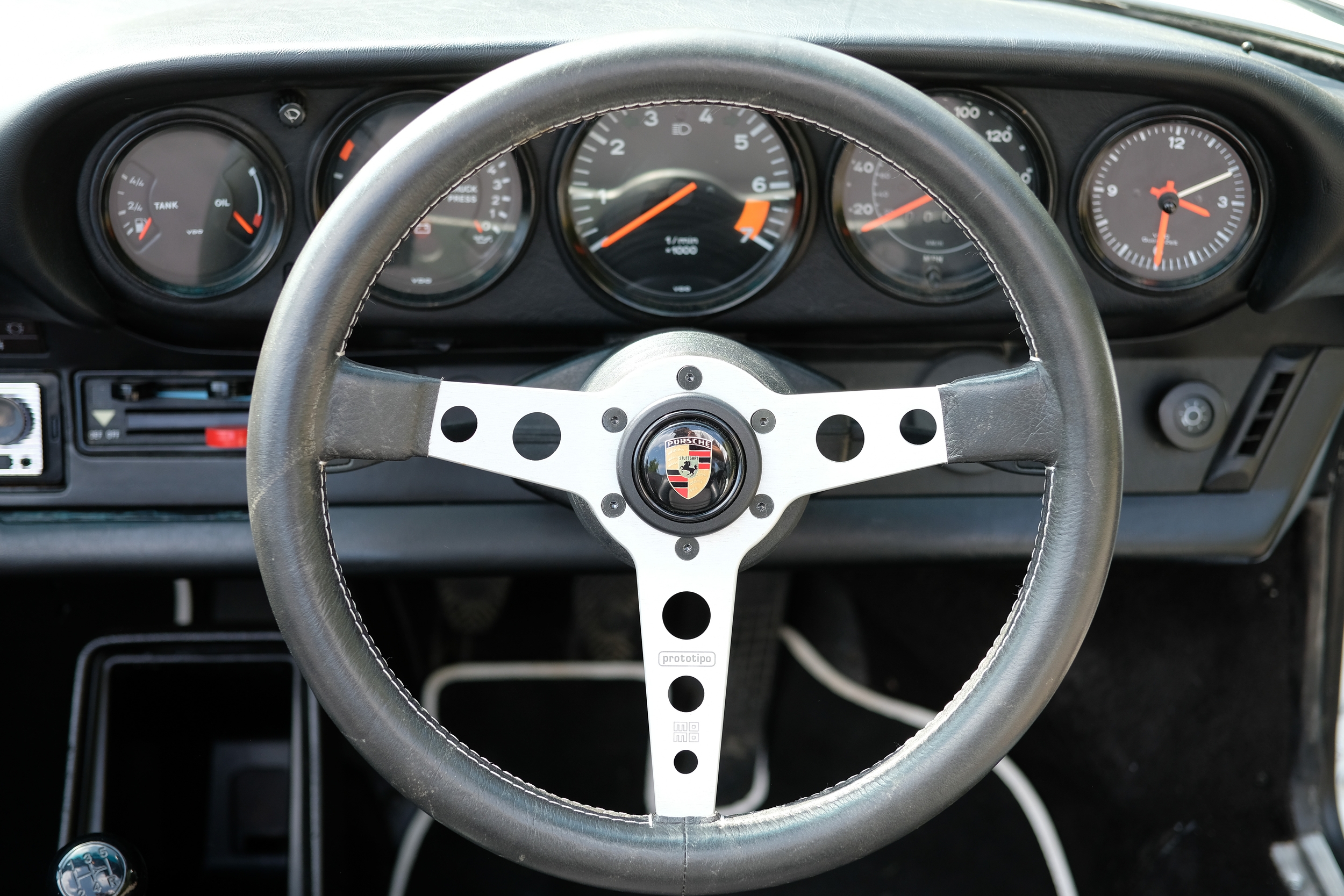 A tasteful Momo Prototipo steering wheel is currently fitted, while the original factory wheel is included in the sale. Additional accessories include an indoor fitted cover.