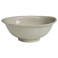 the well potted deep dish fluidly carved to the with a single lotus spray issuing from a leafy stem, covered all over in a translucent ivory-white glaze