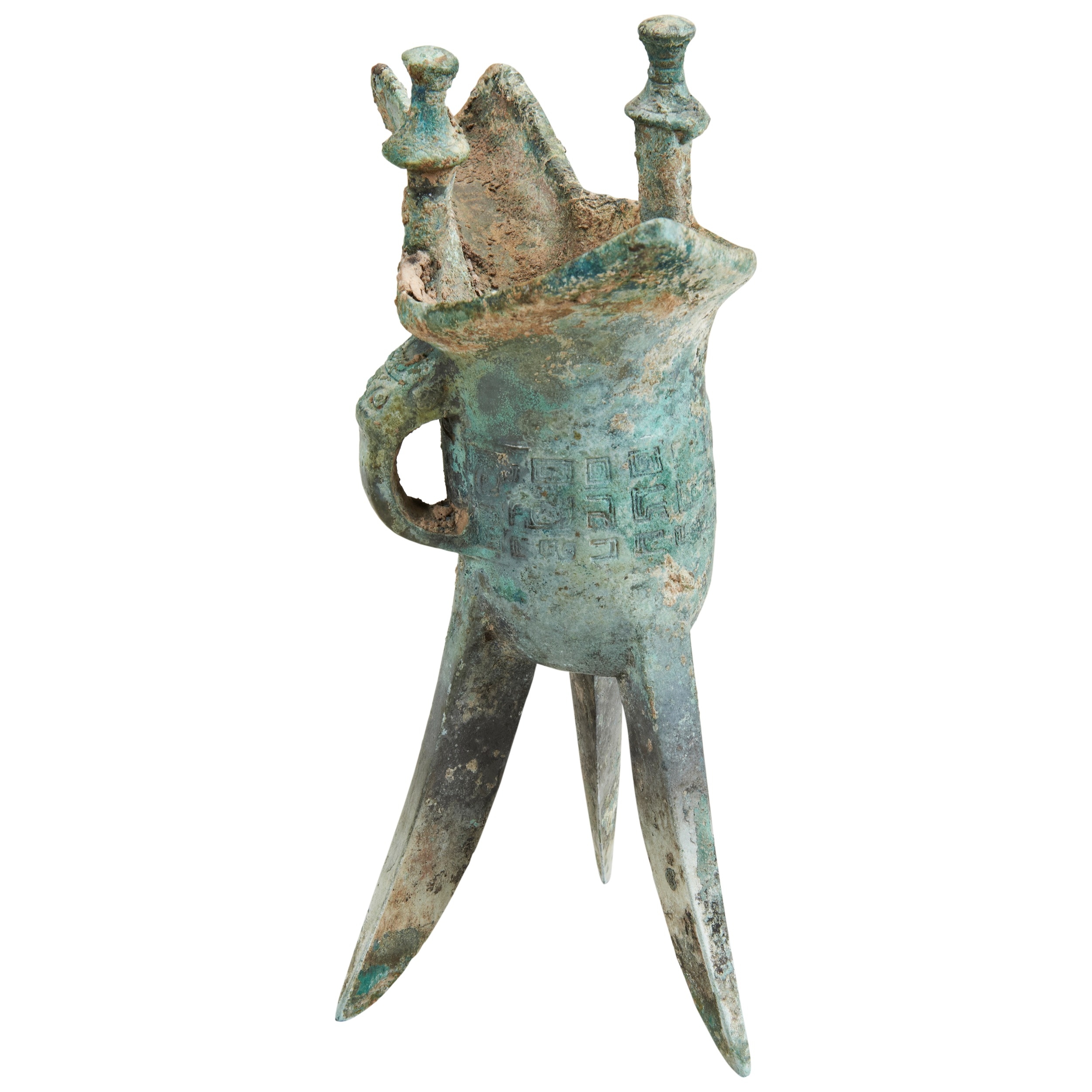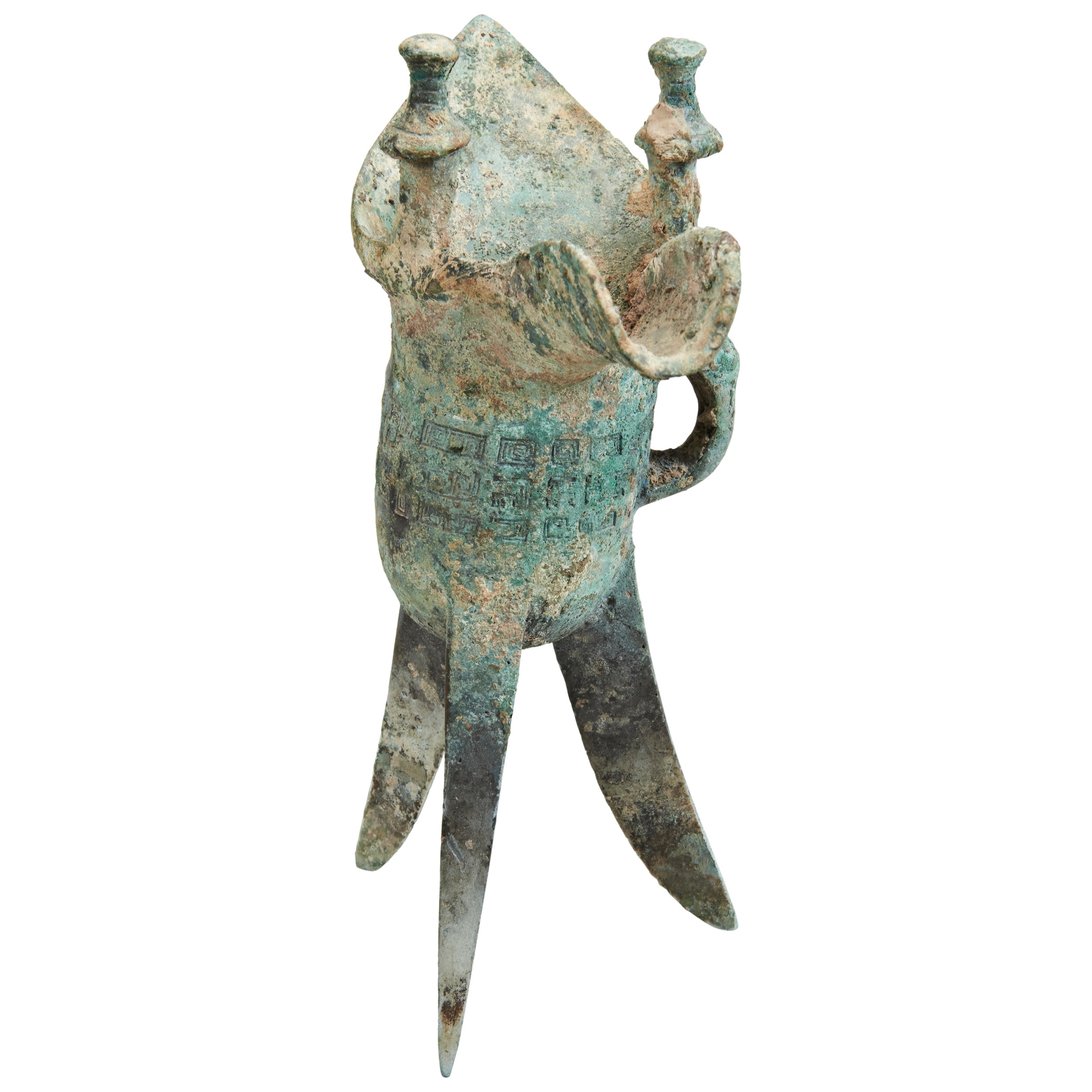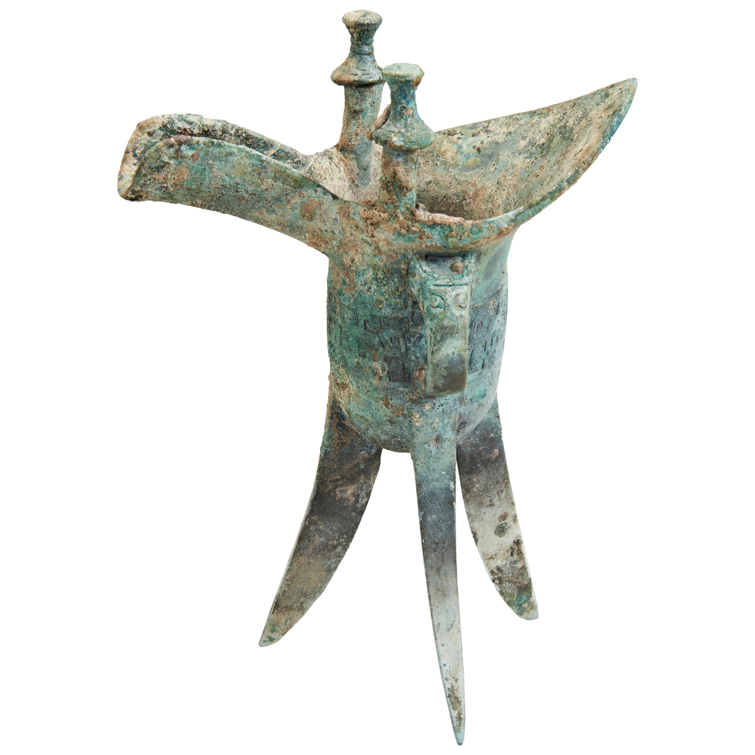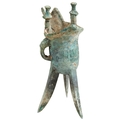 the U-shaped body raised on three tall tapered legs of triangular section and centred by a decorative band stylised geometric band, one side has a loop handle decorated with a taotie mask the lip typically flaring at one end and with a long curving spout between two upright posts