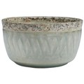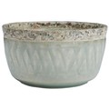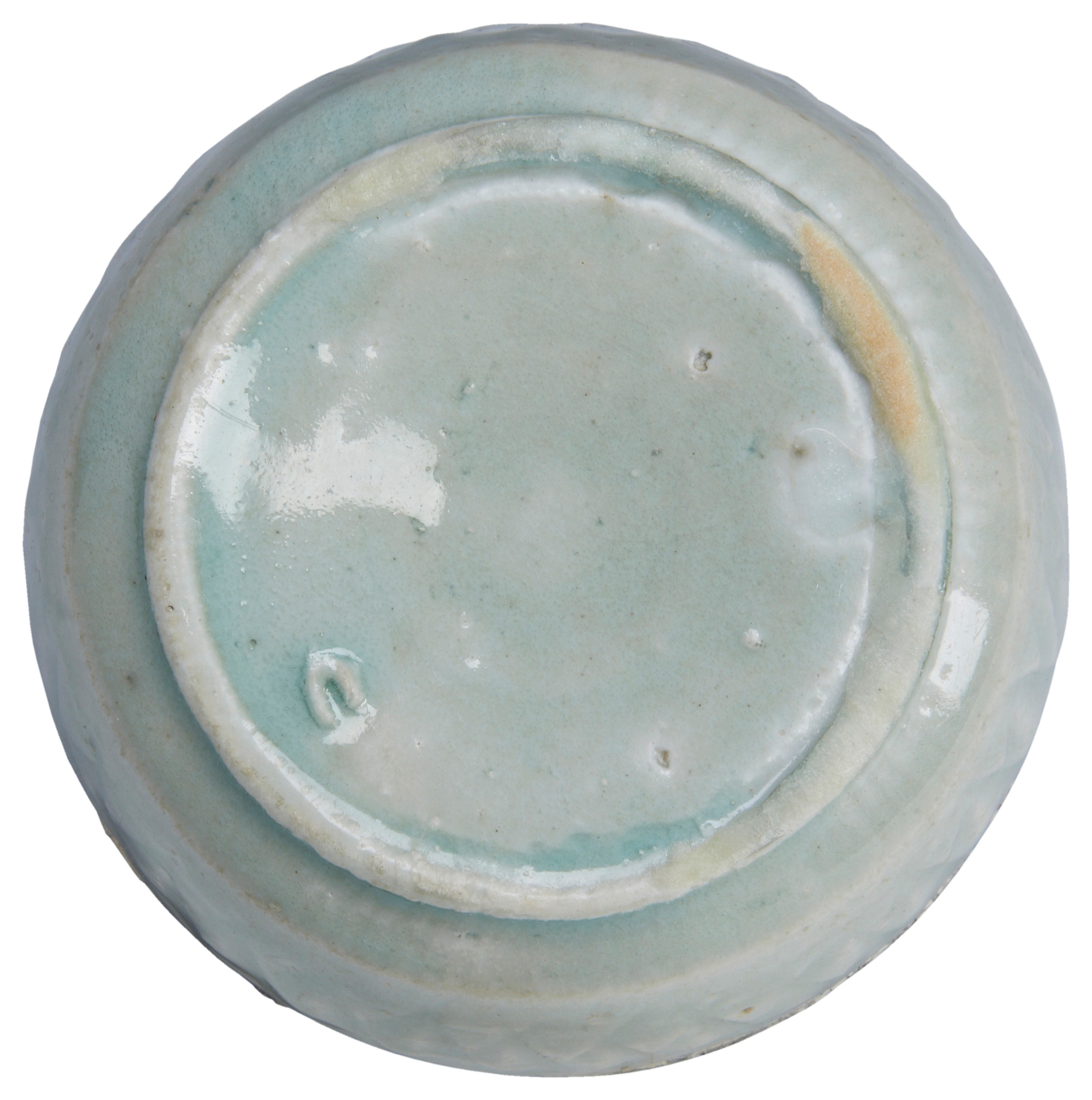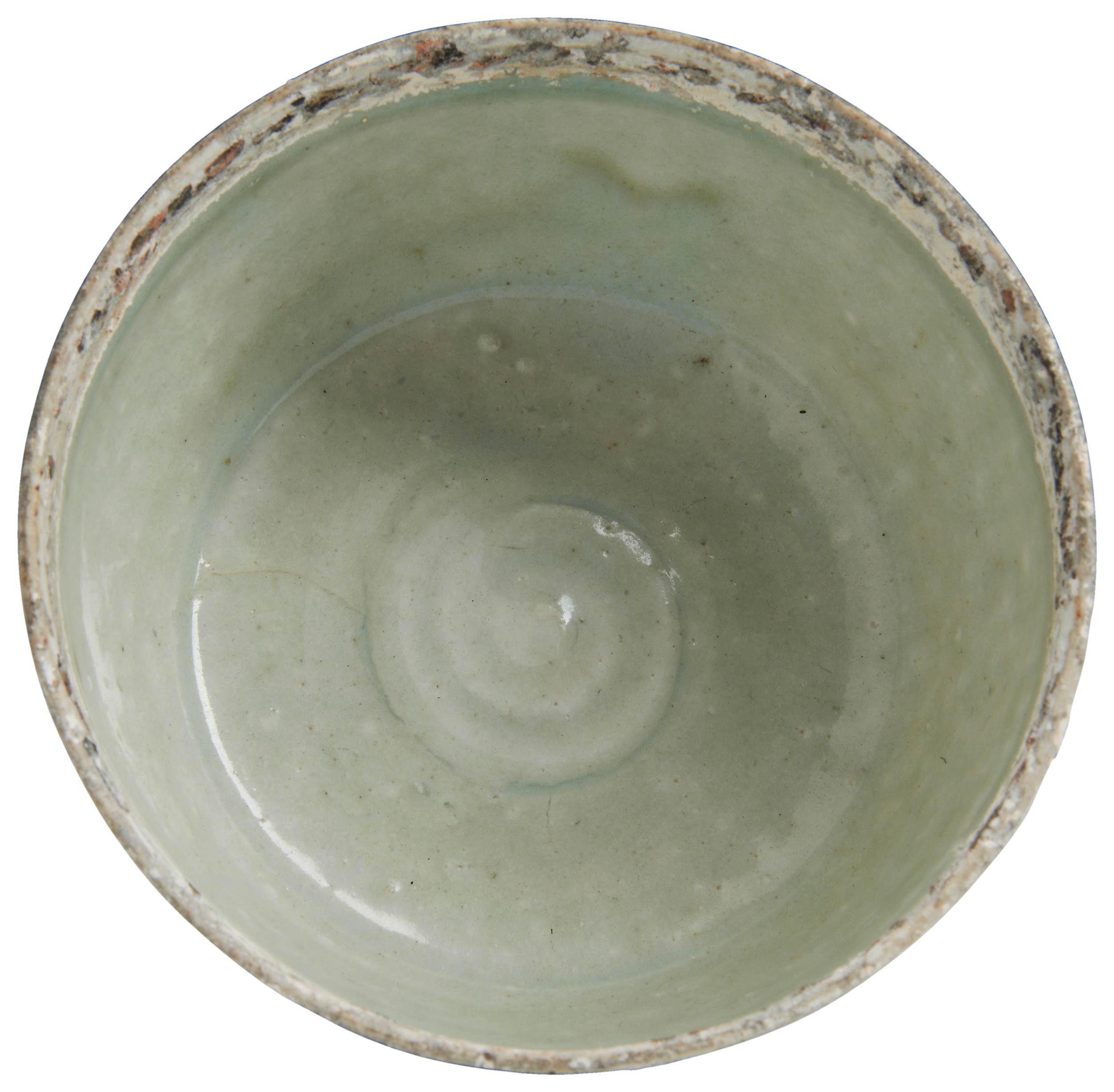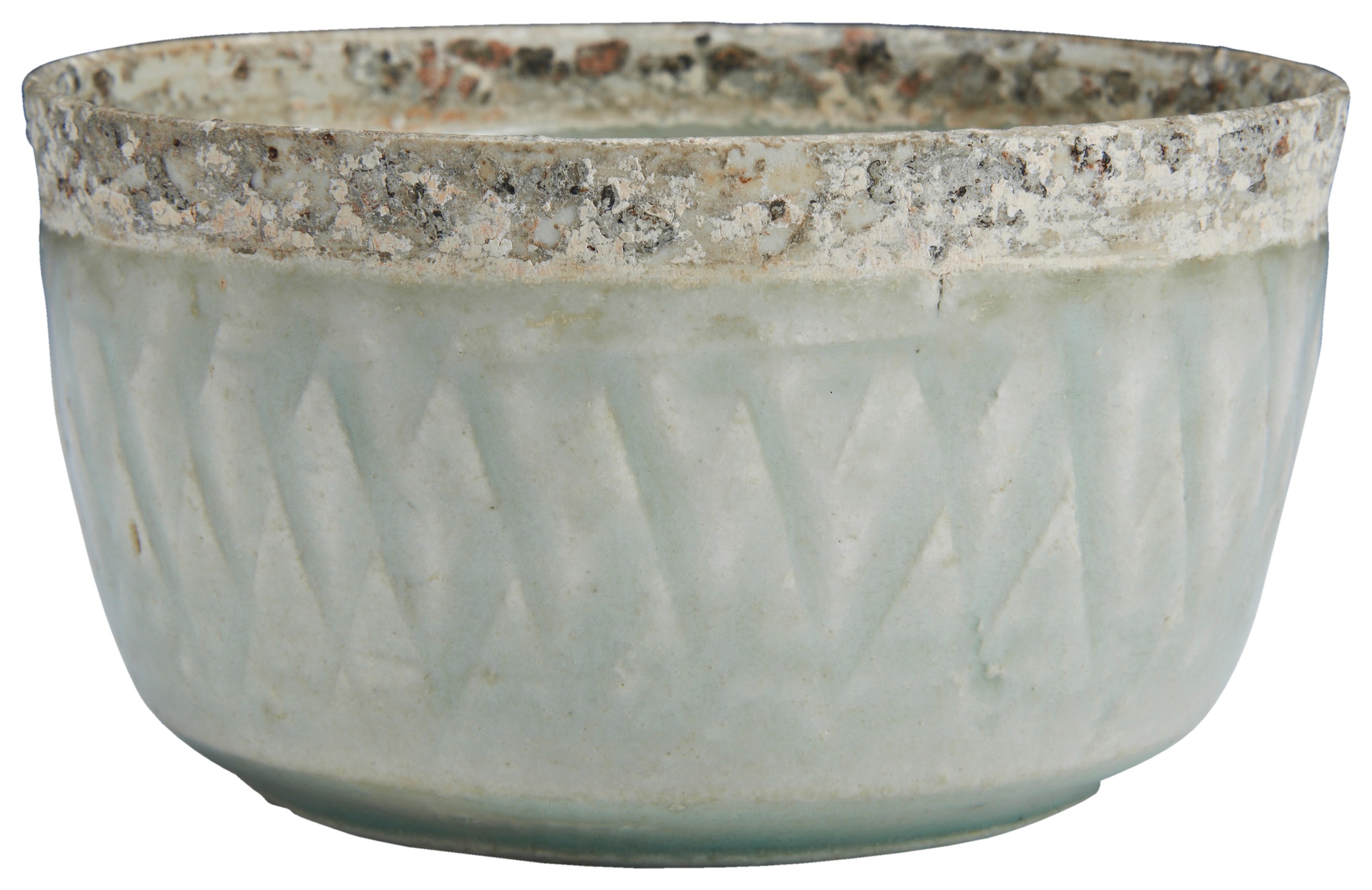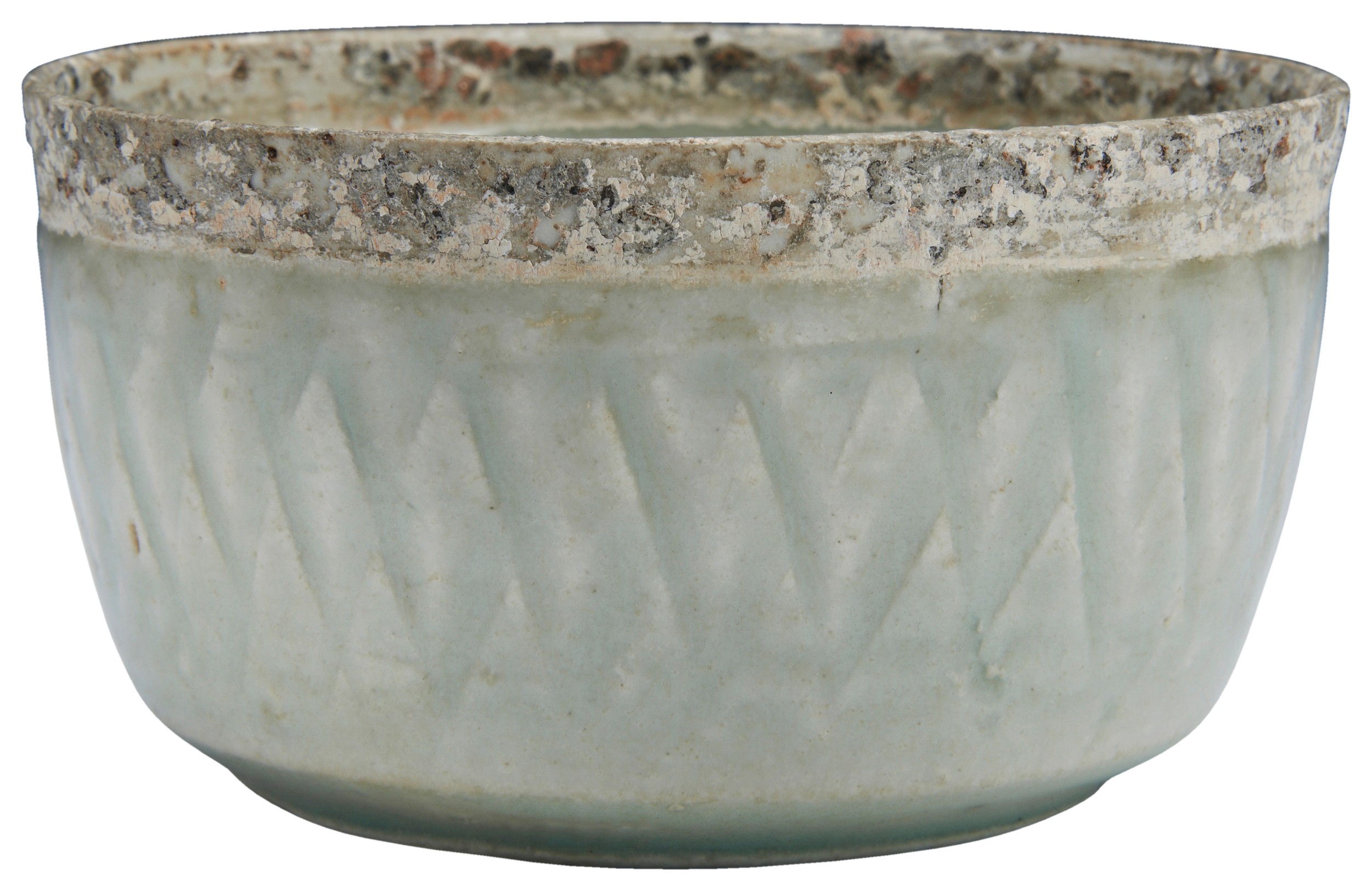 Finely potted with deep rounded sides rising from a slightly countersunk base to a wide mouth rim, the exterior crisply moulded with a continuous band of upright lotus petals, covered overall with a translucent pale bluish glaze pooling attractively in the recessed areas, the midsection showing traces of an original silver rim, now probably corroded