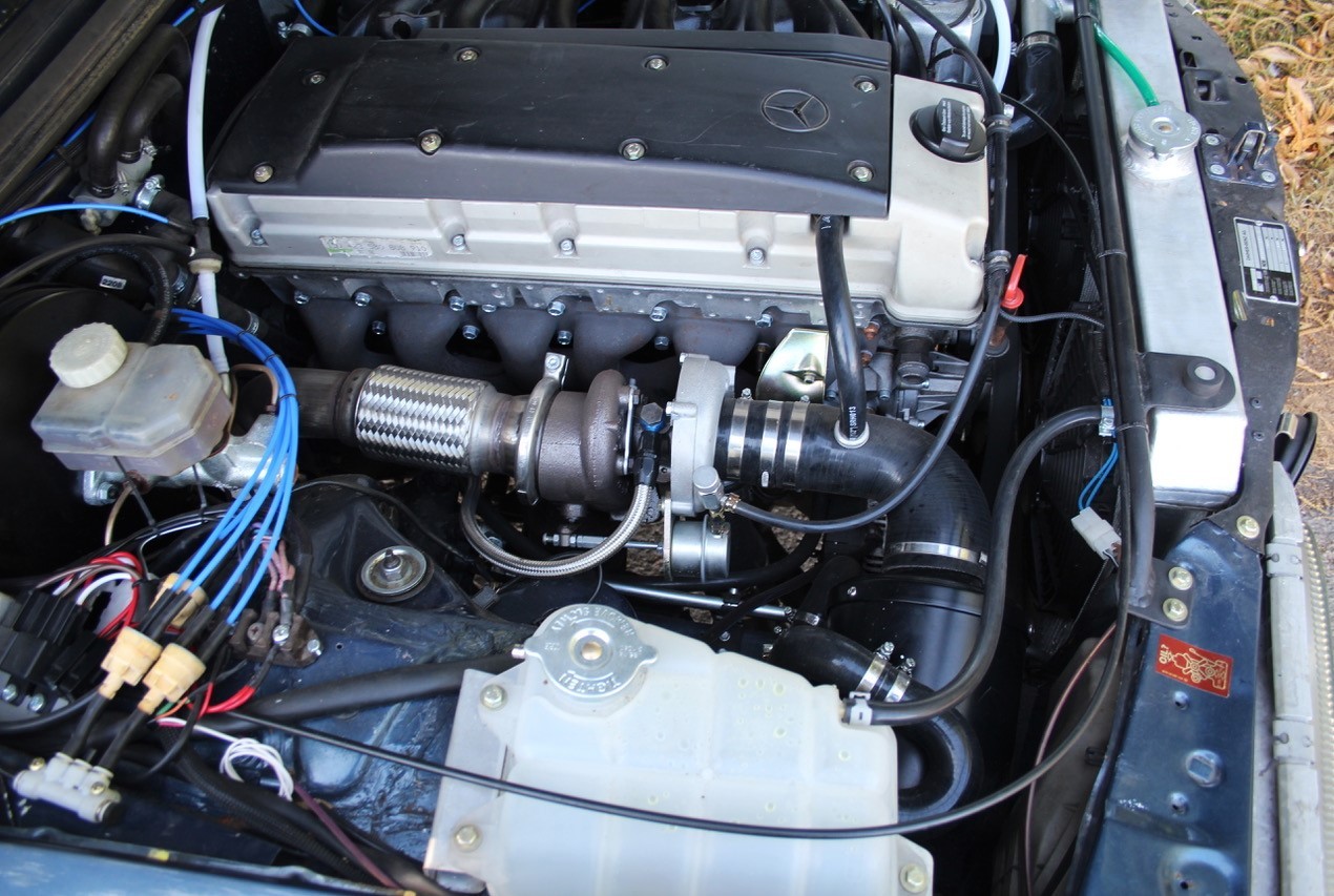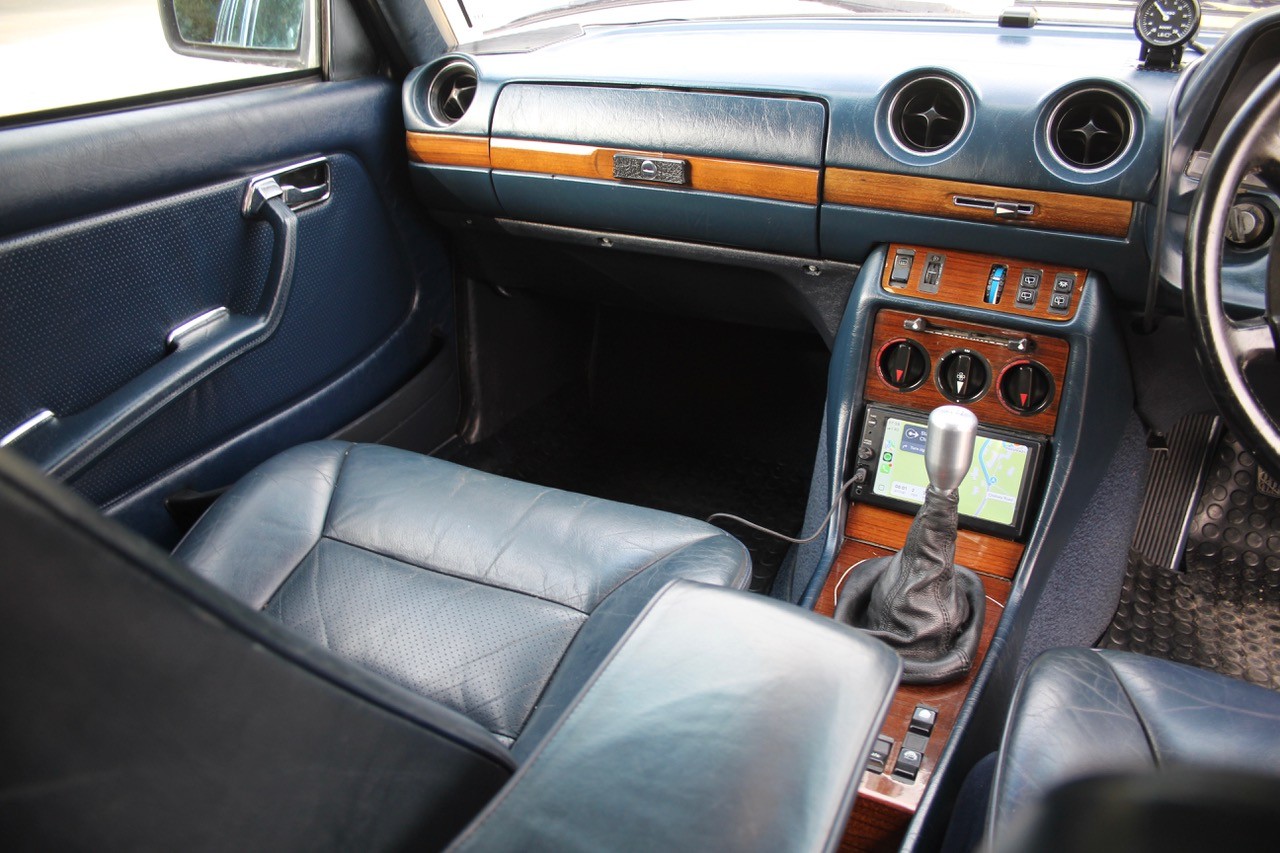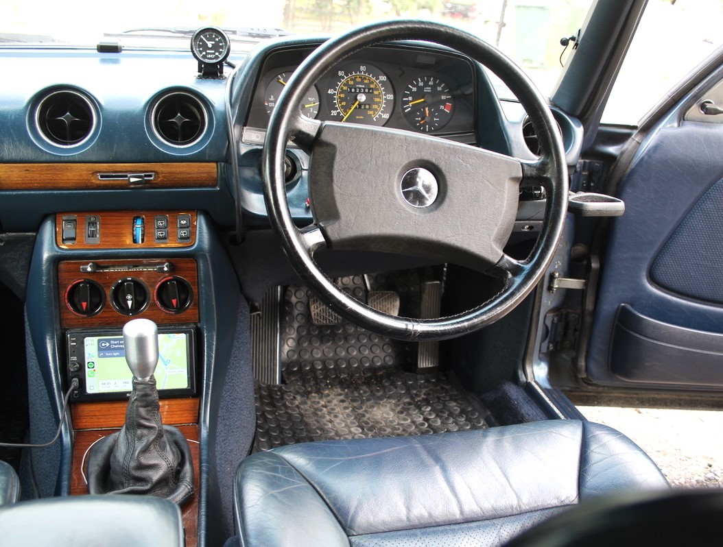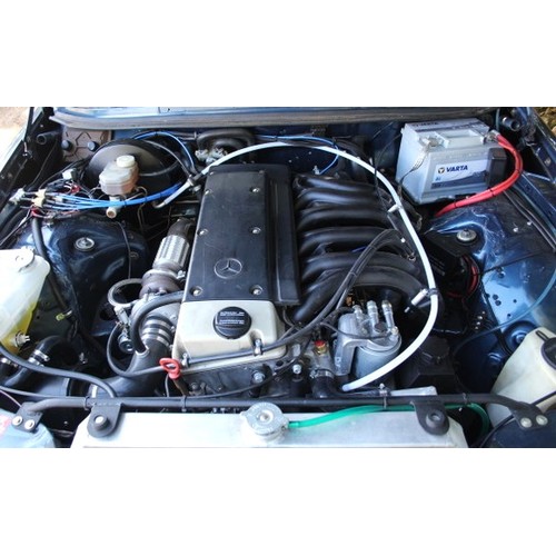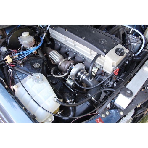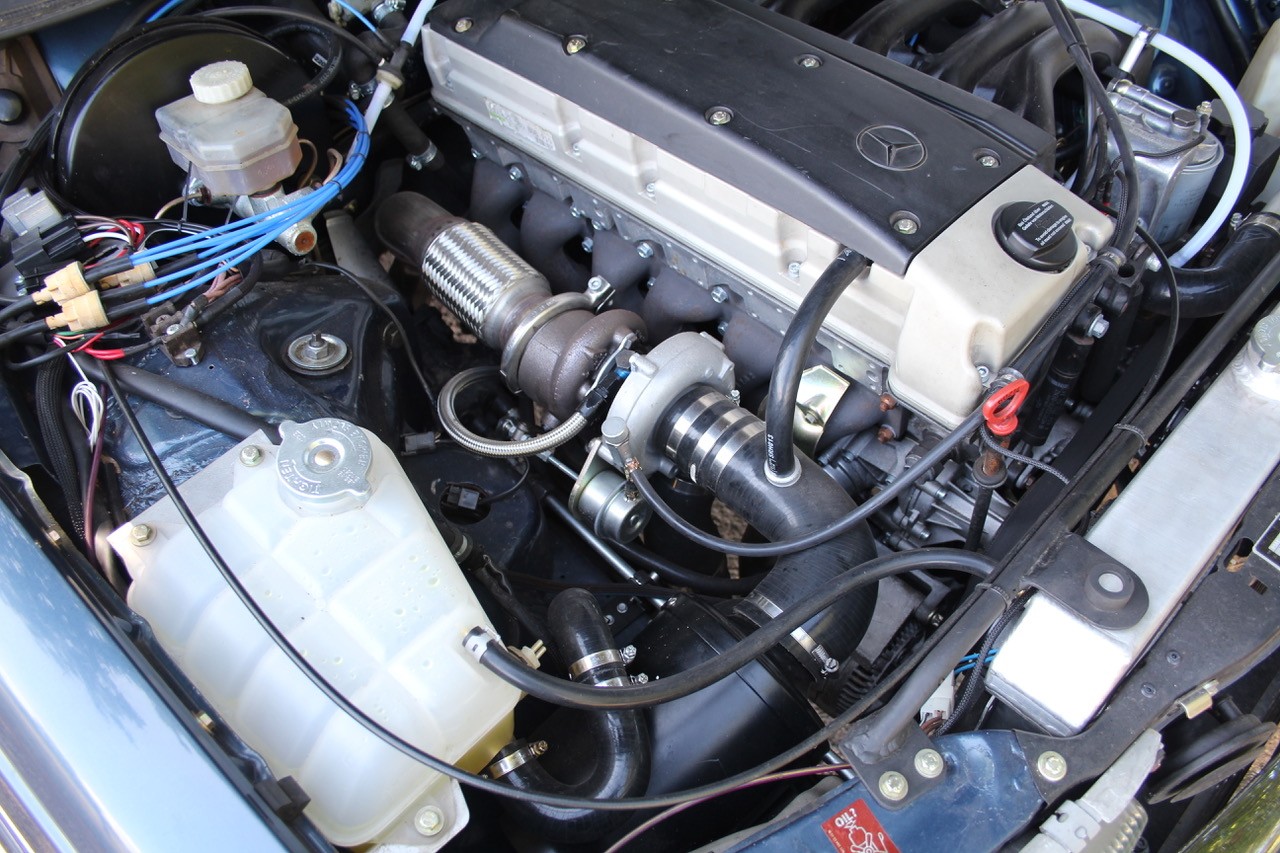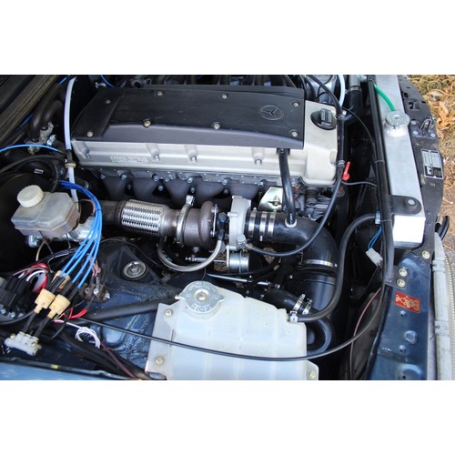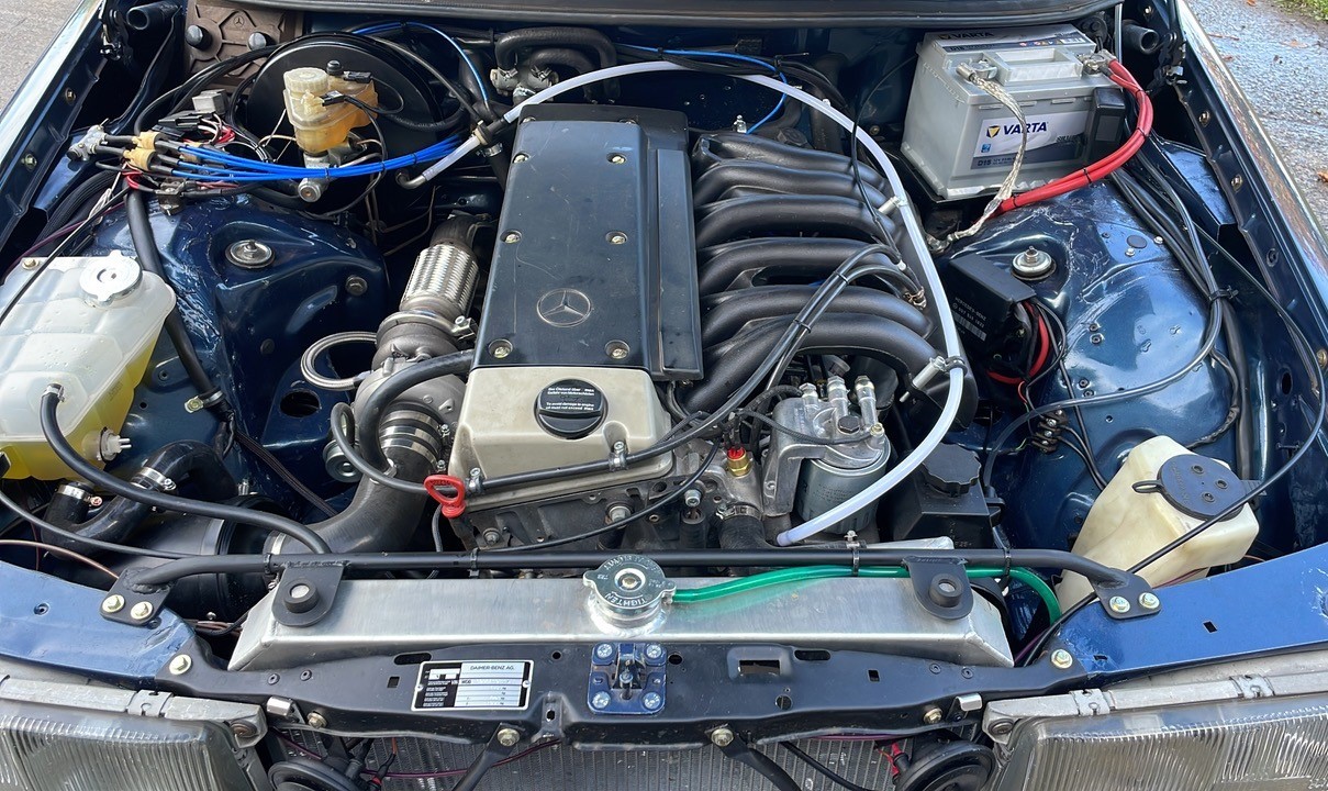The original 2.8 litre petrol engine was removed and replaced with a 3 litre Mercedes-Benz OM 606 TD unit (with a low 70,000 miles recorded), mated to a 6-speed manual Mercedes-Benz gearbox, new flywheel and clutch. A custom-made stainless exhaust is fitted, as is an intercooler system with custom aluminium radiator and twin electric fans to keep things cool. Power and running is improved with a new 7.5 mm Dieselmeken pump and hybrid turbo, and all new ancillaries. All running gear was restored with new components such as springs, shock absorbers, and bushes. The braking has been improved with larger W126 front discs, and new lines. A replacement fuel tank has been fitted, as have new fuel lines. The original speedometer is fitted still, with a rare factory rev. counter, also a Speedhut GPS unit and Sony double DIN Bluetooth Apple Play stereo. With a 500SL rear axle and high ratio differential, the TE is geared for a top speed of 140 mph, with 70mph at a comfortable 2,000 rpm.