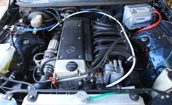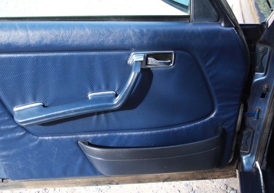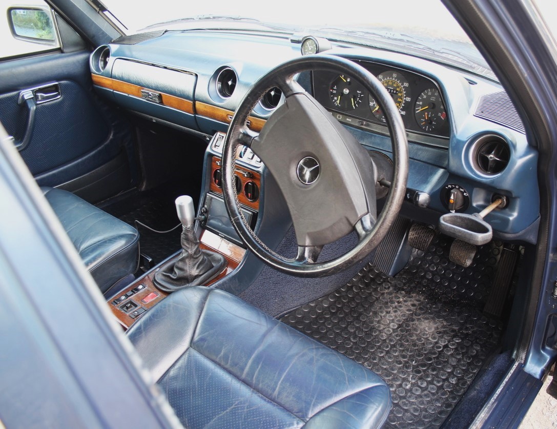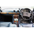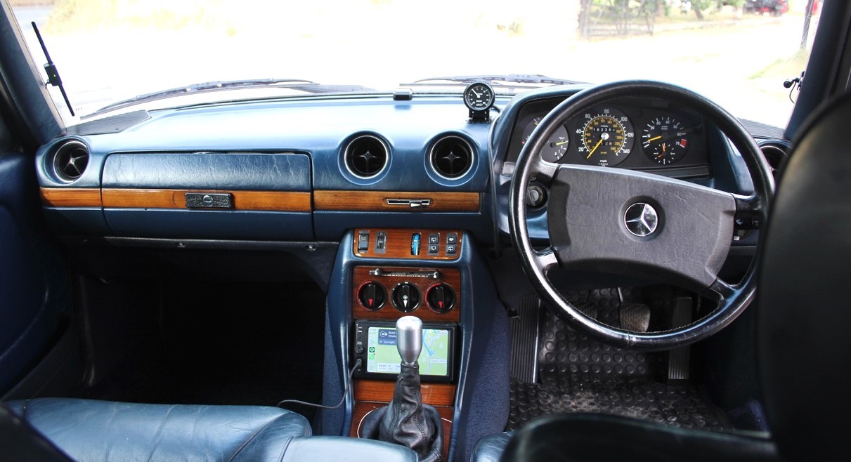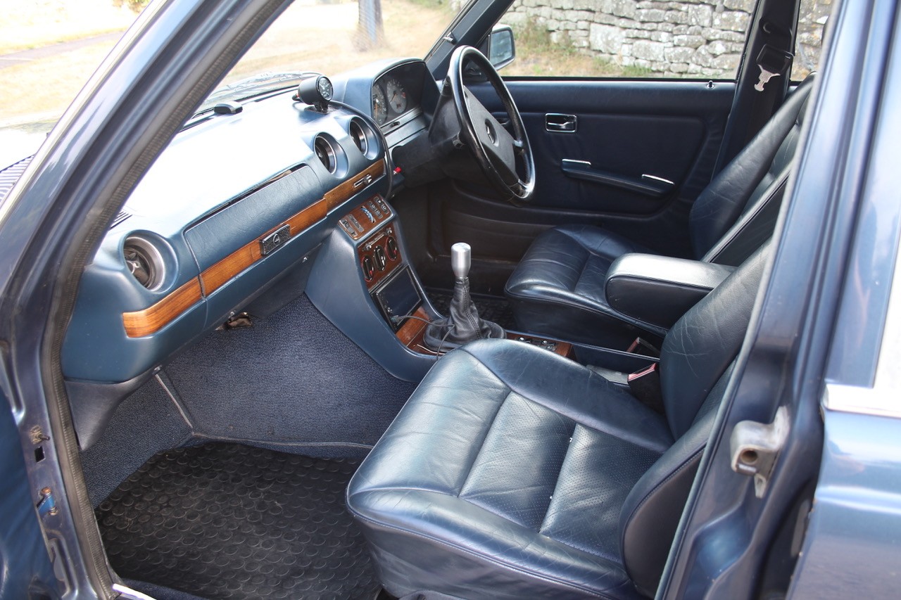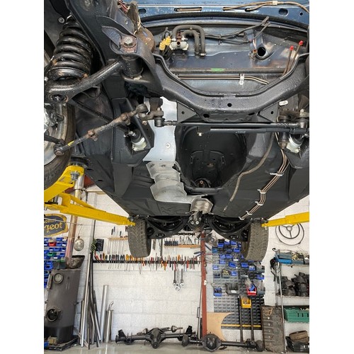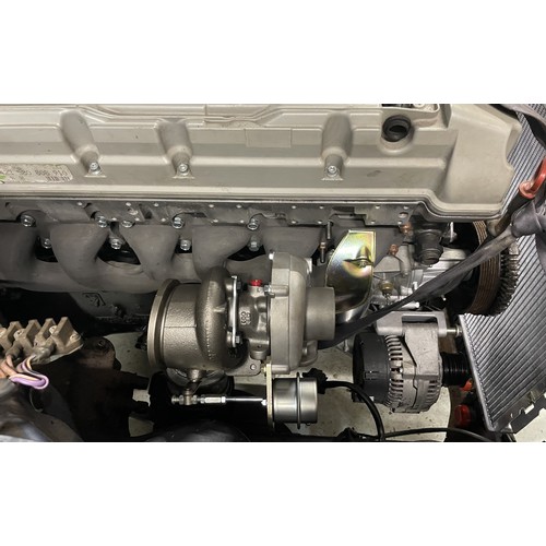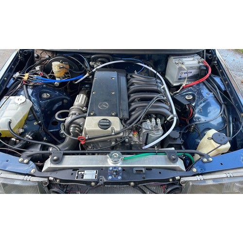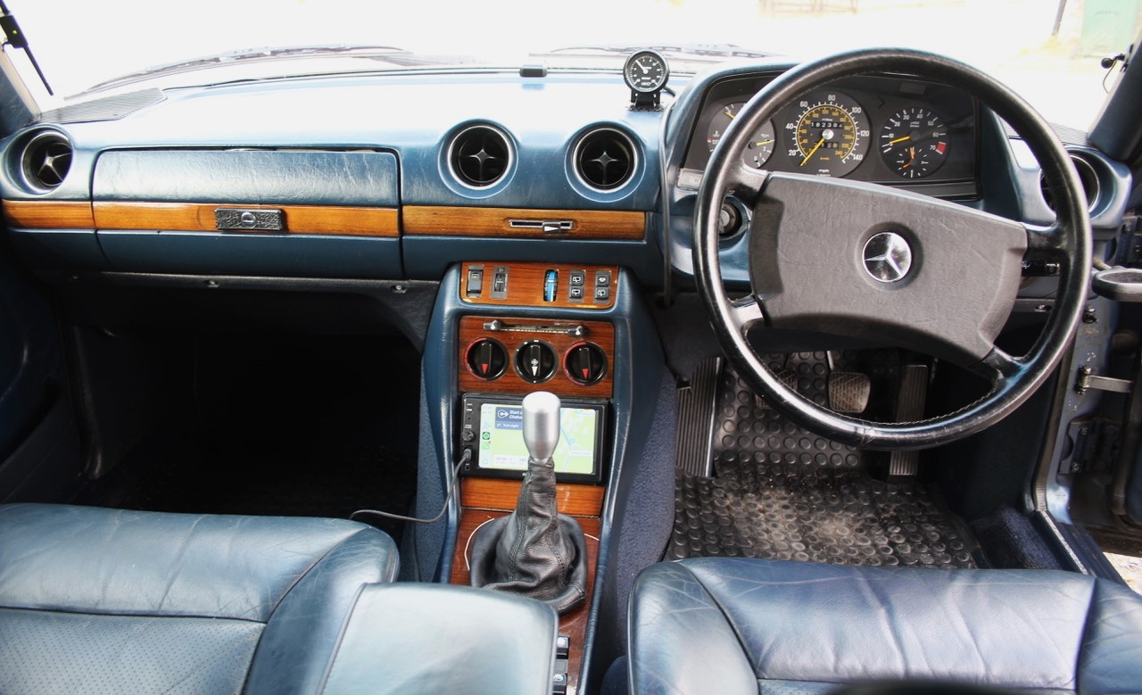 The original 2.8 litre petrol engine was removed and replaced with a 3 litre Mercedes-Benz OM 606 TD unit (with a low 70,000 miles recorded), mated to a 6-speed manual Mercedes-Benz gearbox, new flywheel and clutch. A custom-made stainless exhaust is fitted, as is an intercooler system with custom aluminium radiator and twin electric fans to keep things cool. Power and running is improved with a new 7.5 mm Dieselmeken pump and hybrid turbo, and all new ancillaries. All running gear was restored with new components such as springs, shock absorbers, and bushes. The braking has been improved with larger W126 front discs, and new lines. A replacement fuel tank has been fitted, as have new fuel lines. The original speedometer is fitted still, with a rare factory rev. counter, also a Speedhut GPS unit and Sony double DIN Bluetooth Apple Play stereo. With a 500SL rear axle and high ratio differential, the TE is geared for a top speed of 140 mph, with 70mph at a comfortable 2,000 rpm.